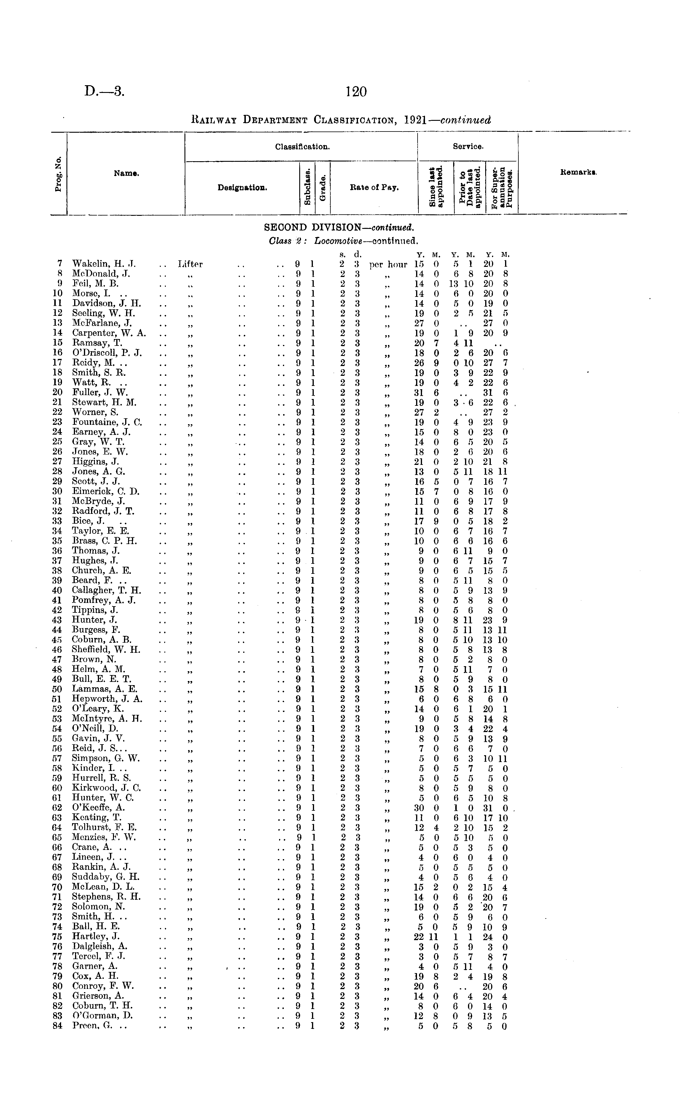 Classification. Service. 6 a CC O fa a Name. Designation. 1 3 X fa 3 O CO Rate of Pay. A-z * IS Z S fa" i S3 .ge-S a a fa f a 533" 1 i a a*, co 3 aj o CO 3 ft fa a fa 3 a a fecja Remarks. SECOND DIVISION— continued. Class 2: Locomotive —continued. 7 Wakelin, H. J, 8 McDonald, J. 9 Feil, M. B. 10 Morse, I. .. 11 Davidson, J. H. 12 Seeling, W. H. 13 McFarlano, J. 14 Carpenter, W. A. 15 Ramsay, T. 16 O'Driseoll, P. J. 17 Roidy, M. .. 18 Smith, S. R. 19 Watt, R. .. 20 Fuller, J. W. 21 Stewart, H. M. 22 Worner, S. 23 Fountaine, J. C 24 Earney, A. J. 25 Gray, W. T. 26 Jones, E. W. 27 Higgins, J. 28 Jones, A. G. 29 Scott, J. J. 30 Eimerick, 0. D. 31 McBryde, J. 32 Radford, J. T. 33 Bice, J. .. 34 Taylor, E. E. 35 Brass, C P. H. 36 Thomas, J. 37 Hughes, J. 38 Church, A. E. 39 Beard, F. .. 40 Callagher, T. H. 41 Pomfrey, A. J. 42 Tippins, J. 43 Hunter, J. 44 Burgess, F. 45 Coburn, A. B. 46 Sheffield, W. H. 47 Brown, N. 48 Helm, A. M. 49 Bull, E. E. T. 50 Lammas, A. E. 51 Hepworth, J. A. 52 O'Leary, K. 53 Mclntyre, A. H. 54 O'Neill, D. 55 Gavin, J. V. 56 Reid, J. S... 57 Simpson, G. W. 58 Kinder, I. .. 59 Hurrell, R. S. 60 Kirkwood, J. 0. 61 Hunter, W. C 62 O'Keeffe, A. 63 Keating, T. 64 Tolhurst, F. E. 65 Menzies, F. W. 66 Crane, A. .. 67 Lineen, J. .. 68 Rankin, A. J. 69 Stiddaby, G. H. 70 McLean, D. L. 71 Stephens, R. H. 72 Solomon, N. 73 Smith, H. .. 74 Ball, H. E. 75 Hartley, J. 76 Dalgleish, A. 77 Tercel, F. J. 78 Garner, A. 79 Cox, A. H. 80 Conroy, F. W. 81 Grierson, A. 82 Coburn, T. H. 83 O'Gorman, D. 84 Preen, G. .. Lifter S. (1. Y. H. Y. M. Y. 11. ..91 23 per hour 15 0 5 1 20 1 . . 9 1 2 3 „ 14 0 6 8 20 8 . . 9 I. 2 3 „ 14 0 13 10 20 8 ..91 23 „ 14 0 6 0 20 0 ..9 1 2 3 „ 14 0 5 0 19 0 ..9 1 2 3 „ 19 0 2 5 21 5 ..91 23 „ 27 0 27 0 ..91 23 „ 19 0 1 9 20 9 ..9 1 2 3 „ 20 7 4 11 ..9 1 2 3 „ 18 0 2 6 20 0 ..9 1 2 3 „ 26 9 0 10 27 7 ..9 1 2 3 „ 19 0 3 9 22 9 ..9 1 2 3 „ 19 0 4 2 22 6 ..9 1 2 3 „ 31 6 .. 31 6 ..91 23 „ 19 0 3 6 22 6 . ..9 1 2 3 „ 27 2 .. 27 2 ..9 1 2 3 „ 19 0 4 9 23 9 ..9 1 2 3 „ 15 0 8 0 23 0 ..9 1 2 3 „ 14 0 6 5 20 5 ..91 23 „ 18 0 2 6 20 6 ..91 23 „ 21 0 2 10 21 8 ..9 1 2 3 „ 13 0 5 11 18 11 ..9 1 2 3 „ 16 5 0 7 16 7 ..9 1 2 3 „ 15 7 0 8 16 0 ..9 1 2 3 „ 11 0 6 9 17 9 ..9 1 2 3 „ 11 0 6 8 17 8 ..9 1 2 3 „ 17 9 0 5 18 2 ..9 1 2 3 „ 10 0 6 7 16 7 ..9 1 2 3 „ 10 0 6 6 16 6 ..9 1 2 3 „ 9 0 0 11 9 0 ..9 1 2 3 „ 9 0 6 7 15 7 ..9 1 2 3 „ 9 0 6 5 15 5 ..9 1 2 3 „ 8 0 5 11 8 0 ..9 1 2 3 „ 8 0 5 9 13 9 ..9 1 2 3 „ 8 0 5 8 8 0 ..9 1 2 3 „ 8 0 5 6 8 0 ..91 23 „ 19 0 8 11 23 9 ..9 1 2 3 „ 8 0 5 11 13 11 ..9 1 2 3 „ 8 0 5 10 13 10 ..9 1 2 3 „ 8 0 5 8 13 8 ..91 23 „ 80528 0 ..9 1 2 3 „ 7 0 5 11 7 0 ..91 23 „ 80598 0 ..9 1 2 3 „ 15 8 0 3 15 11 ..9 1 2 3 „ 6 0 6 8 6 0 ..9 1 2 3 „ 14 0 6 1 20 1 ..9 1 2 3 „ 9 0 5 8 14 8 ..91 23 „ 19 0 3 4 22 4 ..9 1 2 3 „ 8 0 5 9 13 9 ..9 1 2 3 „ 7 0 6 6 7 0 ..9 1 2 3 „ 5 0 0 3 10 11 ..9 1 2 3 „ 5 0 5 7 5 0 ..9 1 2 3 „ 5 0 5 5 5 0 ..9 1 2 3 „ 8 0 5 9 8 0 ..9 1 2 3 „ 5 0 6 5 10 8 ..9 1 2 3 „ 30 0 1 0 31 0 ..9 1 2 3 „ 11 0 6 10 17 10 ..9 1 2 3 „ 12 4 2 10 15 2 ..9 1 2 3 „ 5 0 5 10 5 0 ..9 1 2 3 „ 5 0 5 3 5 0 ..91 2 3 „ 406040 ..91 23 „ 505550 ..91 23 „ 40564 0 ..9 1 2 3 „ 15 2 0 2 15 4 ..9 1 2 3 „ 14 0 6 6 20 6 ..9 1 2 3 „ 19 0 5 2 20 7 ..9 1 2 3 „ 6 0 5 9 6 0 ..9 1 2 3 „ 5 0 5 9 10 9 ..9 1 2 3 „ 22 11 1 1 24 0 ..9 1 2 3 „ 3 0 5 9 3 0 ..9 1 2 3 „ 3 0 5 7 8 7 ..9 1 2 3 „ 4 0 5 11 4 0 ..9 1 2 3 „ 19 8 2 4 19 8 ..9 1 2 3 „ 20 6 .. 20 6 ..9 1 2 3 „ 14 0 6 4 20 4 ..9 1 2 3 „ 8 0 6 0 14 0 ..9 1 2 3 „ 12 8 0 9 13 5 ..9 1 2 3 „ 5 0 5 8 5 0