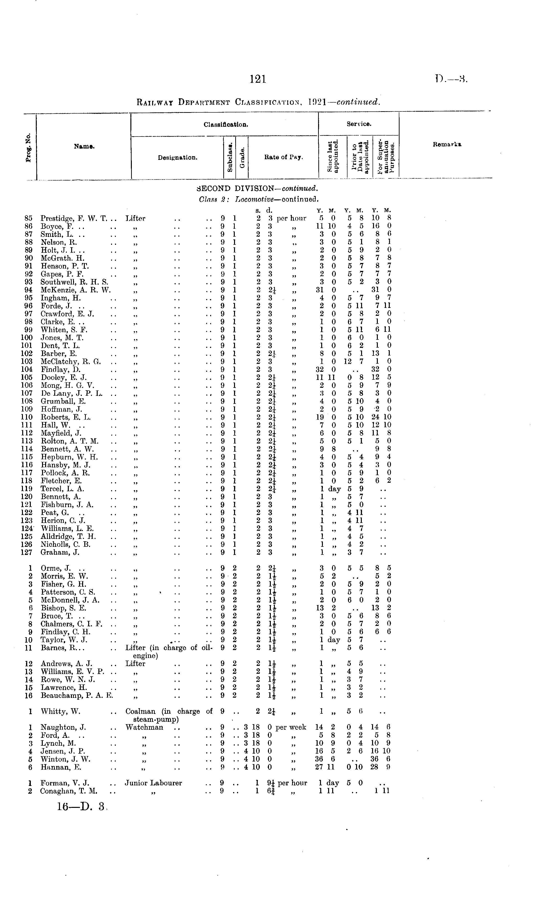 Classification. Service. o 55 ti Name. o C A d 55 DC o Name. "•3 *»rr, U a • Designation. o H Rate of Pay. g-g OS'S co 3 g, Designation. 03 Rate of Pay. Remark* SECOND DIVISION— continued. Class 2: Locomotive —continued. 85 Prestidge, F. W. T. .. 86 Boyce, P. 87 Smith, L. .. 88 Nelson, R. 89 Holt, J. I. .. 90 McGrath. H. 91 Henson, P. T. 92 Gapes, P. F. 93 Southwell, R. H. S. 94 McK.enzie, A. R. W. 95 Ingham, H. 96 Forde, J. .. 97 Crawford, E. J. 98 Clarke, E. 99 Whiten, S. F. .00 Jones, M. T. l01 Dent, T. L. .02 Barber, E. 103 McClatchy, R. G. 104 Findlay, D. 105 Dooley, E. J. 106 Mong, H. G. V. [07 De Lany, J. P. L. .. 108 Grumball, E. L09 Hoffman, J. .10 Roberts, E. L. Ill Hall, W. .. [12 Mayfield, J. 113 Rolton, A. T. M. 114 Bennett, A. W. 115 Hepburn, W. H. 116 Hansby, M. J. 117 Pollock, A. R. .18 Fletcher, E. .19 Tercel, L. A. .20 Bennett, A. .21 Fish burn, J. A. .22 Peat, G. .. .23 Herion, C. J. 124 Williams, L. E. .25 Alldridge, T. H. .26 Nicholls, C. B. .27 Graham, J. S. (1. Y. M. Y. M. Y. M. Lifter .. ..91 23 per hour 5 0 5 8 10 8 ..91 23 „ 11 10 4 5 10 0 ..9 1 2 3 „ 3 0 5 0 8 6 ..91 23 „ 305181 ..9 1 2 3 „ 2 0 5 9 2 0 ..9 1 2 3 „ 2 0 5 8 7 8 ..9 1 2 3 „ 3 0 5 7 8 7 ..91 23 „ 205777 ..9 1 2 3 „ 3 0 5 2 3 0 ..9 1 2 2,} 81 0 .. 31 0 ..9 1 2 3 „ 4 0 5 7 9 7 ..9 1 2 3 „ 2 0 5 11 7 11 ..9 1 2 3 „ 2 0 5 8 2 0 ..9 1 2 3 „ 10 6 7 10 ..9 1 2 3 „ I 0 5 11 6 11 ..91 23 „ 106010 ..9 1 2 3 „ 10 6 2 10 ..9 1 2 2},, 8 0 5 1 13 1 ..9 1 2 3 „ 1 0 12 7 1 0 ..9 1 2 3 „ 32 0 32 0 ..9 1 2 2] „ 11 11 0 8 12 5 ..9 1 2 2},, 2 0 5 9 7 9 .,91 2 21 305830 ..91 2 21 4 0 5 10 4 0 ..91 2 21 205920 ..91 2 21 „ 19 0 5 10 24 10 ..9 1 2 21 „ 7 0 5 10 12 10 ..9 1 2 21 6 0 5 8 11 8 ..9 1 2 2J 5 0 5 15 0 ..9 1 2 21 „ 9 8 .. 9 8 ..91 2 2-1 405494 ..9 1 2 2| „ 3 0 5 4 3 0 ..91 2 21 105910 ..9 1 2 21 10 5 2 6 2 ..9 1 2 2} „ 1 day 5 9 ..91 23 „ 1 „ 57 ..9 1 2 3 „ 1 „ 5 0 ..9 1 2 3 „ 1 „ 4 11 ..9 1 2 3 „ I „ 4 11 ..91 23 „ 1 „ 4 7 ..9 1 2 3 „ 1 „ 4 5 ..91 23 „ 1 „ 4 2 ..9 1 2 3 „ 1 „ 3 7 1 Orme, J. .. 2 Morris, E. W. 3 Fisher, G. H. 4 Patterson, C. S. 5 McDonnell, J. A. 6 Bishop, S. E. 7 Bruce, T. .. 8 Chalmers, C. I. P. . . 9 Findlay, C. H. 10 Taylor, W. J. 11 Barnes, R... 12 Andrews, A. J. 13 Williams, E. V. P. . . 14 Rowe, W. N. J. 15 Lawrence, H. 16 Beauchamp, P. A. E. ..9 2 2 2} „ 3 0 5 5 8 5 ..92 21' „ 52 .. 52 ..9 2 2 14 „ 2 0 5 9 2 0 ... ..9 2 2 1J „ 10 5 7 10 ..9 2 2 14 2 0 6 0 2 0 ..9 2 2 H „ 13 2 13 2 ..9 2 2 14 : ,; 3 0 5 6 8 6 ..9 2 2 l| „ 2 0 5 7 2 0 ..9 2 2 1| 10 5 6 6 6 ..9 2 2 14 „ I day 5 7 Lifter (in charge of oil- 9 2 2 l| „ 1 „ 5 6 engine) Lifter .. ..9 2 2 14. „ 1 „ 5 5 ..9 2 2 14 „ 1 „ 4 9 ..9 2 2 14 „ 1 „ 3 7 ..9 2 2 1J „ 1 „ 3 2 ..9 2 2 l| „ 1 „ 3 2 1 Whitty, W. 1 Naughton, J. 2 Ford, A. .. 3 Lynch, M. 4 Jensen, J. P. 5 Winton, J. W. 6 Hannan, E. Coalman (in charge of 9 .. 2 2} „ 1 „ 5 6 steam-pump) Watchman .. .. 9 .. 3 18 0 per week 14 2 0 4 14 6 .. 9 .. 3 18 0 „ 5 8 2 2 5 8 .. 9 .. 3 18 0 „ 10 9 0 4 10 9 .. 9 .. 4 10 0 „ 16 5 2 6 16 10 .. 9 .. 4 10 0 „ 36 6 36 6 .. 9 .. 4 10 0 „ 27 11 0 10 28 9 1 Forman, V. J. 2 Conaghan, T. M. Junior Labourer .. 9 .. 19} per hour 1 day 5 0 .. 9 .. 1 6J „ 1 11 .. 1 11