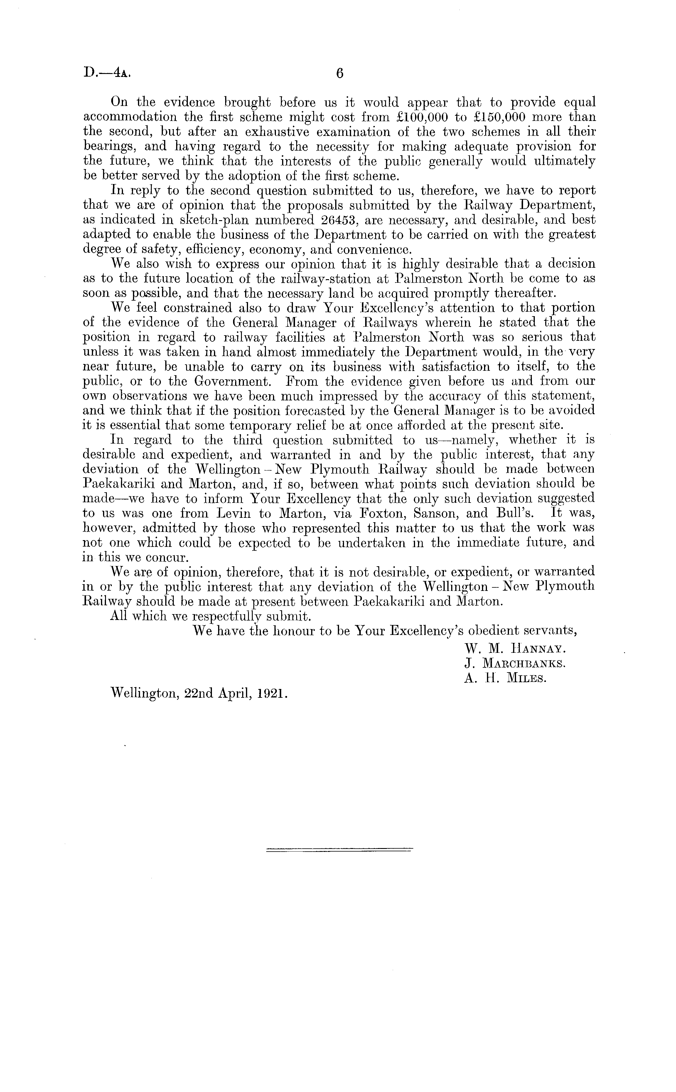 On the evidence brought before us it would appear that to provide equal accommodation the first scheme might cost from £100,000 to £150,000 more than the second, but after an exhaustive examination of the two schemes in all their bearings, and having regard to the necessity for making adequate provision for the future, we think that the interests of the public generally would ultimately be better served by the adoption of the first scheme. In reply to the second question submitted to us, therefore, we have to report that we are of opinion that the proposals submitted by the Railway Department, as indicated in sketch-plan numbered 26453, are necessary, and desirable, and best adapted to enable the business of the Department to be carried on with the greatest degree of safety, efficiency, economy, and convenience. We also wish to express our opinion that it is highly desirable that a decision as to the future location of the railway-station at Palmerston North be come to as soon as possible, and that the necessary land be acquired promptly thereafter. We feel constrained also to draw Your Excellency's attention to that portion of the evidence of the General Manager of Railways wherein he stated that the position in regard to railway facilities at Palmerston North, was so serious that unless it was taken in hand almost immediately the Department would, in the very near future, be unable to carry on its business with satisfaction to itself, to the public, or to the Government. From the evidence given before us and from our own observations we have been much impressed by the accuracy of this statement, and we think that if the position forecasted by the General Manager is to be avoided it is essential that some temporary relief be at once afforded at the present site. In regard to the third question submitted to vs —namely, whether it is desirable and expedient, and warranted in and by the public interest, that any deviation of the Wellington - New Plymouth Railway should be made between Paekakariki and Marton, and, if so, between what points such deviation should be made—we have to inform Your Excellency that the only such deviation, suggested to us was one from Levin to Marton, via Foxton, Sanson, and Bull's. It was, however, admitted by those who represented this matter to us that the work was not one which could be expected to be undertaken in the immediate future, and in this we concur. We are of opinion, therefore, that it is not desirable, or expedient, or warranted in or by the public interest that any deviation of the Wellington - New Plymouth Railway should be made at present between Paekakariki and Marton. All which we respectfully submit. We have the honour to be Your Excellency's obedient servants, W. M. Hannay. J. Marchbanks. A. H. Miles. Wellington, 22nd April, 1921.