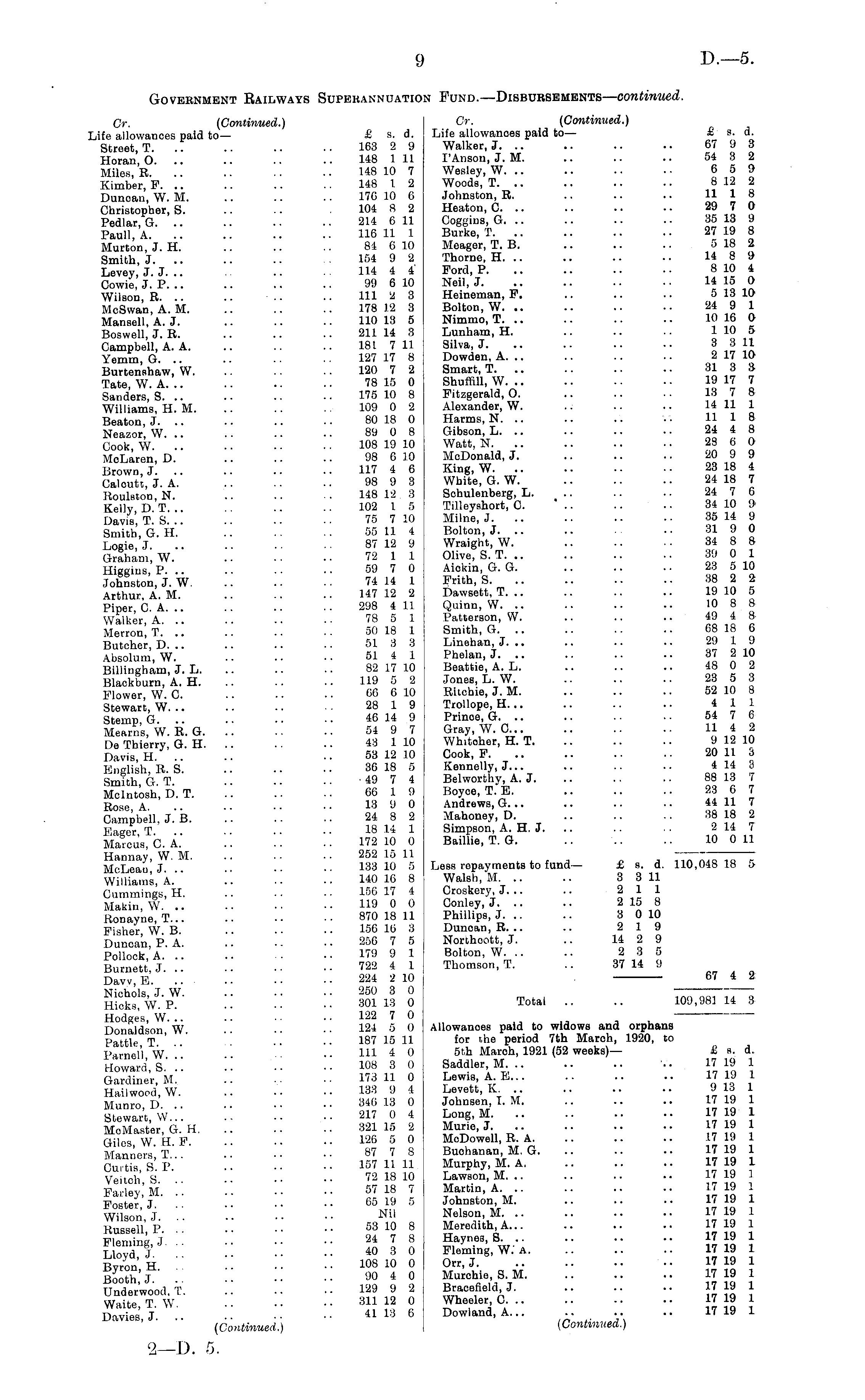 Govebnment Railways Superannuation Fund.—Disbursements — continued. Cr. (Continued.) Or. (Continued.) Life allowances paid to— £ s, d. Life allowances paid to— £ s. d. Street, T. .. .. .. .. 163 2 9 Walker, J. .. .. .. .. 67 9 3 Horan, O. .. .. .. .. 148 111 FAnson, J. M. .. .. .. 54 3 2 Miles.R 148 10 7 Wesley, W £59 Kimber, F 148 1 2 Woods, T 8 .12 2 Duncan, W. M. .. .. .. 176 10 6 Johnston, R. .. .. .. 11 1 8 Christopher, S. .. •. 104 8 2 Heaton, C. .. .. .. • • 29 7 0 Pedlar, G 214 611 Coggins, G 35 13 9 Paull.A 116 11 1 Burke, T 27 19 8 Murton, J. H. .. .. .. 81 610 Meager, T. B. .. .. .. 518 2 Smith, J. .. .. .. 154 9 2 Thorne, H. .. .. .. .. 14 8 9 Levey, J. J... .. 114 4 4 Ford, P. .. .. .. •■ 810 4 Cowie,J.P 99 610 Neil, J 14 15 O Wilson, R. .. .. .. .. 111 2 3 Heineman, F. .. .. .. 513 10 McSwan,A. M 178 1.2 3 Bolton, W 24 9 1 Mansell.A. J. 110 13 5 Nimmo, T 10 16 O Boswell, J. R. .. .. .. 211 14 3 Lunham, H. .. .. .. 110 5 Campbell, A. A. .. .. .. 181 711 Silva, J. .. .. .. •• 83 11 Yemm, G. .. .. .. .. 127 17 8 Dowden, A. .. .. .. .. 217 10 Burtenshaw, W. .. .. 120 7 2 Smart, T. .. .. .. .. 31 3 3 Tate W A. .. .. .. .. 78 15 0 Shuffill, W .. • ■ 19 17 7 Sanders, S. .. .. .. .. 175 10 8 Fitzgerald, O. .. .. .. 13 7 8 Williams, H. M. .. .. .. 109 0 2 Alexander, W. .. .. .. 14 11 1 Beaton, J 80 18 0 Harms, N v. 11 1 8 Neazor W. .. .. .. •. 89 0 8 Gibson, L. .. .. .. • ■ 24 4 8 Cook W .. .. . • • ■ 108 19 10 Watt, N. .. .. .. .. 28 6 0 McLaren, D. .. .. .. 98 610 McDonald, J. .. .. .. 20 9 9 Brown,? 1" 4 6 King, W. 2318 4 Caloutt, J.A 98 9 3 White, G. W 24 18 7 Roulston.N. ' 148 12 3 Schulenberg, L. 24 (l 3 Kelly D T .. 102 I 5 Tilleyshort, C. .. .. • • 34 10 9 Davis', T.s 75 710 Milne, J 35 14 9 Smith, G. H 55 11 4 Bolton, J .. 31 9 0 Logic, J 87 12 9 Wraight, W. 34 8 8 Graham, W 72 1 1 Olive, S. T 39 0 1 Higgins P. .. .. .'. .. 59 7 0 Aiokin, G. G. .. .. .•23 5 10 Johnston, J. W 74 14 1 Frith, S. 38 2 2 Arthur A. M. .. .. •• 147 12 2 Dawsett, T. .. .. .. .. 19 10 5 Piper, C. A 298 411 Quinn, W 10 8 8 Walker A .. .. .. .. 78 5 1 Patterson, W. .. .. .. 49 4 8 Merronl T. .. .. .. •• 50 18 1 Smith, G. .. .. .. .. 68 18 6 Butcher, D .. •• 51 3 3 Linehan, J .. 29 19 Absolum, W. 51 4 1 Phelan, J 37 210 Billingham, J. L 82 17 10 Beattie, A. L 48 0 2 Blackburn, A. H 119 5 2 Jones, L. W. 23 5 3 Flower W C -. • • 66 6 10 Ritchie, J. M. .. .. .. 52 10 8 Stewart.W 28 1 9 Trollope, H 41 1 Steinp G. .. .. .. •• 46 14 9 Prince, G. .. .. .. .. 54 7 6 Mearrrs, W. R. G 54 9 7 Gray, W. 0... .. .. •■ 11 4 2 De Thierry, G. H 43 110 Wh.toher, H. T 912 10 Davis H. .. .. ■■ 53 12 10 Cook, F 20 11 3 English R. S. .. .. •• 36 18 5 Kennelly, J... .. .. .. 4 14 3 Smith G T ' 49 7 4 Belwortliy, A. J 88 13 7 Mcintosh, D.T 66 1 9 Boyce, T. E. 23 6 7 Rose A .. • • • • 13 9 0 Andrews, G... .. .. .. 44 11 7 Campbell, J. B 24 8 2 Mahoney, D. 38 18 2 Eager T . • .. 18 14 1 Simpson, A. H. J. .. .. .. 214 7 Marcus, C. A 172 10 0 Baillie, T. G. .. .. .. 10 011 Hannay, W. M. .. .. •• 252 15 11 McLeau J . •• .. 133 10 5 Less repayments to fund— £ s. d. 110,048 18 5 Williams, A." .. .. .. 140 16 8 Walsh, M. .. .. 33 11 Cumminas, H. .. '.'. •■ 156 17 4 Croskery, J. .. .. 211 Makin, W 119 0 0 Conley, J 2 15 8 Ronayne,T 870 18 11 Phillips, J 30 10 Fisher W B .. .. •• 156 16 3 Dunoan, R. .. .. 2 19 Duncan, P. A 256 7 5 Northcott, J. .. "29 Pollock, A 179 9 1 Bolton, W 2 3 5 Burnett, J 722 4 1 Thomson, T. .. 37 14 9 Davv.E 224 2 10 . 67 4 2 Nichols, J. W 250 3 0 — -— Hicks WP. .. ■• 30113 0 Total .. .. 109,981 14 3 Hodge's, W 122 7 0 . Donaldson W .. •• •• 124 5 0 Allowances paid to widows and orphans Pattle T ' ■ ..187 15 11 for the period 7th March, 1920, to Parnel'l W ..11140 sth Maroh, 1921 (52 weeks)— £ s. d. Howard, 5.".:! .', '•". ■• 108 3 0 Saddler, M '.. 17 19 1 Gardiner, M 173 11 0 Lewis, AEI 1719 1 Hailwood.W 133 9 4 Levett, k 918 1 Munro, D 346 13 0 Johnsen I. M. .. .. .. 9 Stewart, W ... 217 0 4 Long, M 17 19 1 McMaster.G. H 321 15 2 Mur.e, J 17 19 1 Giles, W.H.F 126 5 0 McDowell, R A 17 19 1 Manners, T 87 7 S Buchanan M. G 17 19 1 Curtis, S.P 157 1111 Murphy, M. A 17 19 1 Veitoh, S 72 18 10 Lawson M 17 19 Farley, M 57 18 7 Martin, A 17 19 Foster, J 65 19 5 ohnston M 17 19 1 Wilson, J Nil Nelson M 17 19 1 Russell, P 53 10 8 Meredith A 719 F | emin g j .. .. .. 24 7 8 Haynea, B. .. 17 19 1 ! J " .. •• 40 3 0 Fleming, W; A 17 19 1 Byron H " 108 10 0 Orr, J 17 19 1 E' r .. 90 4 0 Murchie, S. M 17 19 1 Underwood. T. .. -■ ■■ ™9 2 Braoeneld, J. .. 17 19 1 w „;f p T W .. 311 12 0 Wheeler, C... .. -. •• 17 19 1 Davies J '■'■ •• •• il 6 Dowland, A 17 19 1 ( Continued.) ( Continued.)