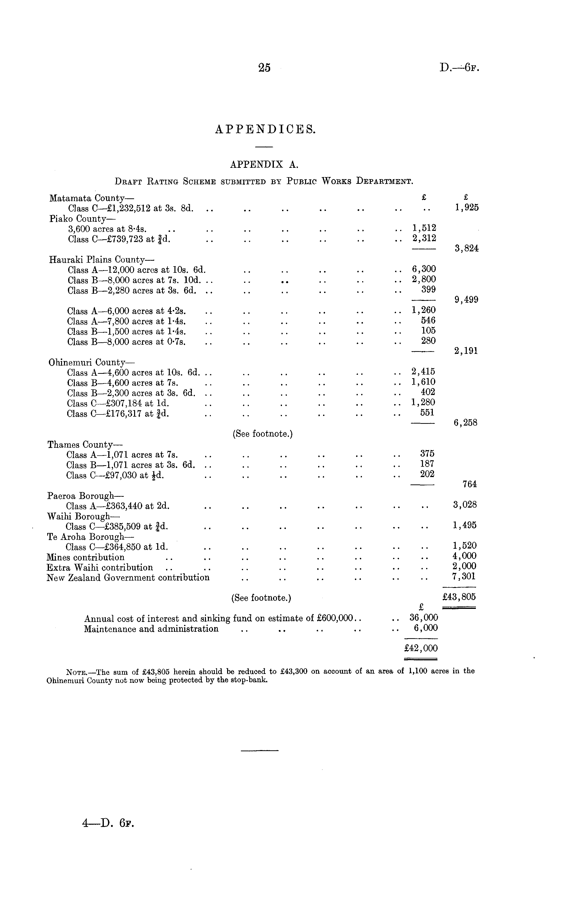 APPENDICES. appendix a. Draft Rating Scheme submitted by Public Works Department. Matamata County — £ £ Class C—£1,232,512 at 3s. Bd. .. .. .. .. .. .. .. 1,925 Piako County — 3,600 acres at 84s. .. .. .. .. .. .. .. 1,512 Class C—£739,723 at fd. .. .. .. .. .. .. 2,312 3,824 Hauraki Plains CountyClass A—12,000 acres at 10s. 6d. .. .. .. .. ..6,300 Class B—B.ooo acres at 7s. lOd. .. .. .. .. .. ..2,800 Class 8—2,280 acres at 3s. 6d. .. .. .. .. .. .. 399 9,499 Class A—6,000 acres at 4-2s. .. .. .. .. .. ..1,260 Class A—7,800 acres at l-4s. .. .. .. .. .. .. 546 Class 8—1,500 acres at Ms. .. .. .. .. .. • • 105 Class B—B,ooo acres at 0-7s. .. .. .. .. .. .. 280 2,191 Ohinemuri County — Class A—4,600 acres at 10s. 6d. .. .. .. .. .. ..2,415 Class 8—4,600 acres at 7s. .. .. .. .. .. ..1,610 Class 8—2,300 acres at 3s. 6d. .. .. .. .. .. .. 402 Class C—£307,184 at Id. .. .. .. .. .. ..1,280 Class C—£176,317 at fd. .. .. .. .. .. 551 6,258 (See footnote.) Thames County— Class A—1,071 acres at 7s. .. .. .. .. .. • • 375 Class 8—1,071 acres at 3s. 6d. .. .. .. .. .. .. 187 Class C—£97,030 at id. .. .. .. .. .. 202 764 Paeroa Borough— Class A—£363,440 at 2d. .. .. .. .. .. .. .. 3,028 Waihi Borough — Class C—£385,509 at fd. .. .. .. .. .. .. •• 1,495 Te Aroha Borough — Class C—£364,850 at Id. .. .. .. .. .. .. ■• 1,520 Mines contribution .. .. .. .. .. .. •• •• 4,000 Extra Waihi contribution .. .. .. .. .. .. .. •• 2,000 New Zealand Government contribution .. .. .. .. .. .. 7,301 (See footnote.) £43,805 £ Annual cost of interest and sinking fund on estimate of £600,000.. .. 36,000 Maintenance and administration .. .. .. .. .. 6,000 £42,000 Note. —The sum of £43,805 herein should be reduced to £43,300 on account of an area of 1,100 acres in the Ohinemuri County not now being protected by the stop-bank.