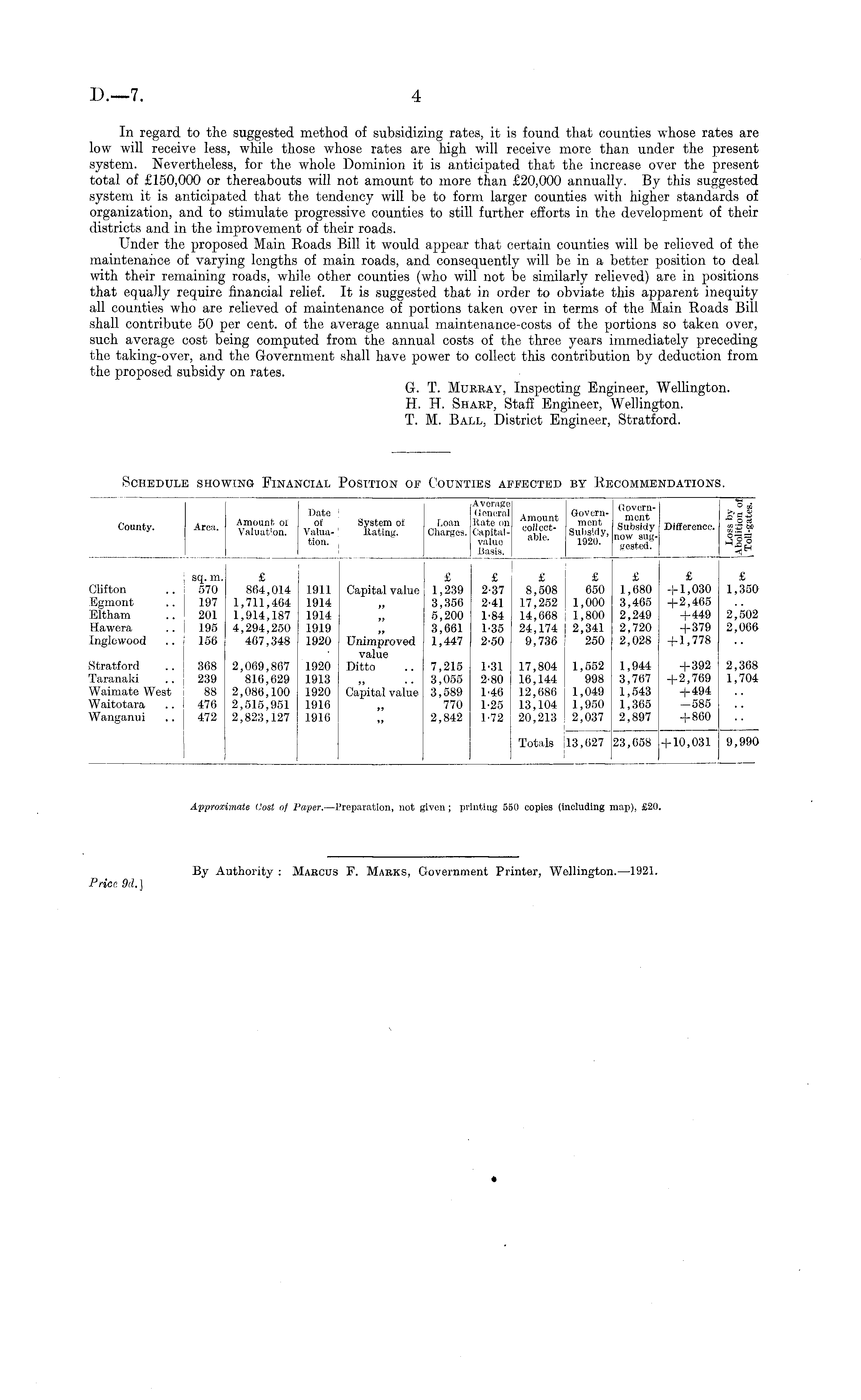 In regard to the suggested method of subsidizing rates, it is found that counties whose rates are low will receive less, while those whose rates are high will receive more than under the present system. Nevertheless, for the whole Dominion it is anticipated that the increase over the present total of £150,000 or thereabouts will not amount to more than £20,000 annually. By this suggested system it is anticipated that the tendency will be to form larger counties with higher standards of organization, and to stimulate progressive counties to still further efforts in the development of their districts and in the improvement of their roads. Under the proposed Main Roads Bill it would appear that certain counties will be relieved of the maintenance of varying lengths of main roads, and consequently will be in a better position to deal with their remaining roads, while other counties (who will not be similarly relieved) are in positions that equally require financial relief. It is suggested that in order to obviate this apparent inequityall counties who are relieved of maintenance of portions taken over in terms of the Main Roads Bill shall contribute 50 per cent, of the average annual maintenance-costs of the portions so taken over, such average cost being computed from the annual costs of the three years immediately preceding the taking-over, and the Government shall have power to collect this contribution by deduction from the proposed subsidy on rates. G. T. Murray, Inspecting Engineer, Wellington. H. H. Sharp, Staff Engineer, Wellington. T. M. Ball, District Engineer, Stratford.