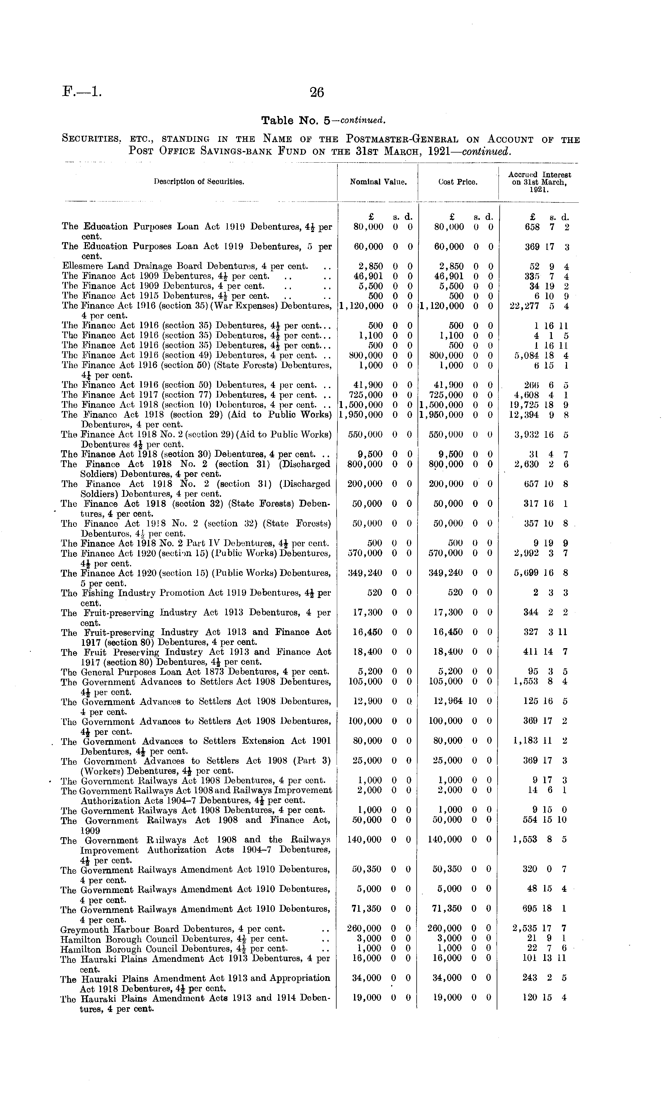 Description of Securities. Nominal Value. Cost Price. Accrued Interest on 31st March, 1921. I The Education Purposes Loan Act 1919 Debentures, 4J per cent. The Education Purposes Loan Act 1919 Dobentures, 5 per cent. Ellesmere Land Drainage Board Debentures, 4 per cent. The Finance Act 1909 Debentures, 4J per cent. The Finance Act 1909 Debentures, 4 per cent. The Finance Act 1915 Debentures, 4| per cent. The Finance Act 1916 (section 35) (War Expenses) Debentures, 4 per cent. The Finance Act 1916 (section 35) Debentures, 4J per cent... The Finance Act 1916 (section 35) Debentures, 4| per cent... Tho Finance Act 1916 (section 35) Debentures, 4j per cont... Tho Finance Act 1916 (section 49) Debentures, 4 por cent. .. The Finance Act .1916 (section 50) (State Forests) Debentures, 44- per cent. The Finance Act 1916 (section 50) Debentures, 4 per cent. .. The Finance Act 1917 (section 77) Dobentures, 4 per cent. .. Tho Finance Act 1918 (section 10) Dobenturos, 4 por cont. .. The Finance Act 1918 (section 29) (Aid to Public Works) Debentures, 4 per cent. The Finance Act 1918 No. 2 (section 29) (Aid to Public Works) Dobenturos 4J per cent. The Finanoe Act 1918 (section 30) Debentures, 4 per cent. .. The Finance Act 1918 No. 2 (section 31) (Discharged Soldiers) Debentures, 4 per cent. The Finance Act 1918 No. 2 (section 31) (Discharged Soldiers) Debentures, 4 por cont. The Finance Aot 1918 (scotion 32) (State Forests) Debentures, 4 per cent. Tho Finance Aot 1918 No. 2 (section 32) (State Forests) Debentures, i\ per cent. Tho Finance Aot 1918 No. 2 Part IV Debentures, i\ per cent. The Finanoe Act 1920 (seoti-in 15) (Public Works) Dobentures, 4J per cent. The Finance Act 1920 (section 15) (Public Works) Debentures, 5 per cent. Tho Fishing Industry Promotion Act 1919 Debentures, 4J petcent. The Fruit-prosorving Industry Act 1913 Debentures, 4 per cent. Tho Fruit-preserving Industry Act 1913 and Finance Act 1917 (section 80) Debentures, 4 per cent. The Fruit Preserving Industry Act 1913 and Finance Act 1917 (section 80) Debentures, 4£ per cent. The General Purposes Loan Act 1873 Debentures, 4 per cent. The Government Advances to Settlers Act 1908 Debentures, 4t$ por cent. The Government Advances to Settlers Act 1908 Debentures, 4 per cont. The Governmont Advances to Settlers Act 1908 Debentures, 4J per cent. The Government Advances to Settlers Extension Act 1901 Debentures, 4£ per cent. The Govornment Advances to Settlers Act 1908 (Part 3) (Workers) Debentures, 4J per cent. The Govornment Railways Act 1908 Debentures, 4 por cent. The Government Railways Act 1908 and Railways Improvement Authorization Acts 1.904-7 Debentures, 4J per cent. The Government Railways Act 1908 Debentures, 4 per cent. The Governmont Railways Act 1908 and Finance Act, 1909 The Government R always Act 1908 and the Railways Improvement Authorization Acts 1904-7 Dobentures, 4J per cent. The Governmont Railways Amendment Aot 1910 Debentures, 4 per cent. The Govornment Railways Amendment Act 1.910 Debentures, 4 per cent. The Government Railways Amendment Act 1910 Debentures, 4 per cent. Greymouth Harbour Board Dobentures, 4 por cent. Hamilton Borough Council Debentures, 4|- per cent. Hamilton Borough Council Debentures, 4|- per cent. The Hauraki Plains Amendment Act 1913 Debentures, 4 per cent. The Hauraki Plains Amendment Act 1913 and Appropriation Act 1918 Debentures, 4J per cent. The Hauraki Plains Amendment Acts 1913 and 1914 Debentures, 4 per cent. £ s. d. 80,000 0 0 £ s. d. 80,000 0 0 £ s. d 80,000 0 i d. £ s. d. 0 658 7 2 £ s. d. 658 7 2 60,000 0 0 60,000 0 0 60,000 0 i 0 369 17 3 369 17 3 2,850 0 0 46,901 0 0 5,500 0 0 500 0 0 1,120,000 0 0 1, 2,850 0 0 46,901 0 0 5,500 0 0 500 0 0 1,120,000 0 0 2,850 0 i 46,901 0 I 5,500 0 i 500 0 I ,120,000 0 l 0 52 9 4 0 335 7 4 0 34 19 2 0 6 10 !) 0 22,277 5 4 52 9 4 335 7 4 34 19 2 6 10 9 22,277 5 4 500 0 0 1,100 0 0 500 0 0 800,000 0 0 1,000 0 0 500 0 0 1,100 0 0 500 0 0 800,000 0 0 1,000 0 0 500 0 l 1,100 0 I 500 0 l 800,000 0 I 1,000 0 I 0 1 16 II 0 4 15 0 1 16 11 0 5,084 18 4 0 6 15 1 1 16 11 4 1 5 1 16 11 5,084 18 4 6 15 1 41,900 0 0 725,000 0 0 1,500,000 0 0 1,950,000 0 0 1, 1,! 41,900 0 0 725,000 0 0 1,500,000 0 0 1,950,000 0 0 41,900 0 ( 725,000 0 < ,500,000 0 I ,950,000 0 ( 0 266 6 5 0 4,608 4 1 0 19,725 18 9 0 12,394 9 8 266 6 5 4,608 4 1 19,725 18 9 12,394 9 8 550,000 0 0 550,000 0 0 550,000 0 ( 0 3,932 16 5 3,932 16 5 9,500 0 0 800,000 0 0 i 9,500 0 0 800,000 0 0 9,500 0 ( 800,000 0 ( 0 31. 4 7 0 2,630 2 6 31 4 7 2,630 2 6 200,000 0 0 200,000 0 0 200,000 0 ( 0 657 10 8 657 10 8 50,000 0 0 50,000 0 0 50,000 0 ( 0 31.7 10 1 31.7 10 1 50,000 0 0 50,000 0 0 50,000 0 ( 0 357 10 8 357 10 8 500 0 0 570,000 0 0 500 0 0 570,000 0 0 500 0 ( 570,000 0 ( 0 9 19 9 0 2,992 3 7 9 19 9 2,992 3 7 349,240 0 0 349,240 0 0 349,240 0 ( 0 5,699 10 8 5,699 16 8 520 0 0 520 0 0 520 0 ( 0 2 3 3 2 3 3 1.7,300 0 0 .17,300 0 0 17,300 0 ( 0 344 2 2 344 2 2 16,450 0 0 16,450 0 0 16,450 0 ( 0 327 3 II 327 3 II 18,400 0 0 18,400 0 0 18,400 0 ( 0 411 14 7 411 14 7 5,200 0 0 105,000 0 0 5,200 0 0 105,000 0 0 5,200 0 ( 105,000 0 ( 0 95 3 5 0 1,553 8 4 95 3 5 1,553 8 4 12,900 0 0 12,964 10 0 12,964 10 ( 0 125 .16 5 125 .16 5 100,000 0 0 100,000 0 0 100,000 0 ( 0 369 17 2 369 17 2 80,000 0 0 80,000 0 0 80,000 0 ( 0 1,183 11 2 1,183 11 2 25,000 0 0 25,000 0 0 25,000 0 ( 0 369 17 3 369 17 3 1,000 0 0 2,000 0 0 1,000 0 0 2,000 0 0 1,000 0 ( 2,000 0 ( 0 9 17 3 U 14 6 I 9 17 3 14 6 I 1,000 0 0 50,000 0 0 1,000 0 0 50,000 0 0 1,000 0 ( 50,000 0 ( 0 9 15 0 0 554 15 10 9 15 0 554 15 10 140,000 0 0 140,000 0 0 140,000 0 ( 0 1,553 8 5 1,553 8 5 50,350 0 0 50,350 0 0 50,350 0 f 0 320 0 7 320 0 7 5,000 0 0 5,000 0 0 5,000 0 t 0 48 15 4 48 15 4 71,350 0 0 71,350 0 0 71,350 0 C 0 695 18 1 695 18 1 260,000 0 0 3,000 0 0 1,000 0 0 16,000 0 0 260,000 0 0 3,000 0 0 1,000 0 0 16,000 0 0 260,000 0 ( 3,000 0 I 1,000 0 C 16,000 0 C 0 2,535 17 7 0 21 9 1 0 22 7 6 0 101 13 11 2,535 17 7 21 9 I 22 7 6 101 13 11 34,000 0 0 34,