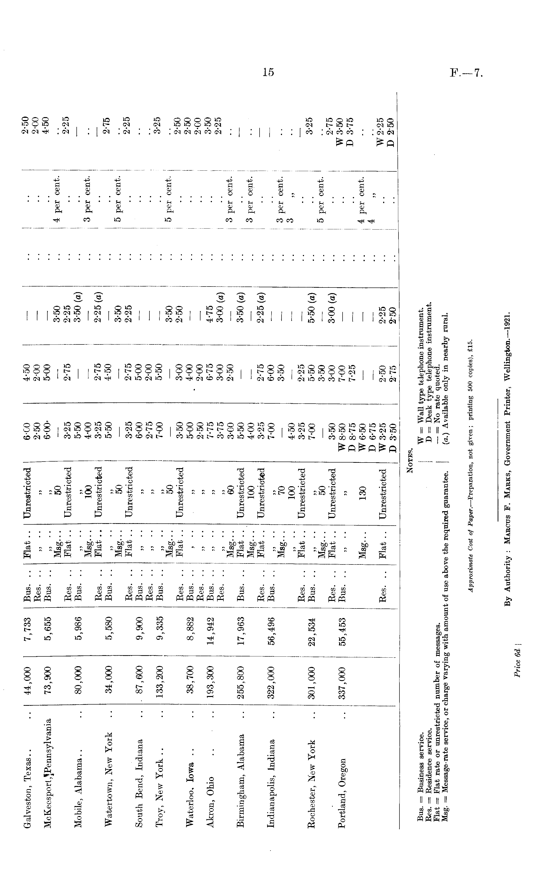 Galveston, Texas.. McKeesport^Pennsylvania 44,000 73,900 7,733 5,655 Bus. . . Res. .. Bus. .. Flat .. >3 ' • Unrestricted ,? 6-CO 2-50 6-00-4-50 2-00 5-00 2-75 2-75 4-50 2-75 5-00 2-00 5-50 3-00 4-00 2-00 6-75 3-00 2-50 3-50 2-25 3-50 (a) 2-25 (a) 3-50 2-25 3-50 2-50 4-75 3-00 (a) 4 per cent. 3 per cent. 5 per cent. 5 per cent. 3 per cent. 2-50 2-00 4-50 2-25 2-75 2-25 3-25 2-50 2-50 2-00 3-50 2-25 Res. .. Bus. .. Msg..Flat .. 50 Unrestricted Mobile, Alabama.. 80,000 5,986 Flat .. 100 Unrestricted 3-25 5-50 4-00 3-25 5-50 Watertown, New York 34,000 5,580 Res. .. Bus. .. Res. .. Bus. .. Res. .. Bus. .. Msg.:: Flat .. 50 Unrestricted South Bend, Indiana . 87,600 9,900 11 • • ii 3-25 6-00 2-75 7-00 Troy, New York .. 133,200 9,335 11 • • ii Res. . . Bus. .. Res. .. Bus. .. Res. .. Msg... Flat .. 50 Unrestricted Waterloo, Iowa .. 38,700 8,882 1 • • ii 3-50 5-00 2-50 7-75 3-75 3-00 5-50 4-00 3-25 7-00 Akron, Ohio 193,300 14,942 ii a Birmingham, Alabama 255,800 17,963 Bus. .. 11 • • Msg... Flat .. Msg...' Flat .. 60 Unrestricted 100 Unrestricted 3-50 (a) J 3 per cent. Indianapolis, Indiana 322,000 56,496 Res. .. Bus. .. 2-75 6-00 3-50 2-25 (a) 3 per cent. 3 Msg... 70 100 Unrestricted Rochester, New York 301,000 22,534 Res. .. Bus. .. Flat .'. 4-50 3-25 7-00 2-25 5-50 3-50 3-00 7-00 7-25 5-50 (a) 3-00 (a) 5 per cent. 3-25 2-75 W3-50 D 3-75 Res. .. Bus. .. Msg... Flat .. 50 Unrestricted Portland, Oregon 337,000 55,453 ! 3-50 W 8-50 D 8-75 W6-50 D 6-75 W 3-25 D 350 11 5) Msg... 130 2-50 2-75 2-25 2-50 4 per cent. 4 W 2-25 D 250 Res. .. Flat .. Unrestricted