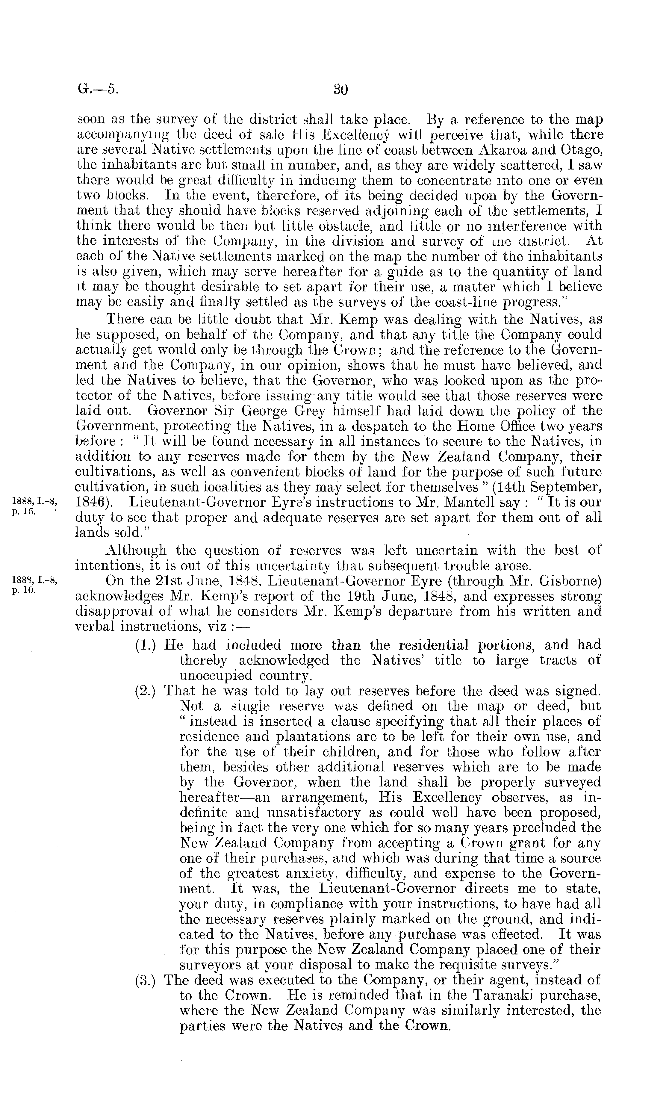 soon as the survey of the district shall take place. By a reference to the map accompanying the deed of sale His Excellency will perceive that, while there are several Native settlements upon the line of coast between Akaroa and Otago, the inhabitants are but small in number, and, as they are widely scattered, I saw there would be great difficulty in inducing them to concentrate into one or even two blocks. In the event, therefore, of its being decided upon by the Government that they should have blocks reserved adjoining each of the settlements, 1 think there would be then but little obstacle, and little or no interference with the interests of the Company, in the division and survey of tuc district. At each of the Native settlements marked on the map the number of the inhabitants is also given, which may serve hereafter for a guide as to the quantity of land it may be thought desirable to set apart for their use, a matter which I believe may be easily and finafly settled as the surveys of the coast-line progress." There can be little doubt that Mr. Kemp was dealing with the Natives, as he supposed, on behalf of the Company, and that any title the Company could actually get would only be through the Crown; and the reference to the Government and the Company, in our opinion, shows that he must have believed, and led the Natives to believe, that the Governor, who was looked upon as the protector of the Natives, before issuing-any title would see that those reserves were laid out. Governor Sir George Grey himself had laid down the policy of the Government, protecting the Natives, in a despatch to the Home Office two years before : "It will be found necessary in all instances to secure to the Natives, in addition to any reserves made for them by the New Zealand Company, their cultivations, as well as convenient blocks of land for the purpose of such future cultivation, in such localities as they may select for themselves " (14th September, 1846). Lieutenant-Governor Eyre's instructions to Mr. Mantell say : "It is our duty to see that proper and adequate reserves are set apart for them out of all lands sold." Although the question of reserves was left uncertain with the best of intentions, it is out of this uncertainty that subsequent trouble arose. On the 21st June, 1848, Lieutenant-Governor Eyre (through Mr. Gisborne) acknowledges Mr. Kemp's report of the 19th June, 1848, and expresses strongdisapproval of what he considers Mr. Kemp's departure from his written and verbal instructions, viz :— (1.) He had included more than the residential portions, and had thereby acknowledged the Natives' title to large tracts of unoccupied country. (2.) That he was told to lay out reserves before the deed was signed. Not a single reserve was defined on the map or deed, but " instead is inserted a clause specifying that all their places of residence and plantations are to be left for their own use, and for the use of their children, and for those who follow after them, besides other additional reserves which are to be made by the Governor, when the land shall be properly surveyed hereafter —an arrangement, His Excellency observes, as indefinite and unsatisfactory as could well have been proposed, being in fact the very one which for so many years precluded the New Zealand Company from accepting a Crown grant for any one of their purchases, and which was during that time a source of the greatest anxiety, difficufty, and expense to the Government. It was, the Lieutenant-Governor directs me to state, your duty, in compliance with your instructions, to have had all the necessary reserves plainly marked on the ground, and indicated to the Natives, before any purchase was effected. It was for this purpose the New Zealand Company placed one of their surveyors at your disposal to make the requisite surveys." (3.) The deed was executed to the Company, or their agent, instead of to the Crown. He is reminded that in the Taranaki purchase, where the New Zealand Company was similarly interested, the parties were the Natives and the Crown.