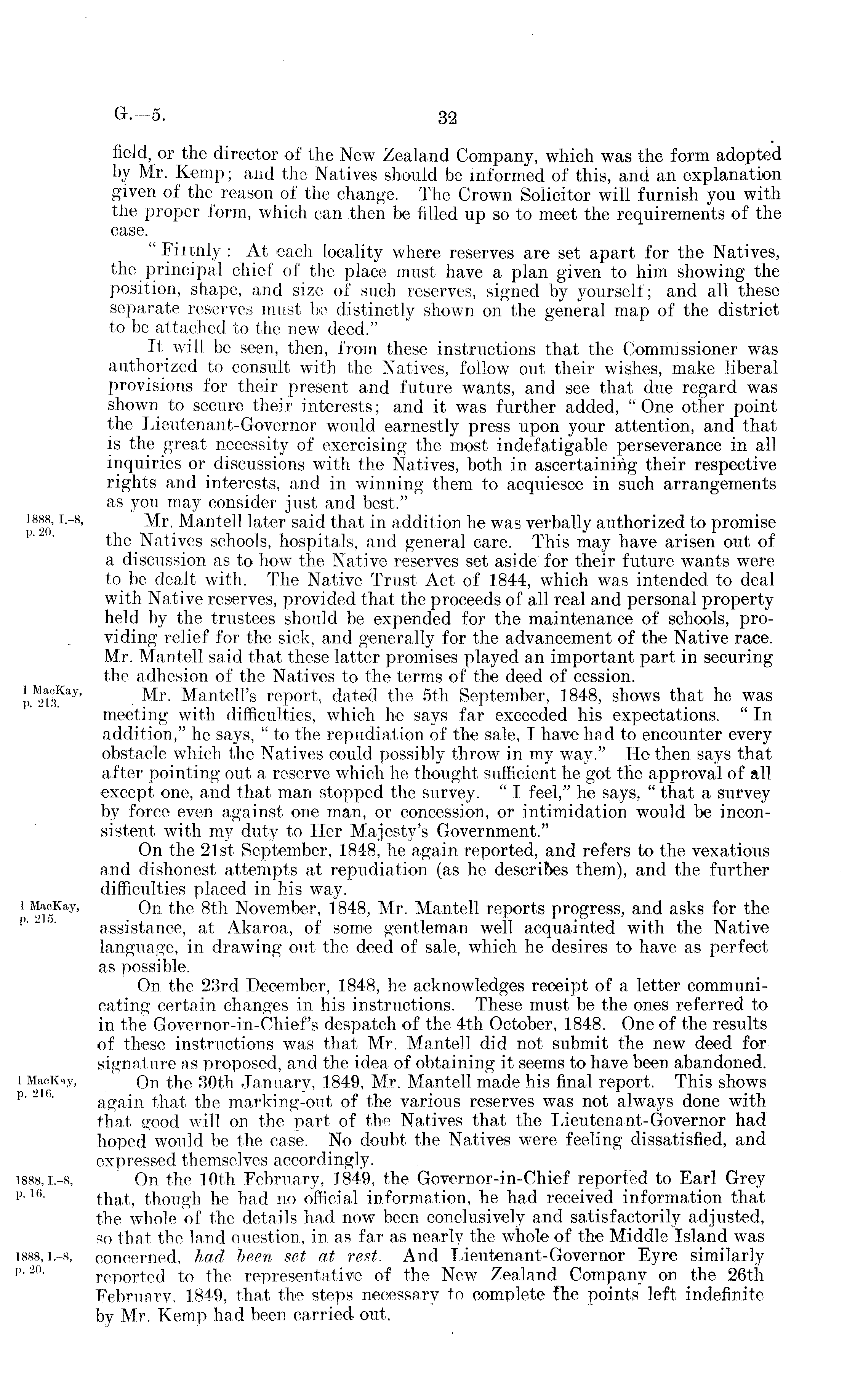 field, or the director of the New Zealand Company, which was the form adopted by Mr. Kemp; and the Natives should be informed of this, and an explanation given of the reason of the change. The Crown Solicitor will furnish you with the proper form, which can then be filled up so to meet the requirements of the case. " Filthly : At each locality where reserves are set apart for the Natives, the principal chief of the place must have a plan given to him showing the position, shape, and size of such reserves, signed by yourself; and all these separate reserves must be distinctly shown on the general map of the district to be attached to the new deed." It will be seen, then, from these instructions that the Commissioner was authorized to consult with the Natives, follow out their wishes, make liberal provisions for their present and future wants, and see that due regard was shown to secure their interests; and it was further added, " One other point the Lieutenant-Governor would earnestly press upon your attention, and that is the great necessity of exercising the most indefatigable perseverance in all inquiries or discussions with the Natives, both in ascertaining their respective rights and interests, and in winning them to acquiesce in such arrangements as you may consider just and best." Mr. Mantel! later said that in addition he was verbally authorized to promise the Natives schools, hospitals, and general care. This may have arisen out of a discussion as to how the Native reserves set aside for their future wants were to be dealt with. The Native Trust Act of 1844, which was intended to deal with Native reserves, provided that the proceeds of all real and personal property held by the trustees should be expended for the maintenance of schools, providing relief for the sick, and generally for the advancement of the Native race. Mr. Mantell said that these latter promises played an important part in securing the adhesion of the Natives to the terms of the deed of cession. Mr. Mantell's report, dated the sth September, 1848, shows that he was meeting with difficulties, which he says far exceeded his expectations. "In addition," he says, " to the repudiation of the sale, I have had to encounter every obstacle which the Natives could possibly throw in my way." He then says that after pointing out a reserve which he thought sufficient he got the approval of all except one, and that man stopped the survey. " I feel," he says, " that a survey by force even against one man, or concession, or intimidation would be inconsistent with my duty to Her Majesty's Government." On the 21st September, 1848, he again reported, and refers to the vexatious and dishonest attempts at repudiation (as he describes them), and the further difficulties placed in his way. On the Bth November, 1848, Mr. Mantell reports progress, and asks for the assistance, at Akaroa, of some gentleman well acquainted with the Native language, in drawing out the deed of sale, which he desires to have as perfect as possible. On the 23rd December, 1848, he acknowledges receipt of a letter communicating certain changes in his instructions. These must be the ones referred to in the Governor-in-Chief's despatch of the 4th October, 1848. One of the results of these instructions was that Mr. Mantell did not submit the new deed for signature as proposed, and the idea of obtaining it seems to have been abandoned. On the 30th January, 1849, Mr. Mantell made his final report. This shows again that the marking-out of the various reserves was not always done with that good will on the part of the Natives that the Lieutenant-Governor had hoped would be the case. No doubt the Natives were feeling dissatisfied, and expressed themselves accordingly. On the 10th February, 1849, the Governor-in-Chief reported to Earl Grey that, though he had no official information, he had received information that the whole of the details had now been conclusively and satisfactorily adjusted, so that the land question, in as far as nearly the whole of the Middle Island was concerned, had been set at rest. And Lieutenant-Governor Eyre similarly reported to the representative of the New Zealand Company on the 26th February, 1849, that the steps necessary to complete fhe points left indefinite by Mr. Kemp had been carried out.
