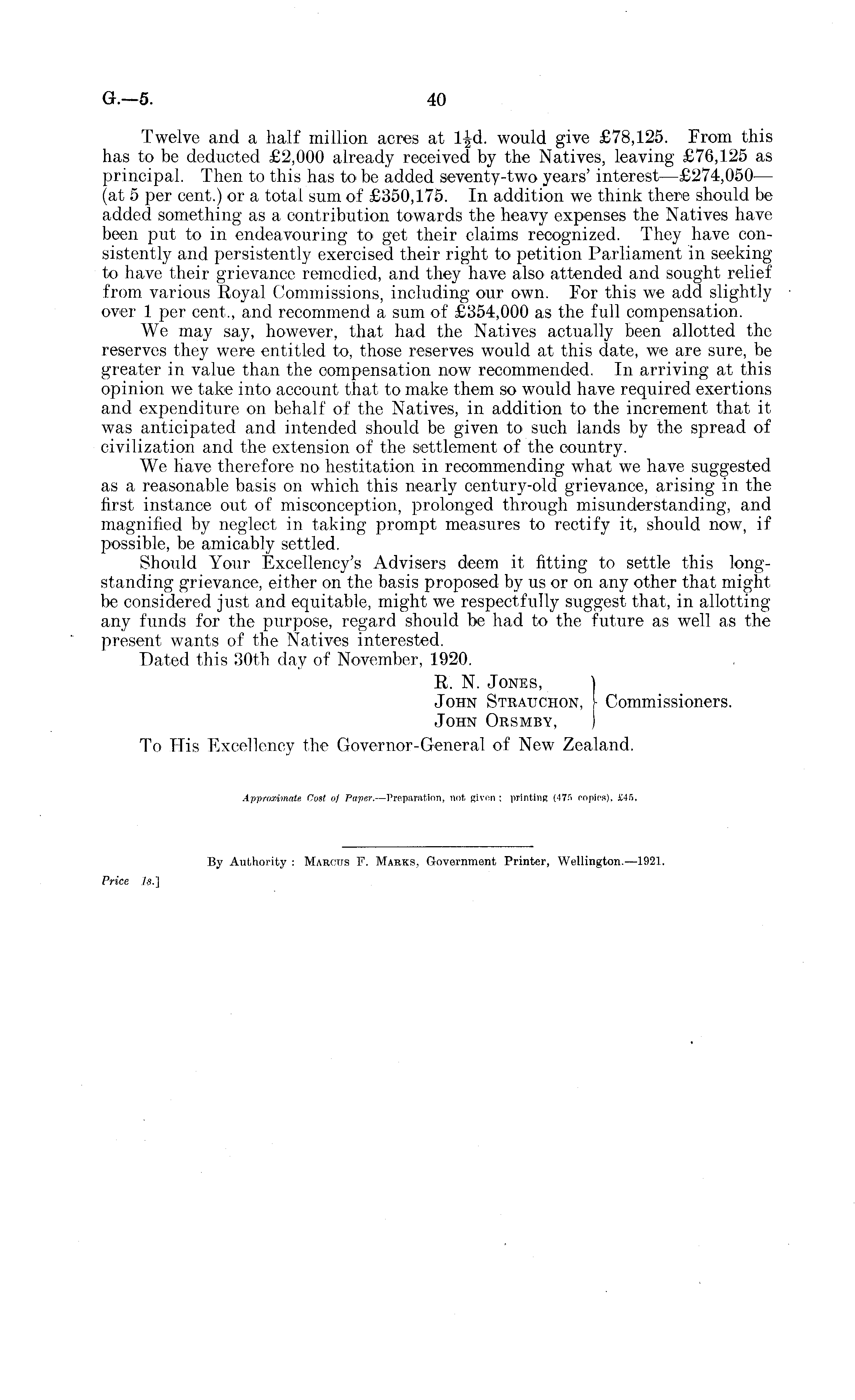Twelve and a half million acres at would give £78,125. From this has to be deducted £2,000 already received by the Natives, leaving £76,125 as principal. Then to this has to be added seventy-two years' interest —£274,050 — (at 5 per cent.) or a total sum of £350,175. In addition we think there should be added something as a contribution towards the heavy expenses the Natives have been put to in endeavouring to get their claims recognized. They have consistently and persistently exercised their right to petition Parliament in seeking to have their grievance remedied, and they have also attended and sought relief from various Eoyal Commissions, including our own. For this we add slightly over 1 per cent., and recommend a sum of £354,000 as the full compensation. We may say, however, that had the Natives actually been allotted the reserves they were entitled to, those reserves would at this date, we are sure, be greater in value than the compensation now recommended. In arriving at this opinion we take into account that to make them so would have required exertions and expenditure on behalf of the Natives, in addition to the increment that it was anticipated and intended should be given to such lands by the spread of civilization and the extension of the settlement of the country. We have therefore no hestitation in recommending what we have suggested as a reasonable basis on which this nearly century-old grievance, arising in the first instance out of misconception, prolonged through misunderstanding, and magnified by neglect in taking prompt measures to rectify it, should now, if possible, be amicably settled. Should Your Excellency's Advisers deem it fitting to settle this longstanding grievance, either on the basis proposed by us or on any other that mightbe considered just and equitable, might we respectfully suggest that, in allotting any funds for the purpose, regard should be had to the future as well as the present wants of the Natives interested. Dated this 30th day of November, 1920. E. N. Jones, j John Strauchon, [ Commissioners. John Orsmby, ) To His Excellency the Governor-General of New Zealand.