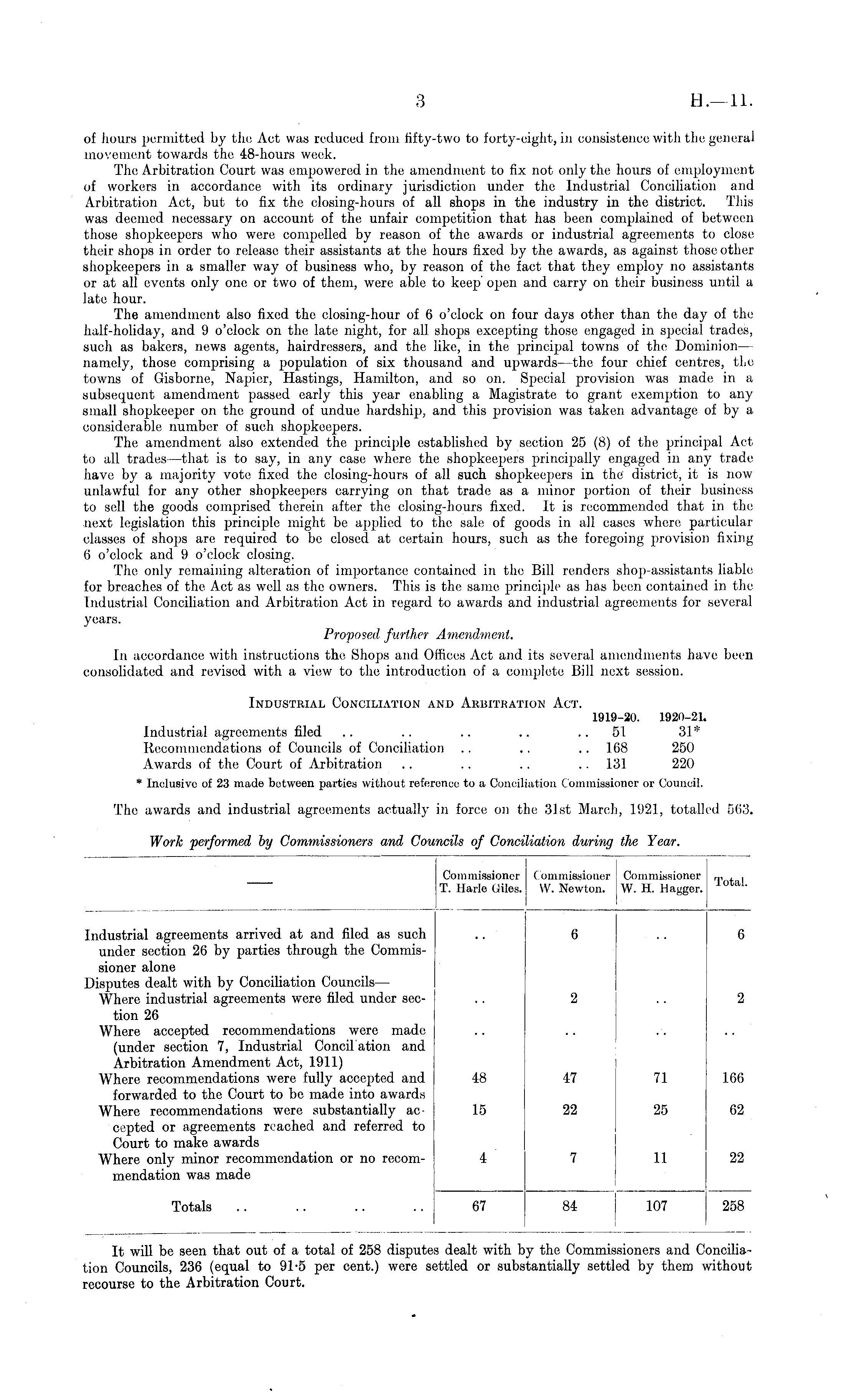 of hours permitted by the Act was reduced from fifty-two to forty-eight, in consistence with the general movement towards the 48-hours week. The Arbitration Court was empowered in the amendment to fix not only the hours of employment of workers in accordance with its ordinary jurisdiction under the Industrial Conciliation and Arbitration Act, but to fix the closing-hours of all shops in the industry in the district. This was deemed necessary on account of the unfair competition that has been complained of between those shopkeepers who were compelled by reason of the awards or industrial agreements to close their shops in order to release their assistants at the hours fixed by the awards, as against those other shopkeepers in a smaller way of business who, by reason of the fact that they employ no assistants or at all events only one or two of them, were able to keep' open and carry on their business until a late hour. The amendment also fixed the closing-hour of 6 o'clock on four days other than the day of the half-holiday, and 9 o'clock on the late night, for all shops excepting those engaged in special trades, such as bakers, news agents, hairdressers, and the like, in the principal towns of the Dominion — namely, those comprising a population of six thousand and upwards —the four chief centres, the towns of Gisborne, Napier, Hastings, Hamilton, and so on. Special provision was made in a subsequent amendment passed early this year enabling a Magistrate to grant exemption to any small shopkeeper on the ground of undue hardship, and this provision was taken advantage of by a considerable number of such shopkeepers. The amendment also extended the principle established by section 25 (8) of the principal Act to all trades —that is to say, in any case; where the shopkeepers principally engaged in any trade have by a majority vote fixed the closing-hours of all such shopkeepers in the district, it is now unlawful for any other shopkeepers carrying on that trade as a minor portion of their business to sell the goods comprised therein after the closing-hours fixed. It is recommended that in the next legislation this principle might be applied to the sale of goods in all cases where; particular classes of shops are required to be closed at certain hours, such as the foregoing provision fixing 6 o'clock and 9 o'clock closing. The only remaining alteration of importance contained in the Bill renders shop-assistants liable for breaches of the Act as well as the owners. This is the same principle as has been contained in the Industrial Conciliation and Arbitration Act in regard to awards and industrial agreements for several years. Proposed further Amendment. In accordance with instructions the Shops and Offices Act and its several amendments have been consolidated and revised with a view to the introduction of a complete Bill next session. Industrial Conciliation and Akbitration Act. 1919-20. 1920-21. Industrial agreements filed .. .. .. .. .. 51 31* Recommendations of Councils of Conciliation .. .. .. 168 250 Awards of the Court of Arbitration .. .. .. .. 131 220 * Inclusive of 23 made between parties without reference: to a, Conciliation Commissioner or Council. The awards and industrial agreements actually in force on the 31st March, 1921, totalled 563.