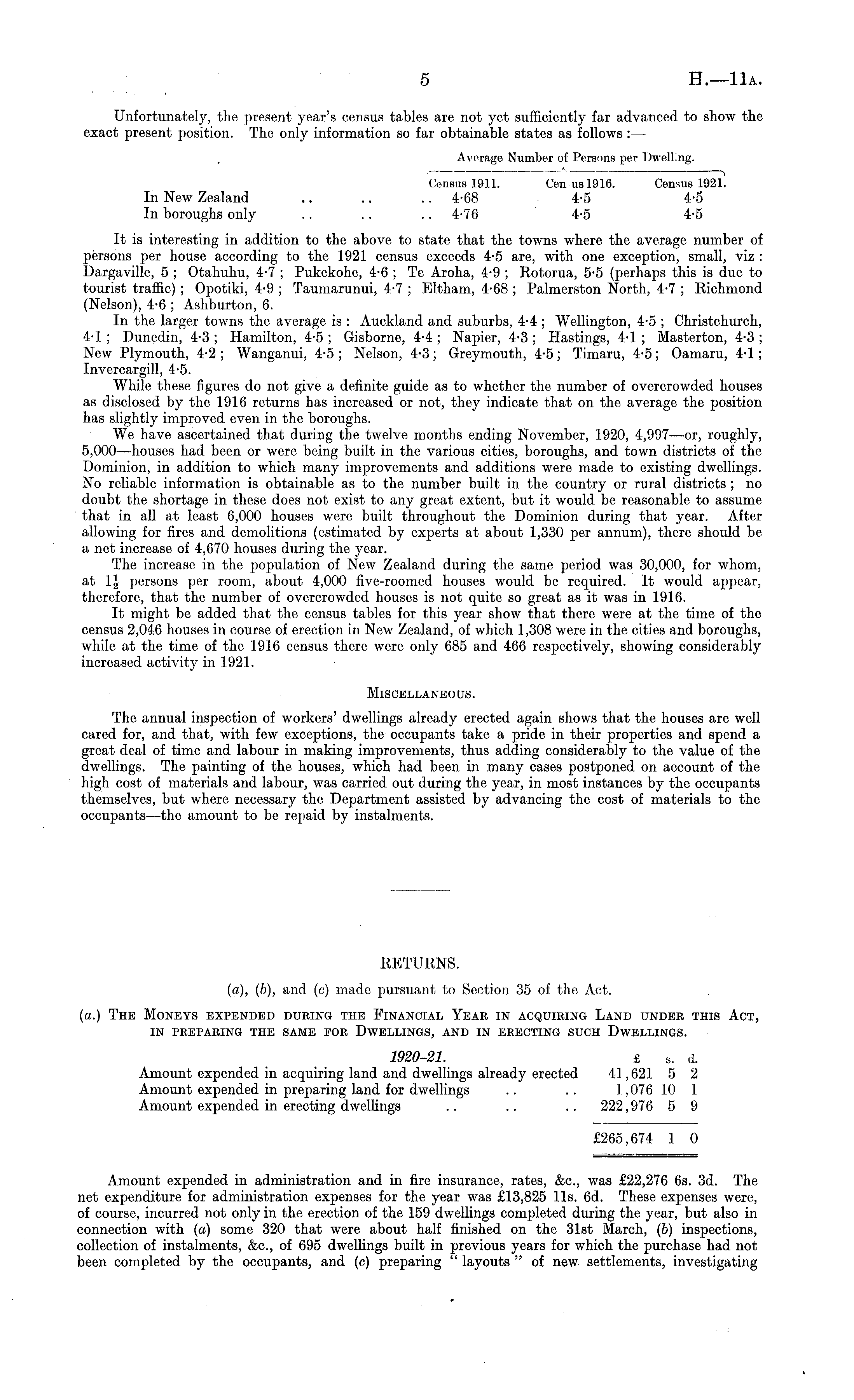RETURNS. (a), (b), and (c) made pursuant to Section 35 of the Act. (a.) The Moneys expended during the Financial Year in acquiring Land under this Act, in preparing the same for Dwellings, and in erecting such Dwellings. 1920-21. £ B . ,i. Amount expended in acquiring land and dwellings already erected 41,621 5 2 Amount expended in preparing land for dwellings .. .. 1,076 10 1 Amount expended in erecting dwellings .. .. .. 222,976 5 9 £265,674 1 0 Amount expended in administration and in fire insurance, rates, &c, was £22,276 6s. 3d. The net expenditure for administration expenses for the year was £13,825 lis. 6d. These expenses were, of course, incurred not only in the erection of the 159 dwellings completed during the year, but also in connection with (a) some 320 that were about half finished on the 31st March, (b) inspections, collection of instalments, &c, of 695 dwellings built in previous years for which the purchase had not been completed by the occupants, and (c) preparing " layouts " of new settlements, investigating