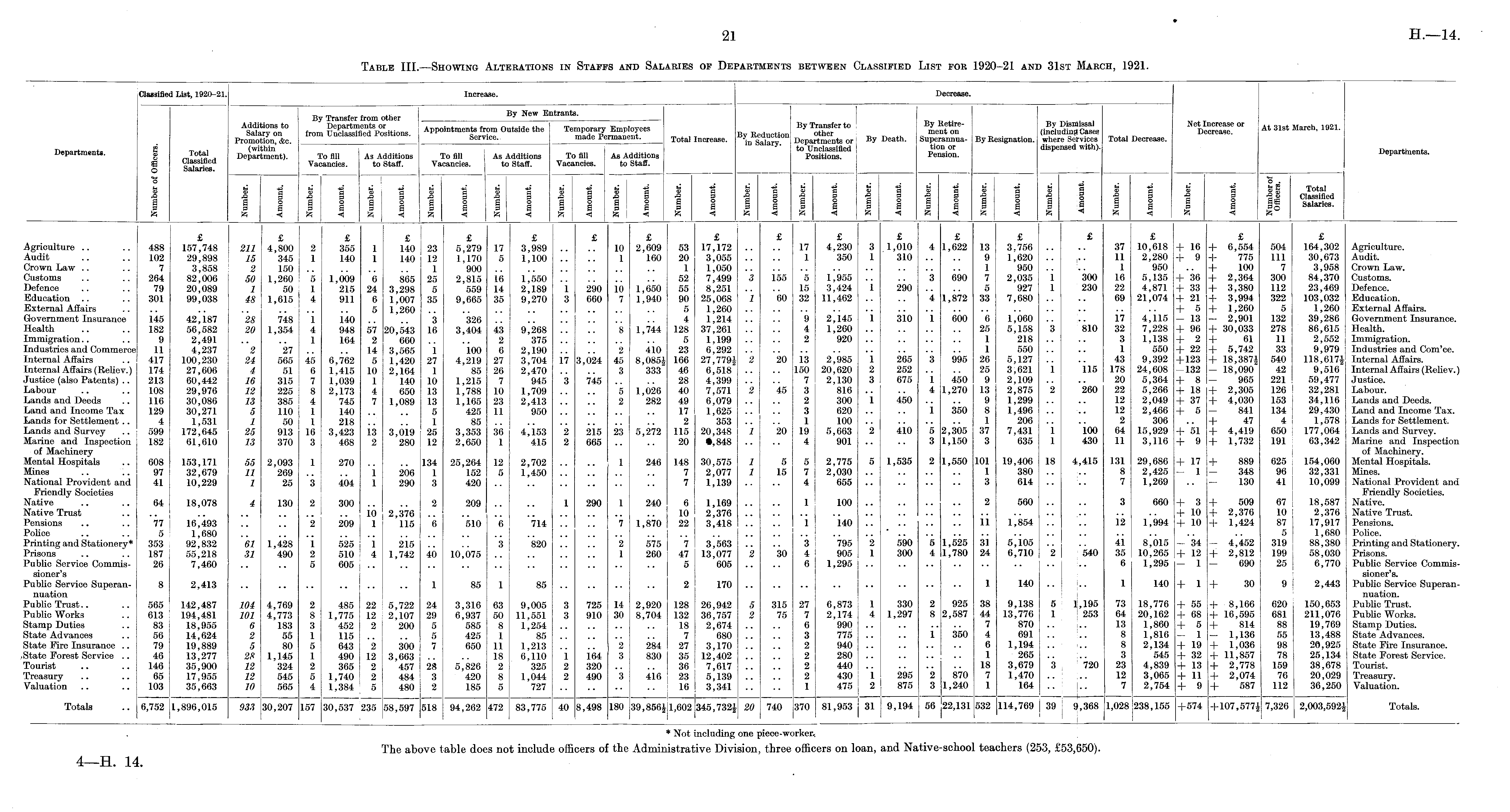 Table III. —Showing Alterations in Staffs and Salaries of Departments between Classified List for 1920-21 and 31st March, 1921.