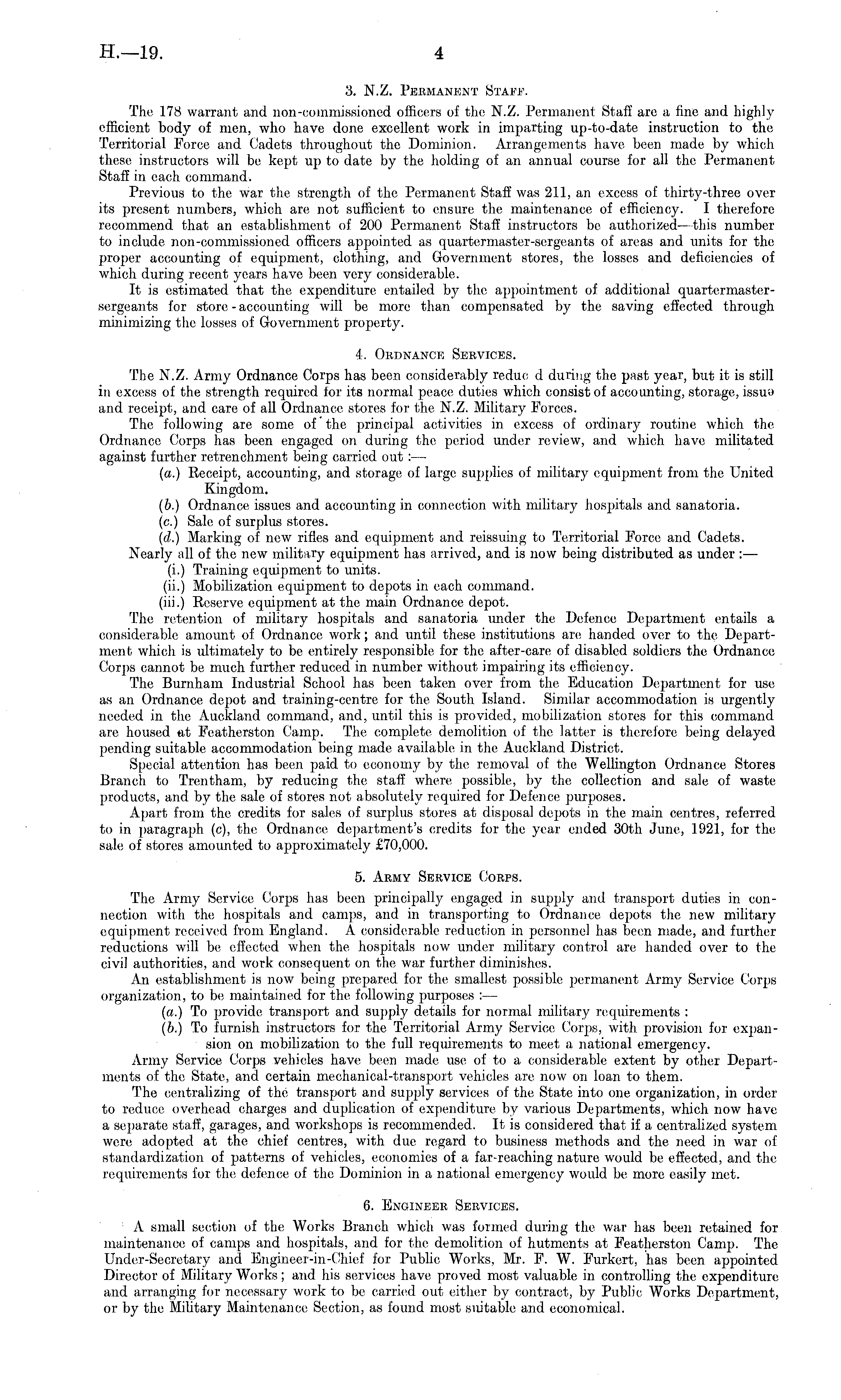 3. N.Z. Permanent Staff. The 178 warrant and non-commissioned officers of the N.Z. Permanent Staff are a fine and highly efficient body of men, who have done excellent work in imparting up-to-date instruction to the Territorial Force and Cadets throughout the Dominion. Arrangements have been made by which these instructors will be kept up to date by the holding of an annual course for all the Permanent Staff in each command. Previous to the war the strength of the Permanent Staff was 211, an excess of thirty-three over its present numbers, which are not sufficient to ensure the maintenance of efficiency. I therefore recommend that an establishment of 200 Permanent Staff instructors be authorized—this number to include non-commissioned officers appointed as quartermaster-sergeants of areas and units for the proper accounting of equipment, clothing, and Government stores, the losses and deficiencies of which during recent years have been very considerable. It is estimated that the expenditure entailed by the, appointment of additional quartermastersergeants for store - accounting will be more than compensated by the saving effected through minimizing the losses of Government property. 4. Ordnance Services. The N.Z. Army Ordnance Corps has been considerably reduc d during the past year, but it is still in excess of the strength required for its normal peace duties which consist of accounting, storage, issua and receipt, and care of all Ordnance stores for the N.Z. Military Forces. The following are some of the principal activities in excess of ordinary routine which the Ordnance Corps has been engaged on during the period under review, and which have militated against further retrenchment being carried out : — (a.) Receipt, accounting, and storage of large supplies of military equipment from the United Kingdom. (b.) Ordnance issues and accounting in connection with military hospitals and sanatoria, (c.) Sale of surplus stores. (d.) Marking of new rifles and equipment and reissuing to Territorial Force and Cadets. Nearly all of the new military equipment has arrived, and is now being distributed as under : — (i.) Training equipment to units. (ii.) Mobilization equipment to depots in each command, (iii.) Reserve equipment at the main Ordnance depot. The retention of military hospitals and sanatoria under the Defence Department entails a considerable amount of Ordnance work; and until these institutions are handed over to the Department which is ultimately to be entirely responsible for the after-care of disabled soldiers the Ordnance Corps cannot be much, further reduced in number without impairing its efficiency. The Burnham Industrial School has been taken over from the Education Department for use as an Ordnance depot and training-centre for the South Island. Similar accommodation is urgently needed in the Auckland command, and, until this is provided, mobilization stores for this command are housed at Featherston Camp. The complete demolition of the latter is therefore being delayed pending suitable accommodation being made available in the Auckland District. Special attention has been paid to economy by the, removal of the Wellington Ordnance Stores Branch to Trentham, by reducing the staff where possible, by the collection and sale of waste products, and by the sale of stores not absolutely required for Defence purposes, Apart from the credits for sales of surplus stores at disposal depots in the main centres, referred to in paragraph (c), the Ordnance department's credits for the year ended 30th June, 1921, for the sale of stores amounted to approximately £70,000. 5. Army Service Corps. The Army Service Corps has been principally engaged in supply and transport duties in connection with the hospitals and camps, and in transporting to Ordnance depots the new military equipment received from England. A considerable reduction in personnel has been made, and further reductions will be effected when the hospitals now under military control are handed over to the civil authorities, and work consequent on the war further diminishes. An establishment is now being prepared for the smallest possible permanent Army Service Corps organization, to be maintained for the following purposes : — (a.) To provide, transport and supply details for normal military requirements : (b.) To furnish instructors for the Territorial Army Service Corps, with provision for expansion on mobilization to the full requirements to meet a national emergency. Army Service Corps vehicles have been made use of to a considerable extent by other Departments of the State, and certain mechanical-transport vehicles are now on loan to them. The centralizing of the transport and supply services of the State into one organization, in order to reduce overhead charges and duplication of expenditure by various Departments, which now have a separate staff, garages, and workshops is recommended. It is considered that if a centralized system were adopted at the chief centres, with due regard to business methods and the need in war of standardization of patterns of vehicles, economies of a far-reaching nature would be effected, and the requirements for the defence of the Dominion in a national emergency would be more easily met. 6. Engineer Services, : A small section of the Works Branch which was formed during the war has been retained for maintenance of camps and hospitals, and for the demolition of hutments at Featherston Camp. The Under-Secretary and Engineer-in-Ohief for Public Works, Mr. F. W. Furkert, has been appointed Director of Military Works; and his services have proved most valuable in controlling the expenditure and arranging for necessary work to be carried out either by contract, by Public Works Department, or by the Military Maintenance Section, as found most suitable and economical.