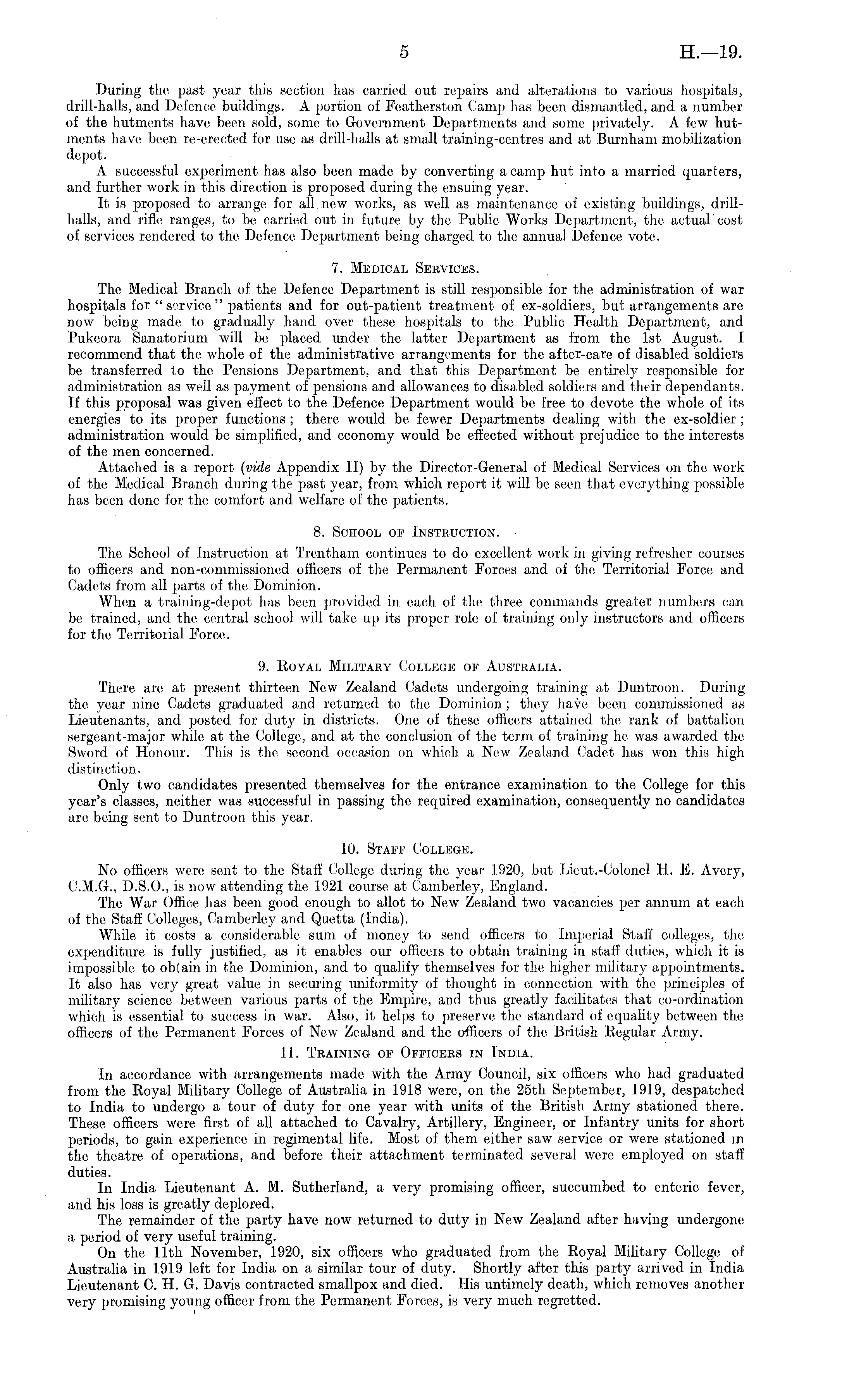 During the past year this section has carried out repairs and alterations to various hospitals, drill-halls, and Defence buildings. A portion of Featherston ('amp has been dismantled, and a number of the hutments have been sold, some to Government Departments and some privately. A few hutments have been re-erected for use as drill-halls at small training-centres and at Burnham mobilization depot. A successful experiment has also been made by converting a camp hut into a married quarters, and further work in this direction is proposed during the ensuing year. It is proposed to arrange for all new works, as well as maintenance of existing buildings, drillhalls, and rifle ranges, to be carried out in future by the Public Works Department, the actualcost of services rendered to the Defence Department being charged to the annual Defence vote. 7. Medical Services. The Medical Branch of the Defence Department is still responsible for the administration of war hospitals for " service " patients and for out-patient treatment of ex-soldiers, but arrangements are now being made to gradually hand over these hospitals to the Public Health Department, and Pukeora Sanatorium will be placed under the latter Department as from the Ist August. I recommend that the whole of the administrative arrangements for the after-care of disabled soldiers be transferred to the, Pensions Department, and that this Department be entirely responsible for administration as well as payment of pensions and allowances to disabled soldiers and their dependants. If this proposal was given effect to the Defence Department would be free to devote the whole of its energies to its proper functions ; there would be fewer Departments dealing with the ex-soldier ; administration would be simplified, and economy would be effected without prejudice to the interests of the men concerned. Attached is a report (vide Appendix II) by the Director-General of Medical Services on the work of the Medical Branch during the past year, from which report it will be seen that everything possible has been done for the comfort and welfare of the patients. 8. School of Instruction. The School of Instruction at Trentham continues to do excellent work in giving refresher courses to officers and non-commissioned officers of the Permanent Forces and of the Territorial Force and Cadets from all parts of the Dominion. When a training-depot has been provided in each of the three commands greater numbers can be trained, and the central school will take up its proper role of training only instructors and officers for the Territorial Force. 9. Royal Military College of Australia. There are at present thirteen New Zealand Cadets undergoing training at Duntroon. During the year nine Cadets graduated and returned to the Dominion ; they have been commissioned as Lieutenants, and posted for duty in districts. One of these officers attained the rank of battalion sergeant-major while at the College, and at the conclusion of the term of training he was awarded the Sword of Honour. This is the second occasion on which a New Zealand Cadet has won this high distinction. Only two candidates presented themselves for the entrance examination to the College for this year's classes, neither was successful in passing the required examination, consequently no candidates are being sent to Duntroon this year. 10. Staff College. No officers were sent to the Staff College during the year 1920, but Lieut.-Colonel H. E. Avery, C.M.G., D.5.0., is now attending the 1921 course at Camberley, England. The War Office has been good enough to allot to New Zealand two vacancies per annum at each of the Staff Colleges, (.'amberley and Quetta (India). While it costs a considerable sum of money to send officers to Imperial Staff colleges, the expenditure is fully justified, as it enables our officeis to obtain training in staff duties, which it is impossible to oblain in the, Dominion, and to qualify themselves for the higher military appointments. It also has very great value in securing uniformity of thought in connection with the principles of military science between various parts of the Empire, and thus greatly facilitates that co-ordination which is essential to success in war. Also, it helps to preserve the standard of equality between the officers of the Permanent Forces of New Zealand and the officers of the British Regular Army. 11. Training of Officers in India. In accordance with arrangements made with the Army Council, six officers who had graduated from the Royal Military College of Australia in 1918 were, on the 25th September, 1919, despatched to India to undergo a tour of duty for one year with units of the British Army stationed there. These officers were first of all attached to Cavalry, Artillery, Engineer, or Infantry units for short periods, to gain experience in regimental life. Most of them either saw service or were stationed in the theatre of operations, and before their attachment terminated several were employed on staff duties. In India Lieutenant A. M. Sutherland, a very promising officer, succumbed to enteric fever, and his loss is greatly deplored. The remainder of the party have now returned to duty in New Zealand after having undergone a period of very useful training. On the 11th November, 1920, six officers who graduated from the Royal Military College of Australia in 1919 left for India on a similar tour of duty. Shortly after this party arrived in India Lieutenant C. H. G. Davis contracted smallpox and died. His untimely death, which removes another very promising young officer from the Permanent Forces, is very much regretted.