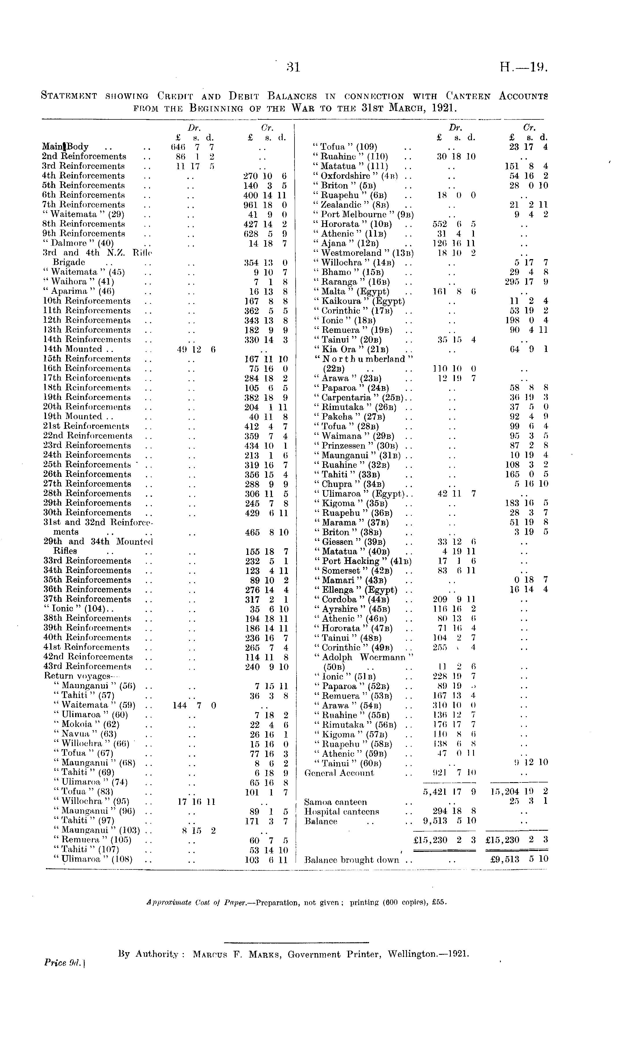 Dr. Or. Dr. Cr. £ s. d. £ s. (I. £ s. d. £ s. d. Main|Body .. .. 040 7 7 .. " Tofua" (109) .. .. 23 17 4 2nd Reinforcements .. SO I 2 .. "Ruahine" (110) .. 30 18 10 :ird Reinforcements .. 1! 17 5 .. " Matatua" (111) .. .. 151. 8 4 4th Reinforcements .. .. 270 10 0 " Oxfordshire" (4b) .. .. 54 10 2 sth Reinforcements .. .. 140 3 5 " Briton" (sb) .. .. 28 0 10 6th Reinforcements .. .. 400 14 11 " Ruapehu" (0b) .. 18 0 0 7th Reinforoements .. .. 961 18 0 " Zealandio" (8b) .. .. 21 211 " Waitemata " (29) .. .. 41 9 0 " Port Melbourne" (!) it) .. 0 4 2 Sth Hciiif,ii-ecmciil w .. 427 14 2 " Hororata" (10b) .. 552 0 5 9th Reinforcements .. .. 028 5 9 " Athenic" (11b) .. 31 4 1 " Dalmore" (40) .. .. 14 18 7 " Ajana" (12b) .. 120 ](( 11 3rd and 4th N.Z. Rifle " Westmoreland" (13n) IS 111 2 Brigade .. .. .. 354 13 0 " Willochra" (14b) .. .. 5 17 7 " Waitemata" (45) .. .. 010 7 '■ Bhamo" (15b) .. .. 29 4 8 " Waihora" (41) .. .. 7 18 " Raranga" (16b) .. .. 295 17 9 " Aparima " (46) .. .. 16 13 8 " Malta" (Egypt) .. 181 SO 10th Reinforcements .. .. 167 8 8 " Kaikoura" (Egypt) .. 11 2 4 11th Reinforcements .. .. 362 5 5 " Corinthic" (17b) .. .. 53 19 2 12th Reinforcements .. .. 343 13 8 " lonic" (18b) . . .. 198 0 4 13th Reinforcements .. .. 182 9 9 " Remuera" (19b) .. .. 90 411 14th Reinforcements .. .. 330 14 3 " Tainui" (20b) .. 36 15 4 14th Mounted .. 49 12 0 .. " Kia Ora" (21b) .. .. 04 9 1 15th Reinforcements .. .. 167 11 10 "Northumberland" 16th Reinforcements .. .. 75 16 0 (22b) .. .. 110 1(1 0 17th Reinforcements .. .. 284 18 2 " Arawa" (23b) .. 12 19 7 18th Reinforcements .. .. 105 0 5 " Paparoa" (24b) .. .. 58 S S 19th Reinforcements .. .. 382 18 9 " Carpentaria" (25b) . . .. 30 19 3 20th Reinforoements .. .. 204 111 " Rimutaka" (26b) .. .. 37 fi 0 19th Mounted .. .. .. 40 11 8 " Pakeha" (27b) .. .. 92 4 9 21st Reinforoements .. .. 412 4 7 " Tofua" (28b) .. .. 99 0 4 22nd Reinforcements . . .. 359 7 4 " Waimana" (29b) . . .. 95 3 5 23rd Reinforcements .. . . 434 10 1 " Prinzessen" (30b) . . .. 87 2 8 24th Reinforcements .. .. 213 1 0 " Maunganui" (31b) .. .. 10 19 4 25th Reinforcements ".. .. 319 16 7 " Ruahine" (32b) .. .. 108 3 2 26th Reinforcements .. .. 350 15 4 " Tahiti" (33b) .. .. 165 0 5 27th Reinforcements .. . . 288 9 9 " Chupra" (34b) .. .. 516 10 28th Reinforcements .. .. 306 11 5 " Ulimaroa" (Egypt). . 42 II 7 29th Reinforcements .. .. 245 7 8 " Kigoma" (35b) .. .. I S3 10 5 30th Reinforcements .. .. 429 611 " Ruapehu" (36b) .. .. 28 3 7 31st and 32nd Reinforce " Marama" (37b) .. .. 5119 8 ments .. .. .. 405 8 10 " Briton" (38b) .. .. 3 19 5 29th and 34th Mounted " Giessen" (39b) .. 33 12 0 Rifles .. .. .. 155 18 7 " Matatua" (40b) .. 419 11 33rd Reinforcements .. .. 232 5 1 " Port Hacking" (41b) 17 16 34th Reinforcements .. .. 123 411 " Somerset" (42b) .. 83 011 35th Reinforcements .. .. 89 10 2 " Mamari" (43b) .. .. 018 7 36th Reinforcements .. .. 276 14 4 " Ellenga" (Egypt) .. .. 10 14 4 37th Reinforcements .. .. 317 2 1 " Cordoba" (44b) .. 209 911 "lonic" (104).. .. .. 35 610 " Ayrshire" (45b) 110 Hi 2 38th Reinforcements .. .. 194 18 I I " Athenie" (46b) .. SO 13 6 39th Reinforcements .. .. 180 14 11 " Hororata" (47b) .. 71 16 4 40th Reinforcements .. .. 230 10 7 " Tainui" (48b) .. 104 2 7 41st Reinforcements .. . . 205 7 4 " Corinthic" (49b) . . 255 i. 4 42nd Reinforcements .. .. 114 11 8 " Adolph Woermann" 43rd Reinforcements .. .. 240 910 (50b) .. .. 11 2 0 Return voyages-- " lonic" (51 b) .. 228 19 7 " Maunganui" (56) .. .. 715 11 " Paparoa" (52b) .. 89 19 -■ "Tahiti "(57) .. .. 36 3 8 " Remuera" (53b) 107 13 I " Waitemata" (59) .. 144 7 0 .. "Arawa" (54b) .. 310 10 I) " Ulimaroa" (60) .. .. 718 2 " Ruahine" (55b) .. 130 12 7 " Mokoia" (02) .. .. 22 4 6 " Rimutaka" (56b) .. 176 17 7 "Navua"(63) .. .. 26 10 I " Kigoma" (57b) .. 110 8 0 " Willochra" (66) .. .. 15 10 0 " Ruapehu " (58b) 138 6 8 "Tofua "(07) .. .. 77 10 3 " Athenic" (59b) .. 17 0I I " Maunganui" (08) .. .. 8 6 2 " Tainui" (60b) .. .. 9 12 10 "Tahiti" (69) .. .. 618 9 General Account .. 921 710 " Ulimaroa" (74) .. .. 65 10 8 "Tofua" (83) .. .. 101 1 7 5,421 17 9 15,204 19 2 " Willochra" (95) .. 17 10 11 .. Samoa canteen .. .. 25 3 1 " Maunganui" (96) .. .. 89 1 5 Hospital oanteens .. 294 18 8 "Tahiti "(97) .. .. 171 3 7 Balance .. .. 9,513 510 "Maunganui" (103) .. 8 15 2 .. — "Remuera" (105) .. .. 60 7 5 £15,230 2 3 £15,230 2 3 "Tahiti" (107) .. .. 53 14 10 , — — - "Ulimaroa" (108) .. .. 103 Oil Balance brought down .. .. £9,513 510