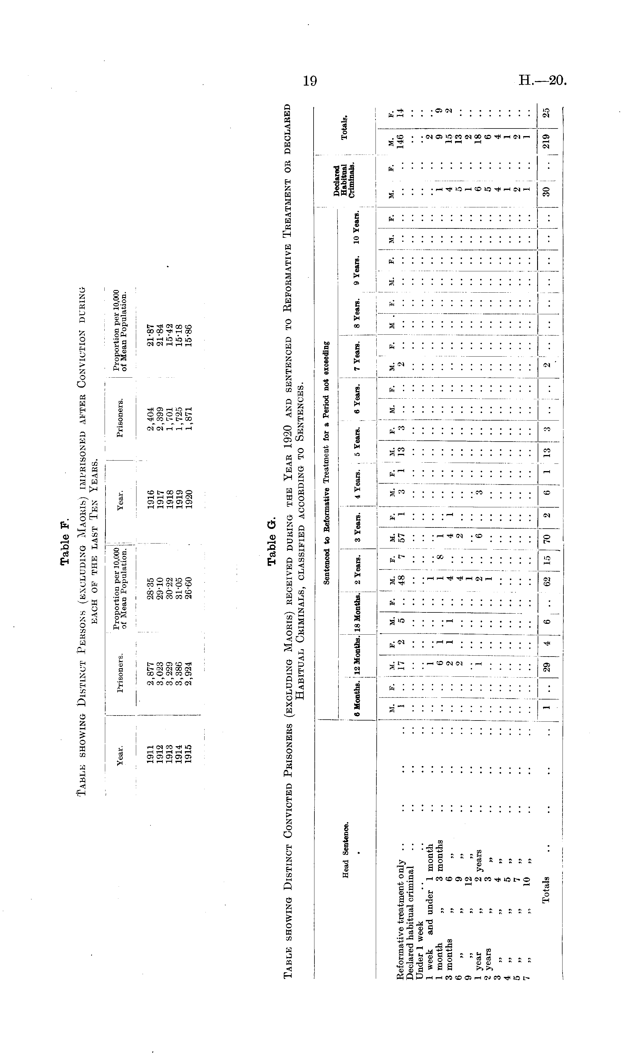 Table G. Table showing Distinct Convicted Prisoners (excluding Maoris) received during the Year 1920 and sentenced to Reformative Treatment or declared Habitual Criminals, classified according to Sentences.