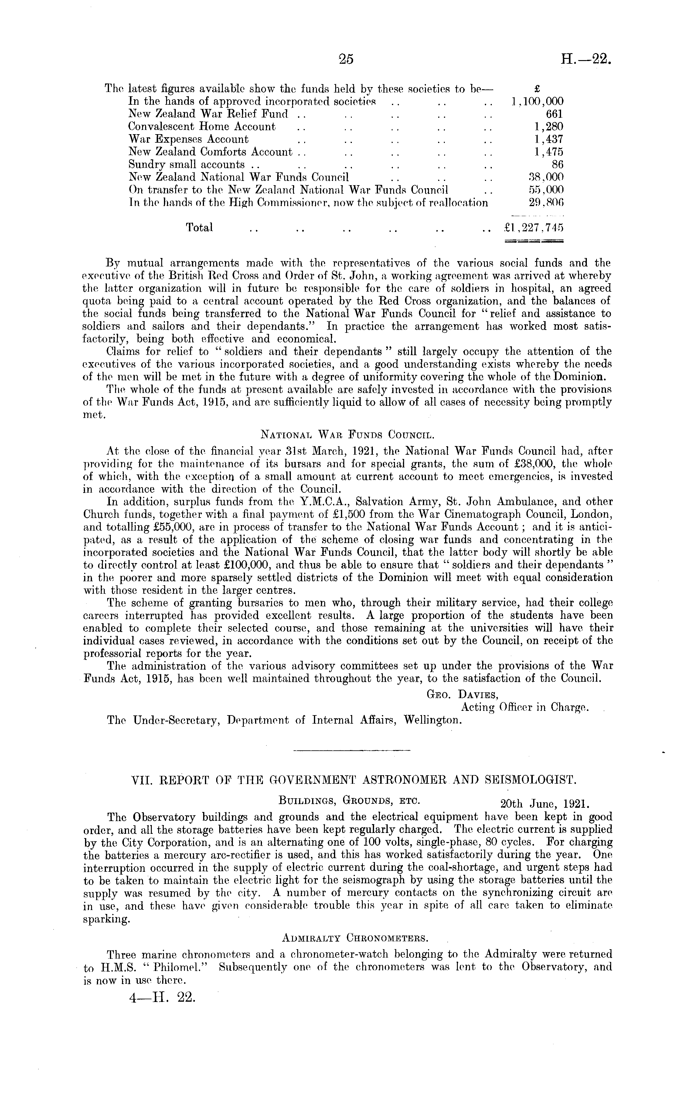 The latest figures available show the funds held by these societies to be — £ In the hands of approved incorporated societies .. .. .. 1,100,000 New Zealand War Relief Fund. . . . . . . . . . . 661 Convalescent Home Account . . . . .. . . .. 1,280 War Expenses Account .. .. .. .. .. 1,437 New Zealand Comforts Account . . .. . . . . . . 1,475 Sundry small accounts .. . . .. . . . . . . 86 New Zealand National War Funds Council .. .. .. 38.000 On transfer to the New Zealand National War Funds Council .. 55,000 In the hands of the High Commissioner, now tin- subject of reallocation 29.806 Total .. .. .. .. .. .. £1,227,745 By mutual arrangements made with the representatives of the various social funds and the executive of the British Red Cross and Order of St. John, a working agreement was arrived at whereby the latter organization will in future be responsible for the care of soldiers in hospital, an agreed quota, being paid to a central account operated by the Red Cross organization, and the balances of the social funds being transferred to the National War Funds Council for "relief and assistance to soldiers and sailors and their dependants." In practice the arrangement has worked most satisfactorily, being both effective and economical. Claims for relief to " soldiers and their dependants " still largely occupy the attention of the executives of the various incorporated societies, and a good understanding exists whereby the needs of the men will be met in the future with a degree, of uniformity covering the whole of the Dominion. The whole of the funds at present available are safely invested in accordance with the provisions of the War Funds Act, 1915, and are sufficiently liquid to allow of all cases of necessity being promptly met. National War Funds Council. At the. close of the financial year 31st March, 1921, the National War Funds Council had, after providing for the maintenance of its bursars and for special grants, the sum of £38,000, the whole of which, with the exception of a small amount at current account to meet emergencies, is invested in accordance with the direction of the Council. In addition, surplus funds from the V.M.C.A., Salvation Army, St. John Ambulance, and other Church funds, together with a final payment of £1,500 from the War Cinematograph Council, London, and totalling £55,000, are in process of transfer to the National War Funds Account; and it is anticipated, as a result of the application of the scheme of closing war funds and concentrating in the incorporated societies and the National War Funds Council, that the latter body will shortly be able to directly control at least £100,000, arid thus be able to ensure that " soldiers and their dependants " in the poorer and more sparsely settled districts of the Dominion will meet with equal consideration with those resident in the larger centres. The scheme of granting bursaries to men who, through their military service, had their college careers interrupted has provided excellent results. A large proportion of the students have been enabled to complete their selected course, and those remaining at the universities will have their individual cases reviewed, in accordance with the conditions set out by the Council, on receipt of the professorial reports for the year. The administration of the various advisory committees set up under the provisions of the War Funds Act, 1915, has been well maintained throughout the year, to the satisfaction of the Council. Geo. Davies, Acting Officer in Charge. The Under-Secretary, Department of Internal Affairs, Wellington.