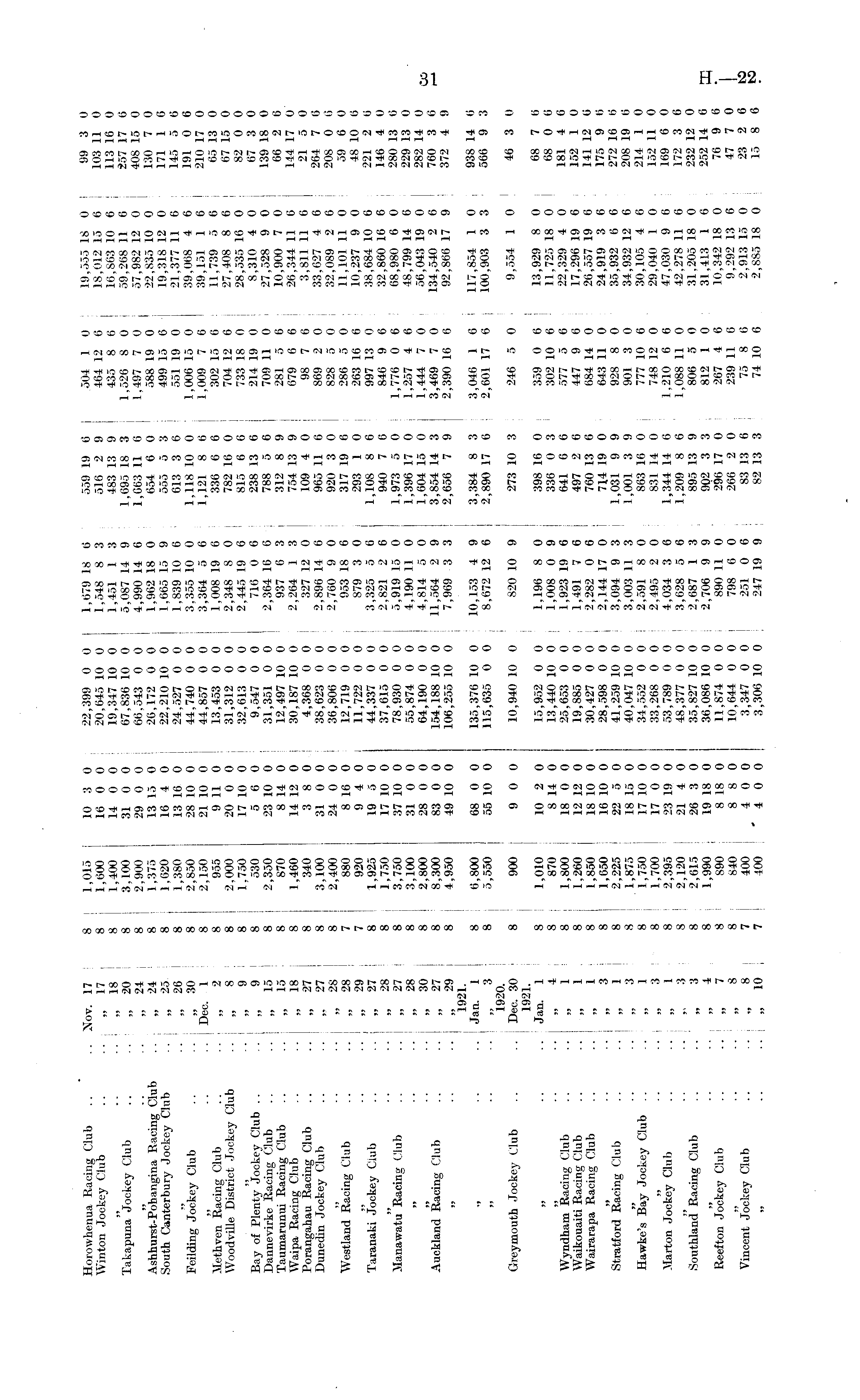 Horowhenua Racing Club Winton Jockey Club Takapuna Jockey Club Ashhurst-Pohangina Racing Club South Canterbury Jockey Club Feilding Jockey Club Methven Racing Club Woodville District Jockey Club Bay of Plenty Jockey Club .. Dannevirke Racing Club Taumarunui Racing Club Waipa Racing Club Porangahau Racing Club Dunedin Jockey Club Westland Racing Club Taranaki Jockey Ciub Manawatu Racing Ciub Auckland Racing Club Greymouth Jockey Club Wyndham Racing Club Waikouaiti Racing Club Wairarapa Racing Club Stratford Racing Club Hawke's Bay Jockey Club Marton Jockey Club Southland Racing Club Reefton Jockey Club Vincent Jockey Ciub .. Nov. 17 „ 17 „ 18 „ 20 „ 24 „ 24 „ 25 „ 26 „ 30 .. Dec. 1 8 9 9 „ 15 „ 15 „ 18 „ 27 ,.27 „ 28 „ 28 -■ ; „ 29 „ 27 „ 28 „ 27 „ 28 .. | „ 30 .- » 27 .. | „ 29 1921. .. I Jan. 1 - „ 3 1920. Dec. 30 1921. Jan. 1 4 1 1 1 3 1 .. „ 3 3 4 7 8 8 „ 10 , 8 8 8 8 8 8 8 8 8 8 8 8 8 8 8 8 8 8 7 7 8 8 8 8 8 8 8 8 8 8 S 8 8 8 8 8 8 8 8 8 8 8 8 8 8 8 7 7 1,015 1,000 1,400 3,100 2,900 1,375 1,620 1,380 2,850 2,150 955 2.000 1.750 530 2,350 870 1,400 340 3,100 2,400 880 920 1,925 1.750 3.750 3,100 2,800 8,300 4,950 6,800 5,550 900 1,010 870 1,800 1,260 1,850 1,650 2,225 1,875 1.75(1 1,700 2,395 2,120 2.015 1,990 890 840 400 400 10 3 0 16 0 0 14 0 0 31 0 0 29 0 0 13 15 0 16 4 0 13 16 0 28 10 0 21 10 0 9 11 0 20 0 0 17 10 0 5 6 0 23 10 0 8 14 0 14 12 0 3 8 0 31 0 0 24 0 0 8 16 0 9 4 0 19 5 0 17 10 0 37 10 0 31 0 0 28 0 0 83 0 0 49 10 0 22,399 0 0 20,645 10 0 19,347 10 0 67,836 10 0 66.543 0 0 20.172 0 0 22,210 10 0 24.527 0 0 44,740 0 0 44,857 0 0 13,453 0 0 31,312 0 0 32,613 0 0 9,547 0 0 31,351 0 0 12,497 10 0 30,187 10 0 4,368 0 0 i 38,623 0 0 36,806 0 0 12,719 0 0 ; 11,722 0 0 44,337 0 0 37,615 0 0 78,930 0 0 55,874 0 0 64,190 0 0 154,188 10 0 106,255 10 0 1,679 18 6 1,548 8 3 1,451 1 3 5.0S7 14 9 4,990 14 6 1,962 18 0 1,665 15 9 1,839 10 6 3,355 10 0 3,364 5 6 1,008 19 6 2,348 8 0 2,445 19 6 716 0 6 2,364 16 6 937 6 3 2,264 1 3 327 12 0 2.896 14 6 2,760 9 0 953 18 6 879 3 0 3,325 5 6 2,821 2 6 5,919 15 0 4,190 11 0 4,814 5 0 11,564 2 9 7,969 3 3 559 19 6 516 2 9 483 13 9 1,695 18 3 1,063 11 6 654 6 0 555 5 3 613 3 6 1,118 10 0 1,121 8 6 336 6 6 782 16 0 815 6 6 238 13 6 788 5 6 312 8 9 754 13 9 109 4 0 965 11 6 920 3 0 317 19 6 i 293 1 0 1,108 8 6 940 7 6 1,973 5 0 1,396 17 0 1,604 15 0 3,854 14 3 2,656 7 9 504 1 0 464 12 6 435 8 6 1,526 8 0 1,497 7 0 588 19 0 499 15 6 551 19 0 1,006 15 0 1,009 7 6 302 15 (i 704 12 6 733 18 0 214 19 0 709 11 0 281 5 6 679 6 6 98 7 6 869 2 0 828 5 0 286 5 0 263 16 6 997 13 0 846 9 6 1,776 0 6 . 1,257 4 6 1,444 7 0 3,469 7 0 2,390 16 6 19,555 18 0 18,012 15 6 16,863 10 6 59,268 11 6 57,982 12 0 22,835 10 0 19,318 12 0 21,377 11 6 39,068 4 6 39,151 1 6 i 11,739 5 6 27,408 8 6 ; 28,535 16 0 8,310 4 0 ; 27,528 9 0 ; 10,900 7 0 26,344 11 6 3,811 11 6 33,027 4 6 32,089 2 6 11,101 11 0 10,237 9 0 38,684 10 6 32,860 16 6 68,980 6 0 48,799 14 6 56,043 19 0 134,540 2 6 92,866 17 9 99 3 0 103 11 0 113 16 0 257 17 6 408 15 0 130 7 0 171 1 6 145 5 6 191 0 6 210 17 0 65 13 0 67 15 0 82 0 0 67 3 0 139 18 0 66 2 6 144 17 0 21 5 0 264 7 6 208 0 0 59 6 0 4S 10 0 221 2 6 146 4 0 280 13 0 229 13 0 282 14 0 760 3 6 372 4 9 68 0 0 | 55 10 0 135,376 10 0 115,635 0 0 10,153 4 9 S,672 12 6 3,384 8 3 2,890 17 6 3,046 1 6 I 2,601 17 6 117.854 1 0 100,903 3 3 938 14 (i 566 9 3 9 0 0 i 10,940 10 0 820 10 9 273 10 3 246 5 0 9,554 1 0 46 3 0 10 2 0 S 14 0 18 0 0 12 12 0 18 10 0 16 10 0 22 5 0 18 15 0 17 10 0 17 0 0 23 19 0 21 4 0 26 3 0 19 18 0 8 18 0 8 8 0 4 0 0 '400 15,952 0 0 13,440 10 0 i 25,653 0 0 19,885 0 0 | 30.427 0 0 28,598 0 0 41,259 10 0 40,047 10 0 34,552 0 0 33,268 0 0 53,789 0 0 48,377 0 0 35,827 10 0 36,086 10 0 11.874 0 0 10,644 0 0 3,347 0 0 3,306 10 0 1,196 8 0 1,008 0 9 1,923 19 6 1,491 7 6 2,282 0 6 2,144 17 0 3,094 9 3 3,003 11 3 2,591 8 0 2,495 2 0 4,034 3 6 3,628 5 6 2,687 1 3 2,706 9 9 890 11 0 798 6 0 251 0 6 247 19 9 i 398 16 0 336 0 3 641 6 6 497 2 6 760 13 6 714 19 0 1,031 9 9 1,001 3 9 863 16 0 831 14 0 1,344 14 6 1,209 8 6 895 13 9 902 3 3 296 17 0 266 2 0 83 13 6 82 13 3 359 0 6 : 302 10 6 577 5 6 447 9 6 684 14 0 643 11 0 928 8 0 901 3 0 777 10 6 748 12 0 1.210 6 6 1,088 11 0 806 5 0 812 1 0 267 4 6 239 11 6 75 8 6 74 10 6 13,929 8 0 11,725 18 0 22,329 4 0 17,296 19 6 26,557 19 6 24,919 3 6 35,932 6 6 34,932 12 6 30,105 4 6 29,040 1 0 47,030 9 6 42,278 11 6 31,205 18 0 31,413 1 6 10,342 18 0 9,292 13 6 2,913 15 0 2.SS5 18 0 68 7 6 68 0 6 181 4 6 152 1 0 141 12 6 175 9 6 272 16 6 208 19 6 214 1 0 152 11 0 169 6 0 172 3 6 232 12 0 252 14 6 76 9 6 47 7 0 23 2 6 15 8 6