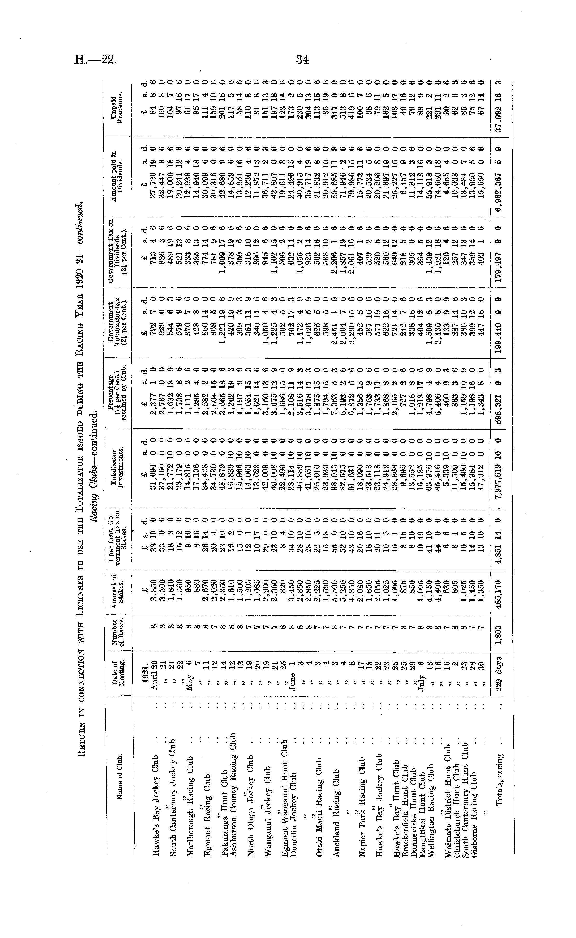 Name of Club. Date of Meeting. Number of Races. . + nt j 1 per Cent. GoA ™°™ ° I vernment Tax on Stakes. Stakes. Totalizator Investments. Percentage (7| per Cent.) retained by Club. Government Totalizator-tax (2i per Cent.). Government Tax on Dividends (21 per Cent.). Amount paid in Dividends. Unpaid Fractious. Hawke's Bay Jockey Club South Canterbury Jockey Club Marlborough Racing Club Egmont Racing Club Pakuranga Hunt Club Ashburton County Racing Club North Otago Jockey Olub Wanganui Jockey Club Egmont-Wanganui Hunt Club Dunedin Jockey Club Otaki Maori Racing Club Auckland Racing Club Napier Park Racing Club Hawke's Bay Jockey Club .. Hawke's Bay Hunt Club Brackenfield Hunt Club Dannevirke Hunt Club Rangitikei Hunt Club Wellington Racing Club Waimate District Hunt Club Christchurch Hunt Club South Canterbury Hunt Club Gisborne Racing Club Totals, racing 1921. .. April 20 „ 21 „ 21 „ 22 .. Mav 6 .. „ 11 „ 12 „ 14 -. „ 12 „ 13 .. ! „ 19 ■ - „ 20 „ 19 „ 21 .. | „ 25 . . : June 1 .. ! „ 3 .. I „ 3 „ 4 „ 3 „ 4 „ .8 „ 17 „ 18 „ 22 „ 23 „ 25 „ 25 „ 29 July 6 „ 13 „ 16 - „ 16 „ 2 - - „ 23 - - „ 28 -. j „ 30 .. 229 days 8 8 8 8 8 8 8 7 8 8 8 7 7 7 7 8 8 8 8 7 7 8 7 7 7 7 7 7 7 8 7 8 8 8 7 8 8 7 7 £ 3,850 3,300 1,840 1,560 950 880 2,670 2,020 2,350 1,610 1,500 1,205 1,085 2,900 2,350 820 3,450 2,850 2,850 2,225 1,590 5,500 5,250 4,350 2,080 1,850 2,055 1,025 1,605 875 850 1,095 4.150 4,400 630 805 1,025 1,450 1,350 £ s. d. 38 10 0 33 0 0 18 8 0 15 12 0 9 10 0 8 16 0 26 14 0 20 4 0 23 10 0 16 2 0 15 0 0 12 1 0 10 17 0 29 0 0 23 10 0 8 4 0 34 10 0 28 10 0 28 10 0 22 5 0 15 18 0 55 0 0 52 10 0 43 10 0 20 16 0 18 10 0 20 11 0 10 5 0 16 1 0 8 15 0 8 10 0 10 19 0 41 10 0 44 0 0 6 6 0 8 1 0 10 5 0 14 10 0 13 10 0 £ s. d. 31,694 0 0 37,160 0 0 21,772 10 0 23,179 0 0 14,815 0 0 17,136 0 0 34.428 0 0 34,730 0 0 48,879 0 0 16,839 10 0 15,966 10 0 14,063 10 0 13,623 0 0 42.009 0 0 49,008 10 0 22,490 0 0 28,114 10 0 46,889 10 0 41,051 10 0 25.010 0 0 23,930 0 0 98,043 10 0 82,575 0 0 91,631 0 0 18,090 0 0 23,513 0 0 23,118 0 0 24,912 0 0 28,868 0 0 9,695 0 0 13,552 0 0 16,185 0 0 63,976 10 0 85,416 0 0 5,339 10 0 11,509 0 0 15,460 10 0 15,984 0 0 17,912 0 0 £ s. d. 2,377 1 0 2,787 0 0 1,632 18 9 1,738 8 6 1,111 2 6 1,285 4 0 2,582 2 0 2,604 15 0 3,665 18 6 1,262 19 3 1.197 9 9 1,054 15 3 1,021 14 6 3,150 13 6 3,675 12 9 1,686 15 0 2,108 11 9 3,516 14 3 3,078 17 3 1,875 15 0 1,794 15 0 7,353 5 3 6,193 2 6 6,872 6 6 1,356 15 0 1,763 9 6 1,733 17 0 1,868 8 0 2,165 2 0 727 2 6 1,016 8 0 1,213 17 6 4,798 4 9 6,406 4 0 400 9 3 863 3 6 1,159 10 9 1.198 16 0 1,343 8 0 £ s. d. 792 7 0 929 0 0 544 6 3 579 9 6 370 7 6 428 8 0 860 14 0 868 5 0 1,221 19 6 420 19 9 399 3 3 351 11 9 340 11 6 1,050 4 6 1,225 4 3 562 5 0 702 17 3 1,172 4 9 1,026 5 9 625 5 0 598 5 0 2,451 1 9 2,064 7 6 2,290 15 6 452 5 0 587 16 6 577 19 0 622 16 0 721 14 0 242 7 6 338 16 0 404 12 6 1,599 8 3 2,135 8 0 133 9 9 287 14 6 386 10 3 399 12 0 447 16 0 £ s. d. 713 4 6 836 3 6 489 19 6 521 13 0 333 8 6 385 13 0 774 14 0 781 9 6 1,099 17 6 378 19 6 359 6 6 316 10 6 306 12 0 945 6 6 1,102 15 0 506 2 6 632 14 0 1,055 2 0 923 14 6 562 16 0 538 10 6 2,206 1 6 1,857 19 6 2,061 16 0 407 1 6 529 2 6 520 5 0 560 12 0 649 12 0 218 5 0 305 0 0 364 5 0 1,439 12 0 1,921 18 6 120 4 6 257 12 6 347 18 6 359 14 0 403 1 6 £ s. d. 27,726 19 0 32,447 8 6 19,000 18 6 20,241 12 6 12,938 4 6 14,940 18 0 30,099 6 0 30,316 0 0 42,689 9 6 14.659 6 0 13,951 16 0 12,230 4 6 11,872 13 6 36,711 2 3 42,807 0 0 19,611 3 0 24,496 15 0 40,915 4 0 35,717 19 6 21,832 8 6 20,912 10 0 85,685 11 9 71,946 2 6 79,986 15 6 15,773 11 6 20,534 5 6 20,206 8 0 21,697 19 0 25,227 15 0 8,457 9 0 11,812 3 6 14,113 16 0 55,918 3 0 74.660 18 0 4,655 4 0 10,038 0 0 13,481 7 0 13.950 5 6 15,650 0 6 £ s. d. 84 8 6 160 8 0 104 7 0 97 16 6 61 17 0 95 17 0 111 4 0 159 10 6 201 15 0 117 5 6 58 14 6 110 8 0 81 8 6 151 13 3 197 18 0 123 14 6 173 2 0 230 5 0 304 13 0 113 15 6 85 19 6 347 9 9 513 8 0 419 6 6 100 7 0 98 6 0 79 11 0 162 5 0 103 17 0 49 16 0 79 12 6 88 9 0 221 2 0 291 11 6 30 2 6 62 9 6 85 3 6 75 12 6 67 14 0 1,803 I 485,170 485,170 4,851 14 0 7,977,619 10 0 598,321 9 3 199,440 9 9 179,497 9 0 6,962,367 5 9 37,992 16 3