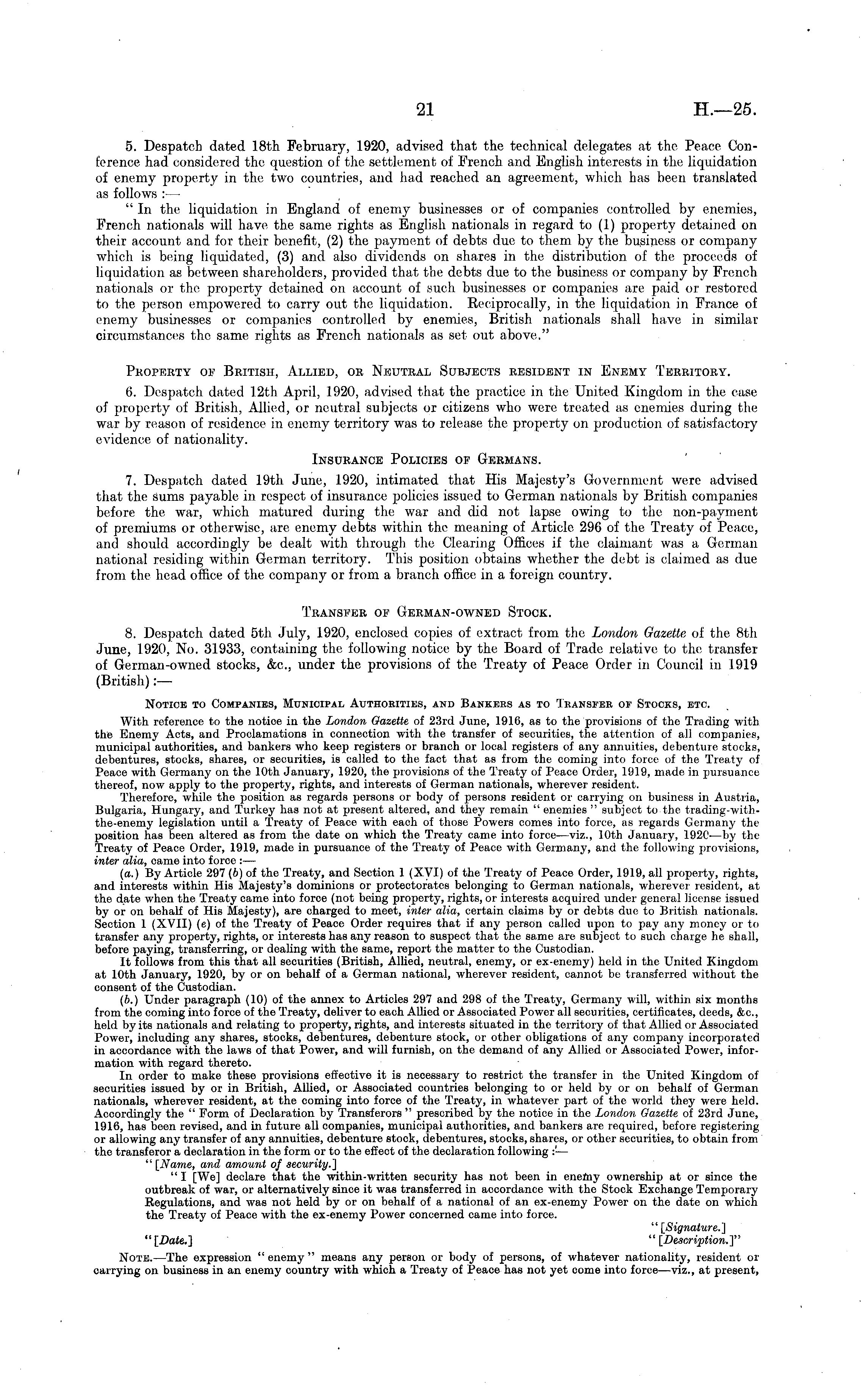 5. Despatch dated 18th February, 1920, advised that the technical delegates at the Peace Conference had considered the question of the settlement of French and English interests in the liquidation of enemy property in the two countries, and had reached an agreement, which has been translated as follows :— " In the liquidation in England of enemy businesses or of companies controlled by enemies, French nationals will have the same rights as English nationals in regard to (1) property detained on their account and for their benefit, (2) the payment of debts due to them by the business or company which is being liquidated, (3) and. also dividends on shares in the distribution of the proceeds of liquidation as between shareholders, provided that the debts due to the business or company by French nationals or the property detained on account of such businesses or companies are paid or restored tt) the person empowered to carry out the liquidation. Reciprocally, in the liquidation in France of enemy businesses or companies controlled by enemies, British nationals shall have in similar circumstances tho same rights as French nationals as set- out above." Property of British, Allied, or Neutral Subjects resident in Enemy Territory. 6. Despatch dated 12th April, 1920, advised that the practice in the United Kingdom in the case of property of British, Allied, or neutral subjects or citizens who were treated as enemies during the war by reason of residence in enemy territory was to release the property on production of satisfactory evidence of nationality. Insurance Policies of Germans. 7. Despatch dated 19th June, 1920, intimated that His Majesty's Government were advised that the sums payable in respect of insurance policies issued to German nationals by British companies before the war, which matured during the war and did not lapse owing to the non-payment of premiums or otherwise, are enemy debts within the meaning of Article 296 of the Treaty of Peace, and should accordingly be dealt with through the Clearing Offices if the claimant was a German national residing within German territory. This position obtains whether the debt is claimed as due from the head office of the company or from a branch office in a foreign country. Transfer of German-owned Stock. 8. Despatch dated sth July, 1920, enclosed copies of extract from the London Gazette of the Bth June, 1.920, No. 31933, containing the following notice by the Board of Trade relative to the transfer of German-owned stocks, &c, under the provisions of the Treaty of Peace Order in Council in 1919 (British):—Notice to Companies, Municipal Authorities, and Bankers as to Transfer of Stocks, etc. With reference to the notice in the London Gazette of 23rd June, 1916, as to the provisions of the Trading with the Enemy Acts, and Proclamations in connection with the transfer of securities, the attention of all companies, municipal authorities, and bankers who keep registers or branch or local registers of any annuities, debenture stocks, debentures, stocks, shares, or securities, is called to the fact that as from the coming into force of the Treaty of Peace with Germany on the 10th January, 1920, the provisions of the Treaty of Peace Order, 1919, made in pursuance thereof, now apply to the property, rights, and interests of German nationals, wherever resident. Therefore, while the position as regards persons or body of persons resident or carrying on business in Austria, Bulgaria, Hungary, and Turkey has not at present altered, and they remain " enemies " subject to the trading-with-the-enemy legislation until a Treaty of Peace with each of those Powers comes into force, as regards Germany the position has been altered as from the date on which the Treaty came into force—viz., 10th January, 1920—by the Treaty of Peace Order, 1919, made in pursuance of the Treaty of Peace with Germany, and the following provisions, inter alia, came into force t — (o.) By Article 297 (b) of the Treaty, and Section 1 (XVI) of the Treaty of Peace Order, 1919, all property, rights, and interests within His Majesty's dominions or protectorates belonging to German nationals, wherever resident, at the date when the Treaty came into force (not being property, rights, or interests acquired under general license issued by or on behalf of His Majesty), are charged to meet, inter alia, certain claims by or debts due to British nationals. Section 1 (XVII) (c) of the Treaty of Peace Order requires that if any person called upon to pay any money or to transfer any property, rights, or interests has any reason to suspect that the same are subject to such charge he shall, before paying, transferring, or dealing with the same, report the matter to the Custodian. It follows from this that all securities (British, Allied, neutral, enemy, or ex-enemy) held in the United Kingdom at 10th January, 1920, by or on behalf of a German national, wherever resident, cannot be transferred without the consent of the Custodian. (b.) Under paragraph (10) of the annex to Articles 297 and 298 of the Treaty, Germany will, within six months from the coming into force of the Treaty, deliver to each Allied or Associated Power all securities, certificates, deeds, &c, held by its nationals and relating to property, rights, and interests situated in the territory of that Allied or Associated Power, including any shares, stocks, debentures, debenture stock, or other obligations of any company incorporated in accordance with the laws of that Power, and will furnish, on the demand of any Allied or Associated Power, information with regard thereto. In order to make these provisions effective it is necessary to restrict the transfer in the United Kingdom of securities issued by or in British, Allied, or Associated countries belonging to or held by or on behalf of German nationals, wherever resident, at the coming into force of the Treaty, in whatever part of the world they were held. Accordingly the " Form