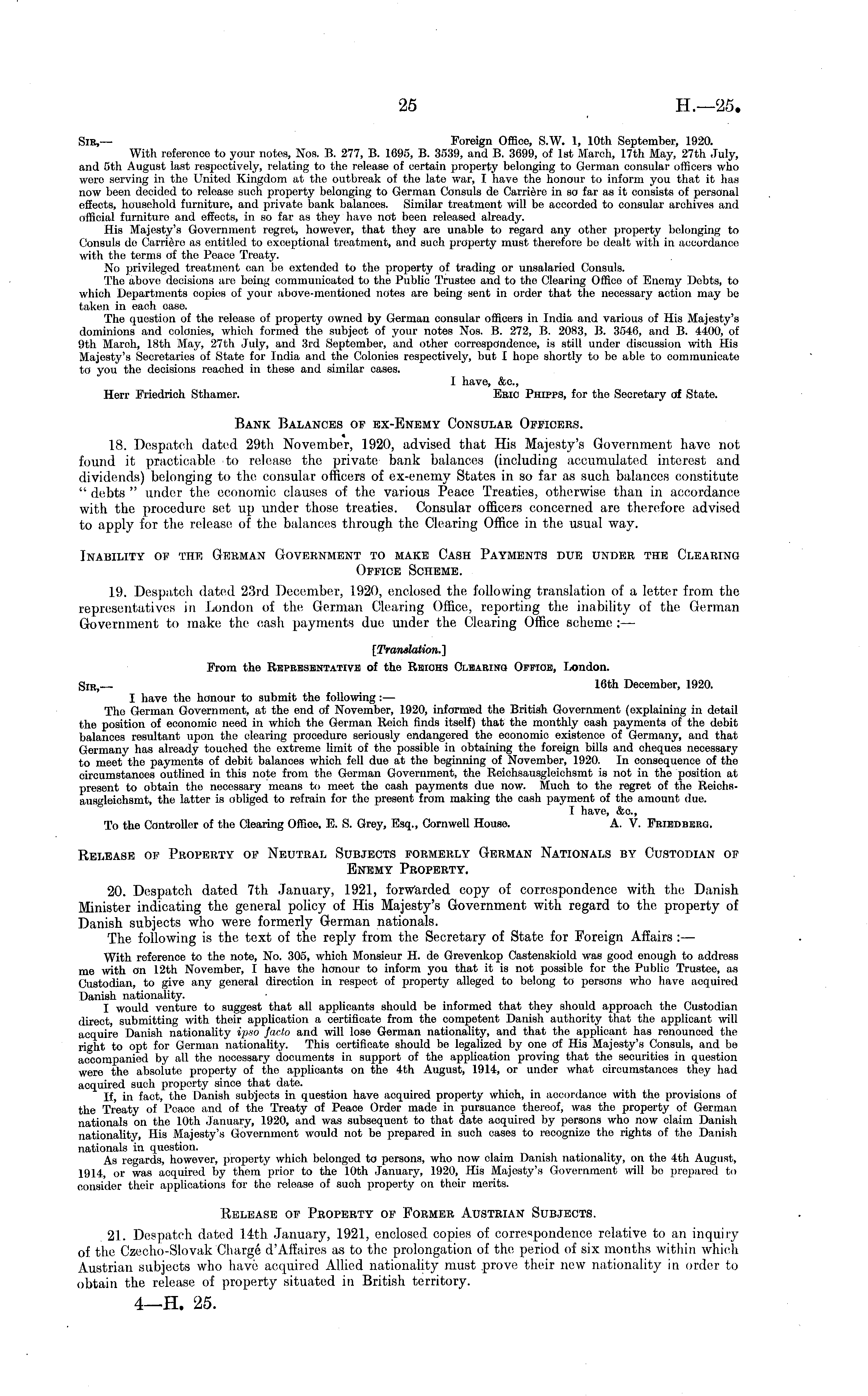 Sib,— Foreign Office, S.W. 1, 10th September, 1920. With reference to your notes, Nos. B. 277, B. 1695, B. 3539, and B. 3699, of Ist March, 17th May, 27th July, and sth August last respectively, relating to the release of certain property belonging to German consular officers who were serving in the United Kingdom at the outbreak of the late war, I have the honour to inform you that it has now been decided to release such property belonging to German Consuls de Carriere in so far as it consists of personal effects, household furniture, and private bank balances. Similar treatment will be accorded to consular archives and official furniture and effects, in so far as they have not been released already. His Majesty's Government regret, however, that they are unable to regard any other property belonging to Consuls do Carriere as entitled to exceptional treatment, and such property must therefore bo dealt with in accordance with the terms of the Peace Treaty. No privileged treatment can be extended to the property of trading or unsalaried Consuls. The above decisions are being communicated to the Public Trustee and to the Clearing Office of Enemy Debts, to which Departments copies of your above-mentioned notes are being sent in order that the necessary action may be taken in each oase. The question of the release of property owned by German consular officers in India and various of His Majesty's dominions and colonies, which formed the subject of your notes Nos. B. 272, B. 2083, B. 3546, and B. 4400, of 9th Maroh, 18th May, 27th July, and 3rd September, and other correspondence, is still under discussion with His Majesty's Secretaries of State for India and the Colonies respectively, but I hope shortly to be able to communicate to you the decisions reached in these and similar cases. I have, &c., Herr Friedrich Sthamer. Eric Phipps, for the Secretary of State. Bank Balances op ex-Enemy Consular Officers. 18. Despatch dated 29th November, 1920, advised that His Majesty's Government have not found it practicable to release the private bank balances (including accumulated interest and dividends) belonging to the consular officers of ex-enemy States in so far as such balances constitute " debts " under the economic clauses of the various Peace Treaties, otherwise than in accordance with the procedure set up under those treaties. Consular officers concerned are therefore advised to apply for the release of the balances through the Clearing Office in the usual way. Inability of the German Government to make Cash Payments due under the Clearing Office Scheme. 19. Despatch dated 23rd December, 1920, enclosed the following translation of a letter from the representatives in London of the German Clearing Office, reporting the inability of the German Government to make the cash payments due under the Clearing Office scheme : — [Translation.] From the Representative of the Rbichs Clearing Office, London. Sir,— 16th December, 1920. I have the honour to submit the following:— The German Government, at the end of November, 1920, informed the British Government (explaining in detail the position of economic need in which the German Reich finds itself) that the monthly cash payments of the debit balances resultant upon the clearing procedure seriously ondangered the economic existence of Germany, and that Germany has already touched the extreme limit of the possible in obtaining the foreign bills and cheques necessary to meet the payments of debit balances which fell due at the beginning of November, 1920. In consequence of the circumstances outlined in this note from the German Government, the Reichsausgloiohsmt is not in the position at present to obtain the necessary means to meet the cash payments due now. Much to the regret of the Reiehsausgleichsmt, the latter is obliged to refrain for the present from making the cash payment of the amount due. I have, &0., To the Controller of the Clearing Office. E. S. Grey, Esq., Cornwell House. A. V. Friedberg. Release op Property of Neutral Subjects formerly German Nationals by Custodian of Enemy Property. 20. Despatch dated 7th January, 1921, forwarded copy of correspondence with the Danish Minister indicating the general policy of His Majesty's Government with regard to the property of Danish subjects who were formerly German nationals. The following is the text of the reply from the Secretary of State for Foreign Affairs : — With reference to the note, No. 305, which Monsieur H. de Grevenkop Castenskiold was good enough to address me with on 12th November, I have the honour to inform you that it is not possible for the Public Trustee, as Custodian, to give any general direction in respect of property alleged to belong to persons who have acquired Danish nationality. I would venture to suggest that all applicants should be informed that they should approach the Custodian direct, submitting with their application a certificate from the competent Danish authority that tho applicant will acquire Danish nationality ipso facto and will lose German nationality, and that the applicant has renounced the right to opt for German nationality. This certificate should be legalized by one of His Majesty's Consuls, and be accompanied by all the necessary documents in support of the application proving that the securities in question were the absolute property of the applicants on the 4th August, 1914, or under what circumstances they had acquired such property since that date. If, in fact, the Danish subjects in question have acquired property which, in accordance with the provisions of the Treaty of Peace and of the Treaty of Peace Order made in pursuanco thereof, was tho property of German nationals on the 10th January, 1920, and was subsequent to that date acquired by persons who now claim Danish nationality, His Majesty's Government would not be prepared in such cases to recognize the rights of the Danish nationals in question. As regards, however, property whic