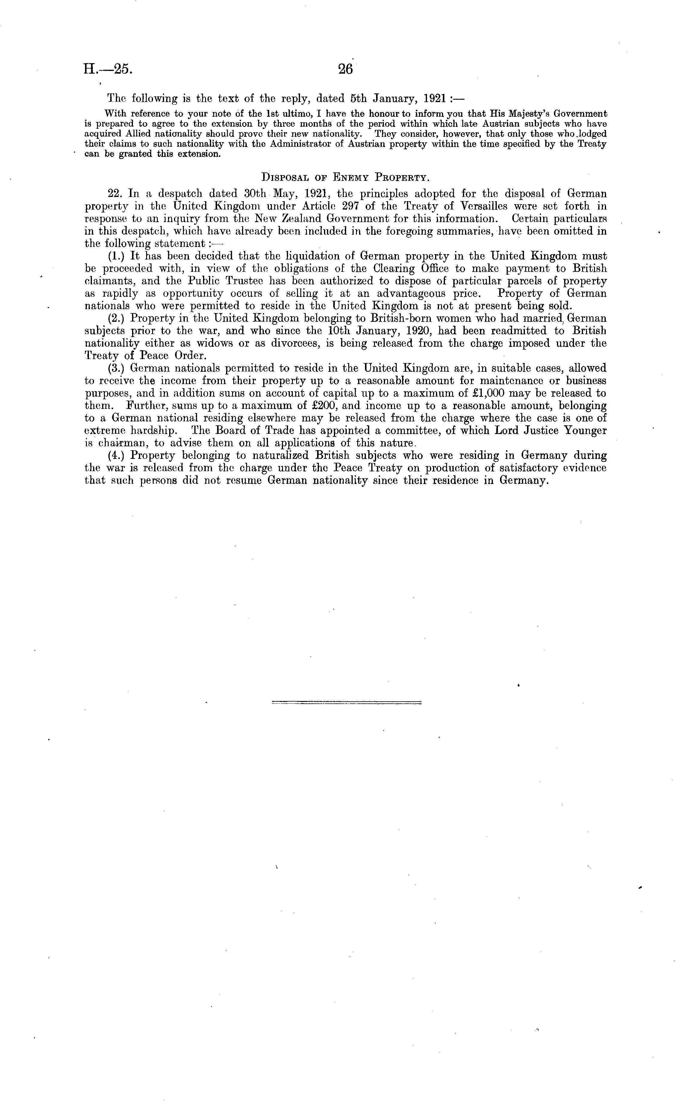 The following is the text of the reply, dated sth January, 1921 : — With reference to your note of the Ist ultimo, I have the honour to inform you that His Majesty's Government is prepared to agree to the extension by three months of the period within which late Austrian subjects who have acquired Allied nationality should prove their new nationality. They consider, however, that only those who.lodged their claims to such nationality with the Administrator of Austrian property within the time specified by the Treaty can be granted this extension. Disposal op Enemy Property. 22. In a despatch dated 30th May, 1921, the principles adopted for the disposal, of German property in the United Kingdom under Article 297 of the Treaty of Versailles were set forth in response to an inquiry from the New Zealand Government for this information. Certain particulars in this despatch, which have already been included in the foregoing summaries, have been omitted in the following statement: — (1.) It has been decided that the liquidation of German property in the United Kingdom must be proceeded with, in view of the obligations of the Clearing Office to make payment to British claimants, and the Public Trustee has been authorized to dispose of particular parcels of property as rapidly as opportunity occurs of selling it at an advantageous price. Property of German nationals who were permitted to reside in the United Kingdom is not at present being sold. (2.) Property in the United Kingdom belonging to British-born women who had married, German subjects prior to the war, and who since the 10th January, 1920, had been readmitted to British nationality either as widows or as divorcees, is being released from the charge imposed under the Treaty of Peace Order. (3.) German nationals permitted to reside in the United Kingdom are, in suitable cases, allowed to receive the income from their property up to a reasonable amount for maintenance or business purposes, and in addition sums on account of capital up to a maximum of £1,000 may be released to them. Further, sums up to a maximum of £200, and income up to a reasonable amount, belonging to a German national residing elsewhere may be released from the charge where the case is one of extreme hardship. The Board of Trade has appointed a committee, of which Lord Justice Younger is chairman, to advise them on all applications of this nature. (4.) Property belonging to naturalized British subjects who were residing in Germany during the war is released from the; charge under the Peace Treaty on production of satisfactory evidence that such persons did not resume German nationality since their residence in Germany.