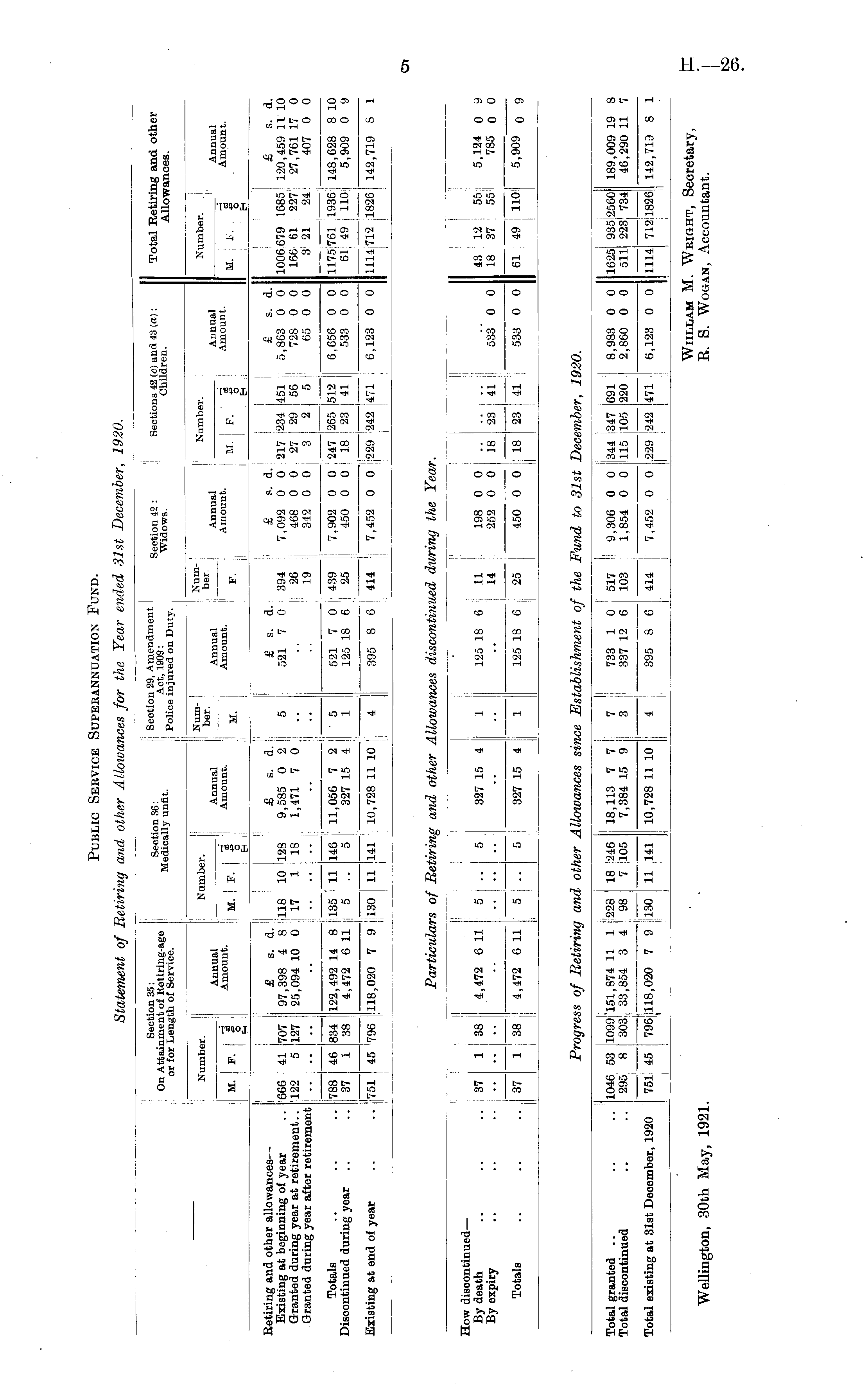 Secti I Section 36: Medically unfit. Section 29, Amendment ! Act, 1909: Police injured on Duty. . Section 42 : Widows. Sections 42 (e) and 43 (a): Children. Sect] On Attainmenl or for Lengt Section 35: On Attainment of Retiring-age or for Length of Service. Total Retiring and other Allowances. Number. M. F. 3 o H Annual Amount. Number. j M. i P. 1 II Annual Amount. I Num1 ber. Annual Amount. Number. F. Annual Amount. Number. M. P. J o H Number. Annual Amount. Number. M. h\ . 3 o Annual Amount. Retiring and other allowances — Existing at beginning of year Granted during year at retirement.. Granted during year after retirement 666 ; 41 1122 5 " 788 46 37 1 751 45 707 127 ! •• 834 38 £ s. d. 97,398 4 S 25,094 10 0 US 17 ■• 10 1 £ s. d. 128 9,585 0 2 5 18 1,471 7 0 146 11,056 7 2 5 5 327 15 4 1 141 10,728 11 10 4 £ s. d. 521 7 0 394 26 19 £ s. d. £ s. d. 7,092 0 0 217 234 451 5,863 0 0 468 0 0 27 29 56 ! 728 0 0 342 0 0 3 2 5 \ 65 0 0 £ s. d. 1006 679 1685 120,459 11 10 166 61 227 27,761 17 0 3 21 24|' 407 0 0 1175:761 1936 148,628 8 10 611 49 I 110; 5,909 0 9 Totals Discontinued during year 122,492 14 8 135 ! 11 4,472 6 11 5 .. 118,020 7 9 130 11 521 7 0 439 7,902 0 0 .247 265 512 6,656 0 0 125 18 6 25 450 0 0 18 23 41 533 0 0 ■ Existing at end of year 796 395 8 6 414 7,452 0 0 j|229 242 471 6,123 0 0 1114 712 1826 142,719 S l Particulars of Retiring and other Allowances discontinued during the Year. II II II i] I! How discontinued — By death By expiry Totals ..37 1 38 4,472 6 11 .. 37 1 38 4,472 6 11 I I i 5 .. 5 327 15 4 5 .. 5 327 15 4 1 125 18 6 1 125 18 6 11 14 25 198 0 0 .. 252 0 0 18 450 0 0 18 23 | 41 533 0 0 23 41 533 0 0 43 I 12 ! 55; 5,124 0 t 18 : 37 : 551 785 o C 61 49 ! 110i| 5,909 n c I Progress of Retiring and other Allowances since Establishment of the Fund to 31st December, 1920. Total granted .. .. . J1046! S3 1099|tl51,874 11 1 1228 18 246 18,113 7 7 Total discontinued .. .. 295; 8 303 1| 33,854 3 4 98 7 105 7,384 15 9 Total existing at 31st December, 1920 751 45 796 118,020 7 9 130 11 141 10,728 1110 j 7 3 4 [ ll 733 1 0 517 h 9,306 0 0 344 347 691 8,983 0 0 1625 935 2560 189,009 19 337 12 6 103 1,854 0 0 115 105 220 2,860 0 0 511 223 734 46,290 11 395 8 6 414 ! 7,452 0 0 229 242 471 6,123 0 0 1114 7121826 142,719 S 8 7 1 Wellington, 30th May, 1921. Wiillam M. Wright, Secretary, E. S. Wogan, Accountant.