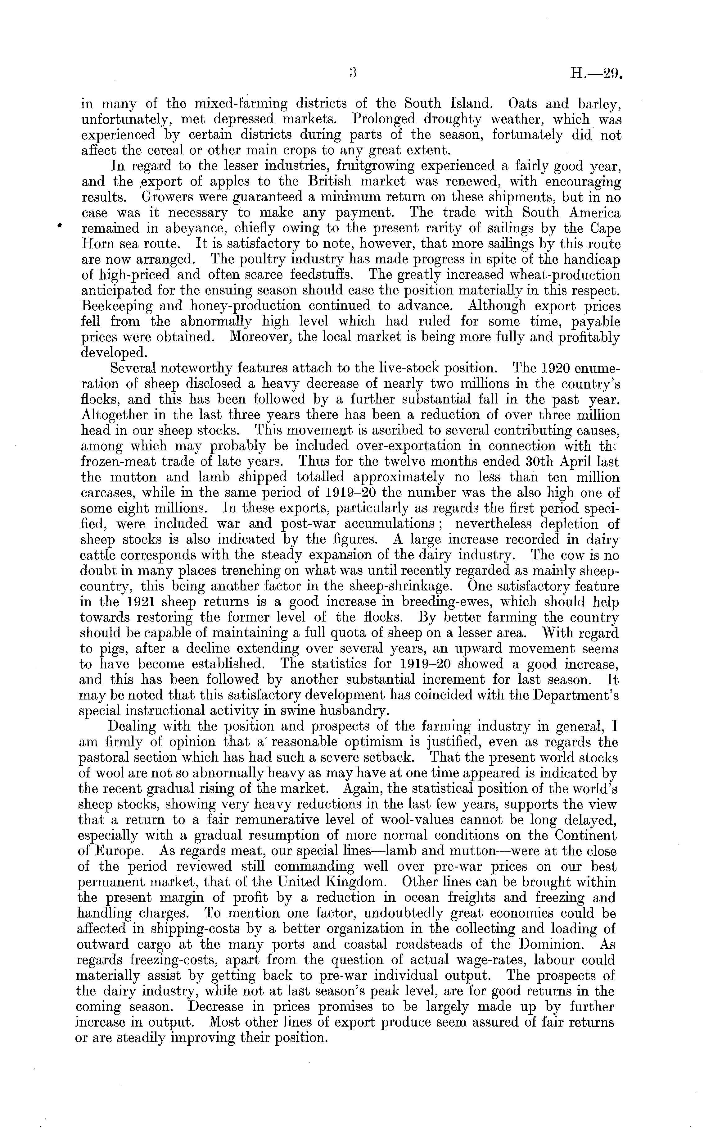 in many of the mixed-farming districts of the South Island. Oats and barley, unfortunately, met depressed markets. Prolonged droughty weather, which was experienced by certain districts during parts of the season, fortunately did not affect the cereal or other main crops to any great extent. In regard to the lesser industries, fruitgrowing experienced a fairly good year, and the .export of apples to the British market was renewed, with encouraging results. Growers were guaranteed a minimum return on these shipments, but in no case was it necessary to make any payment. The trade with South America remained in abeyance, chiefly owing to the present rarity of sailings by the Cape Horn sea route. It is satisfactory to note, however, that more sailings by this route are now arranged. The poultry industry has made progress in spite of the handicap of high-priced and often scarce feedstuffs. The greatly increased wheat-production anticipated for the ensuing season should ease the position materially in this respect. Beekeeping and honey-production continued to advance. Although export prices fell from the abnormally high level which had ruled for some time, payable prices were obtained. Moreover, the local market is being more fully and profitably developed. Several noteworthy features attach to the live-stock position. The 1920 enumeration of sheep disclosed a heavy decrease of nearly two millions in the country's flocks, and this has been followed by a further substantial fall in the past year. Altogether in the last three years there has been a reduction of over three million head in our sheep stocks. This movement is ascribed to several contributing causes, among which may probably be included over-exportation in connection with the frozen-meat trade of late years. Thus for the twelve months ended 30th April last the mutton and lamb shipped totalled approximately no less than ten million carcases, while in the same period of 1919-20 the number was the also high one of some eight millions. In these exports, particularly as regards the first period specified, were included war and post-war accumulations ; nevertheless depletion of sheep stocks is also indicated by the figures. A large increase recorded in dairy cattle corresponds with the steady expansion of the dairy industry. The cow is no doubt in many places trenching on what was until recently regarded as mainly sheepcountry, this being another factor in the sheep-shrinkage. One satisfactory feature in the 1921 sheep returns is a good increase in breeding-ewes, which should help towards restoring the former level of the flocks. By better farming the country should be capable of maintaining a full quota of sheep on a lesser area. With regard to pigs, after a decline extending over several years, an upward movement seems to have become established. The statistics for 1919-20 showed a good increase, and this has been followed by another substantial increment for last season. It may be noted that this satisfactory development has coincided with the Department's special instructional activity in swine husbandry. Dealing with the position and prospects of the farming industry in general, 1 am firmly of opinion that a reasonable optimism is justified, even as regards the pastoral section which has had such a severe setback. That the present world stocks of wool are not so abnormally heavy as may have at one time appeared is indicated by the recent gradual rising of the market. Again, the statistical position of the world's sheep stocks, showing very heavy reductions in the last few years, supports the view that a return to a fair remunerative level of wool-values cannot be long delayed, especially with a gradual resumption of more normal conditions on the Continent of Europe. As regards meat, our special lines —lamb and mutton —were at the close of the period reviewed still commanding well over pre-war prices on our best permanent market, that of the United Kingdom. Other lines can be brought within the present margin of profit by a reduction in ocean freights and freezing and handling charges. To mention one factor, undoubtedly great economies could be affected in shipping-costs by a better organization in the collecting and loading of outward cargo at the many ports and coastal roadsteads of the Dominion. As regards freezing-costs, apart from the question of actual wage-rates, labour could materially assist by getting back to pre-war individual output. The prospects of the dairy industry, while not at last season's peak level, are for good returns in the coming season. Decrease in prices promises to be largely made up by further increase in output. Most other lines of export produce seem assured of fair returns or are steadily improving their position.