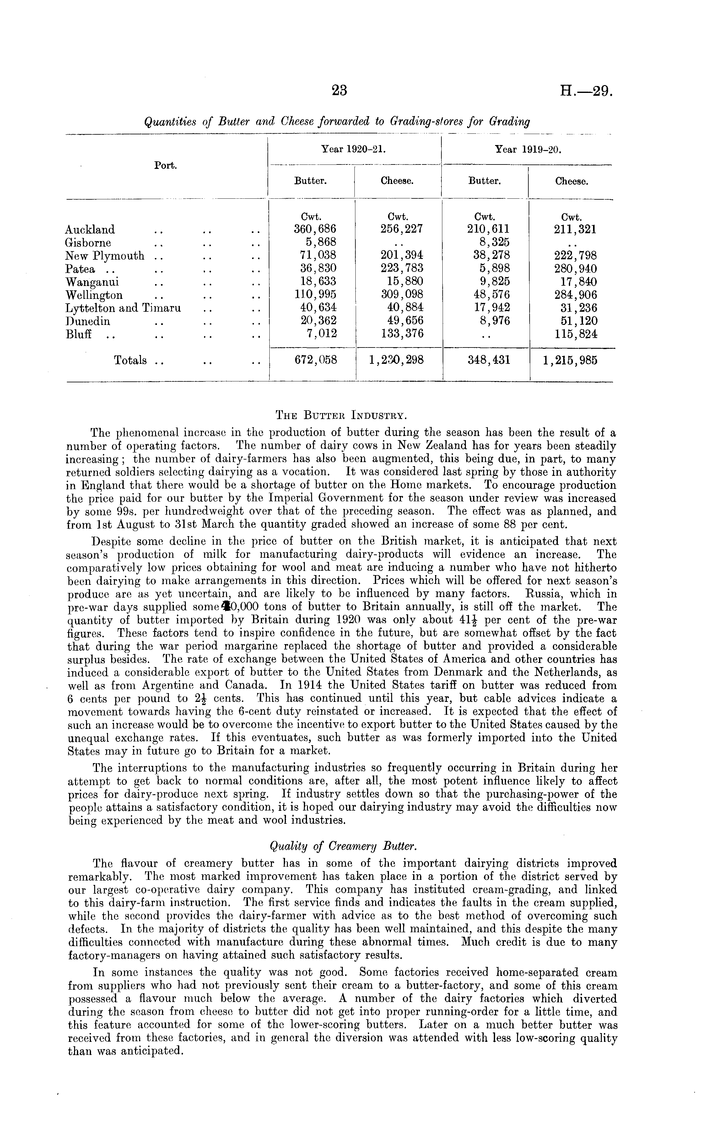 Port. Year 1920-21. Butter. C Year 1919-20. Cheese. Butter. Cheese. .uckland risborne few Plymouth .. 'atea Wanganui Wellington lyttelton and Timaru )unedin Sluff Cwt. 360,686 2 5,868 71,038 2 36,830 2 18,633 110,995 3 40,634 20,362 7,0.12 1 Cwt. 256,227 Cwt. 210,611 8,325 38,278 5,898 9,825 48,576 17,942 8,976 Cwt. 211,321 201,394 223,783 15,880 309,098 40,884 49,656 133,376 222,798 280,940 17,840 284,906 31,236 51,120 115,824 Totals .. 672,058 1,2 672,058 1,230,298 348,431 1,215,985