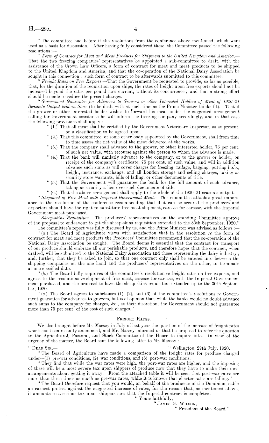 " The committee had before it the resolutions from the conference above mentioned, which were used as a basis for discussion. After having fully considered these, the Committee passed the following resolutions :— " Form, of Contract for Meat and, Meat, Products for Shipment to the United Kingdom and America. — That the two freezing companies' representatives be appointed a sub-committee to draft, with the assistance of the Crown Law Officers, a form of contract for meat and meat products to bo shipped to the United Kingdom and America, and that the co-operation of the National Dairy Association be sought in this connection ; such form of contract to be afterwards submitted to this committee. " Freight Rates on Free Exports. —That the Government be requested to provide, so far as possible, that, for the duration of the requisition upon ships, the rates of freight upon free exports should not be increased beyond the rates per pound now current, without its concurrence ; and that a strong effort should be made to reduce the present charges. " Government Guarantee, for Advances to Growers or other Interested Holders of Meat, of 1920-21 Season's Output held in Store (to be dealt with at such time as the Prime Minister thinks fit). —That if the grower or other interested holder wishes to forward his meat under the suggested arrangement calling for Government assistance he will inform the freezing company accordingly, and in that case the following provisions shall apply : — " (1.) That all meat shall bo certified by the Government Veterinary Inspector, as at present, on a classification to be agreed upon. " (2.) That this committee, or some other body appointed by the Government, shall from time to time assess tho net value of the meat delivered at the works. " (3.) That the company shall advance to the grower, or other interested holder, 75 per cent. of such net value, with recourse against the person to whom the advance is made. " (4.) That the bank will similarly advance to the company, or to the grower or holder, on receipt of the company's certificate, 75 per cent, of such value, and will in addition advance such sums as will cover charges for freezing, railage, bagging, putting f.0.b., freight, insurance, exchange, and all London storage and selling charges, taking as security store warrants, bills of lading, or other documents of title. " (5.) That the Government will guarantee the bank for the full amount of such advance, taking as security a lien over such documents of title. " (6.) That the above arrangement shall apply to the whole of the 1920-21 season's output. " Shipment of Free Meat with, Imperial Government Meat. —This committee attaches great importance to the resolution of the conference recommending that if it can be secured the producers and exporters should have the right to substitute free meat shipment, carcase for carcase, with the Imperial Government meat purchased. " Sheep-skins Requisition. —The producers' representatives on the standing Committee approve of the proposal to endeavour to get the sheep-skins requisition extended to the 30th September, 1920." The committee's report was fully discussed by us, and the Prime Minister was advised as follows :— " (a.) The Board of Agriculture views with satisfaction that in the resolution re the form of contract for meat and meat products the Producers' Committee recommend that the co-operation of the National Dairy Association be sought. The Board deems it essential that the contract for transport of our produce should embrace all our perishable products, and therefore hopes that the contract, when drafted, will be submitted to the National Dairy Association and those representing the dairy industry ; and, further, that they be asked to join, so that one contract only shall be entered into between the shipping companies on the one hand and the producers' representatives on the other, to terminate at one specified date. " (b.) The Board fully approves of the committee's resolution re freight rates on free exports, and agrees to the resolutions re shipment of free meat, carcase for carcase, with the Imperial Government meat purchased, and the proposal to have the sheep-skins requisition extended up to the 30th September, 1920. " (c.) The Board agrees to subclauses (1), (2), and (3) of the committee's resolutions re Government guarantee for advances to growers, but is of opinion that, while the banks would no doubt advance such sums to the company for charges, &c, at their discretion, the Government should not guarantee more than 75 per cent, of the cost of such charges." Freight Rates. We also brought before Mr. Massey in July of last year the question of the increase of freight rates which had been recently announced, and Mr. Massey informed us that he proposed to refer the question to the Agricultural, Pastoral, and Stock Committee of the House to inquire into. In view of the urgency of the matter, the Board sent the following letter to Mr. Massey : — " Dear Sir,— " Wellington, 29th July, 1920. " The Board of Agriculture have made a comparison of the freight rates for produce charged under —(1) pre-war conditions, (2) war conditions, and (3) post-war conditions. " They find that while the war rates were high, the post-war rates are higher, and the imposing of these will be a most severe tax upon shippers of produce now that they have to make their own arrangements about getting it away. From the attached table it will be seen that post-war rates are more than three times as much as pre-war rates, while it is known that charter rates are falling." " The Board therefore request that you would, on behalf of the producers of the Dominion, cable an earnest protest against the suggested increase of rates, for the reason that, as mentioned above, it amounts to a serious tax upon shippers now that the Imperial contract is completed. " Yours faithfully, " James G. Wilson, " President of the Board."
