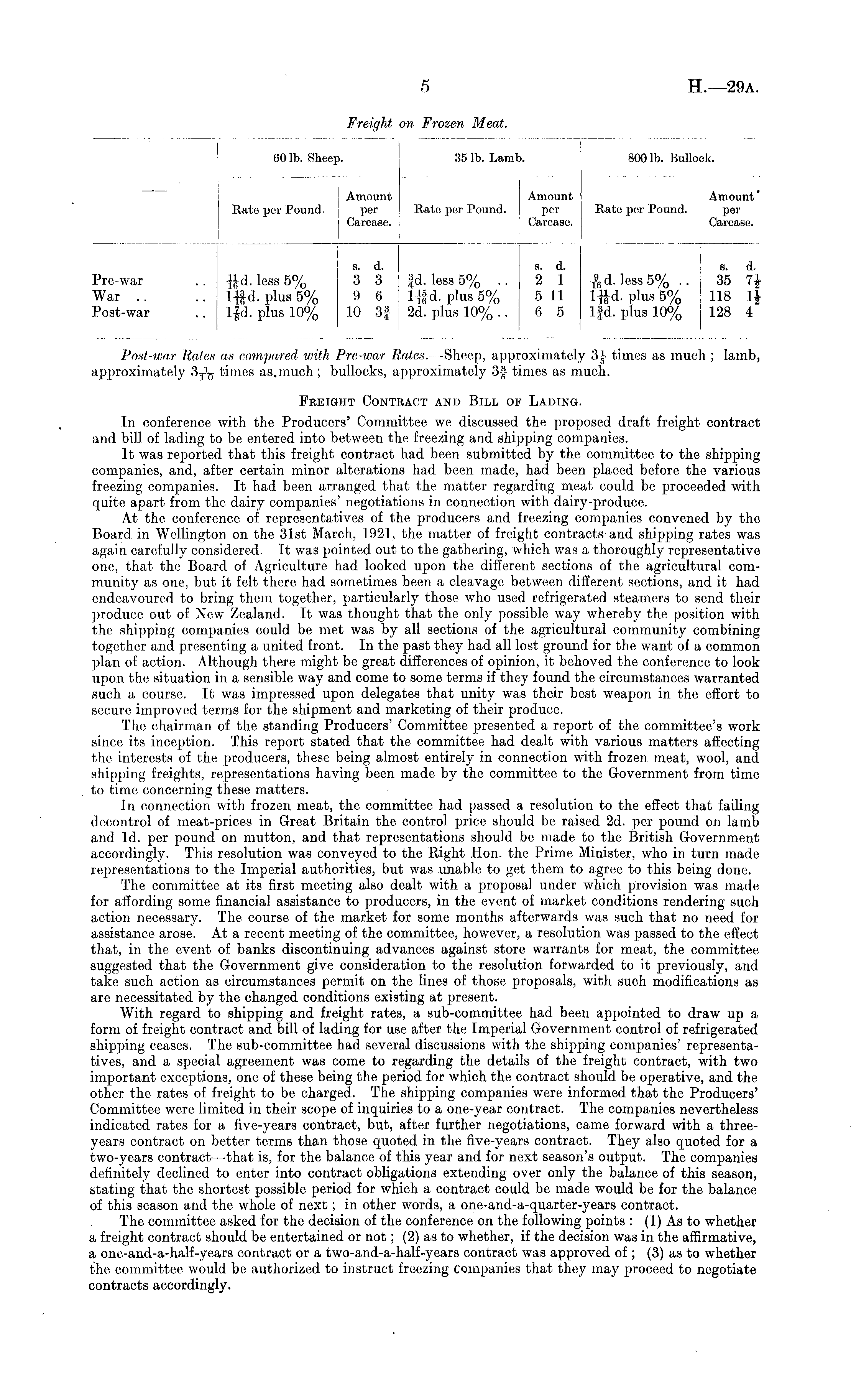 Post-war Rates as compared with Pre-war Rates. —Sheep, approximately 3J times as much ; lamb, approximately 3 T ' W times as.much; bullocks, approximately 3-jJ times as much. Freight Contract and Bill of Lading. In conference with the Producers' Committee we discussed the proposed draft freight contract and bill of lading to be entered into between the freezing and shipping companies. It was reported that this freight contract had been submitted by the committee to the shipping companies, and, after certain minor alterations had been made, had been placed before the various freezing companies. It had been arranged that the matter regarding meat could be proceeded with quite apart from the dairy companies' negotiations in connection with dairy-produce. At the conference of representatives of the producers and freezing companies convened by the Board in Wellington on the 31st March, 1921, the matter of freight contracts and shipping rates was again carefully considered. It was pointed out to the gathering, which was a thoroughly representative; one, that the Board of Agriculture had looked upon the different sections of the agricultural community as one, but it felt there had sometimes been a cleavage between different sections, and it had endeavoured to bring them together, particularly those who used refrigerated steamers to send their produce out of New Zealand. It was thought that the only possible way whereby the position with the shipping companies could be met was by all sections of the agricultural community combining together and presenting a united front. In the past they had all lost ground for the want of a common plan of action. Although there might be great differences of opinion, it behoved the conference to look upon the situation in a sensible way and come to some terms if they found the circumstances warranted such a course. It was impressed upon delegates that unity was their best weapon in the effort to secure improved terms for the shipment and marketing of their produce. The chairman of the standing Producers' Committee presented a report of the committee's work since its incejjtion. This report stated that the committee had dealt with various matters affecting the interests of the producers, these being almost entirely in connection with frozen meat, wool, and shipping freights, representations having been made by the committee to the Government from time to time concerning these matters. In connection with frozen meat, the committee had. passed a resolution to the effect that failing decontrol of meat-prices in Great Britain the control price should be raised 2d. per pound on lamb and Id. per pound on mutton, and that representations should be made to the British Government accordingly. This resolution was conveyed to the Right Hon. the Prime Minister, who in turn made representations to the Imperial authorities, but was unable to get them to agree to this being done. The committee at its first meeting also dealt with a proposal under which provision was made for affording some financial assistance to producers, in the event of market conditions rendering such action necessary. The course of the market for some months afterwards was such that no need for assistance arose. At a recent meeting of the committee, however, a resolution was passed to the effect that, in the event of banks discontinuing advances against store warrants for meat, the committee suggested that the Government give consideration to the resolution forwarded to it previously, and take such action as circumstances permit on the lines of those proposals, with such modifications as are necessitated by the changed conditions existing at present. With regard to shipping and freight rates, a sub-committee had been appointed to draw up a form of freight contract and bill of lading for use after the Imperial Government control of refrigerated shipping ceases. The sub-committee had several discussions with the shipping companies' representatives, and a special agreement was come to regarding the details of the freight contract, with two important exceptions, one of these being the period for which the contract should be operative, and the other the rates of freight to be charged. The shipping companies were informed that the Producers' Committee were limited in their scope of inquiries to a one-year contract. The companies nevertheless indicated rates for a five-years contract, but, after further negotiations, came forward with a threeyears contract on better terms than those quoted in the five-years contract. They also quoted for a two-years contract —that is, for the balance of this year and for next season's output. The companies definitely declined to enter into contract obligations extending over only the balance of this season, stating that the shortest possible period for which a contract could be made would be for the balance of this season and the whole of next; in other words, a one-and-a-quarter-years contract. The committee asked for the decision of the conference on the following points : (1) As to whether a freight contract should be entertained or not; (2) as to whether, if the decision was in the affirmative, a one-and-a-half-years contract or a two-and-a-half-years contract was approved of ; (3) as to whether the committee would be authorized to instruct freezing companies that they may proceed to negotiate contracts accordingly.