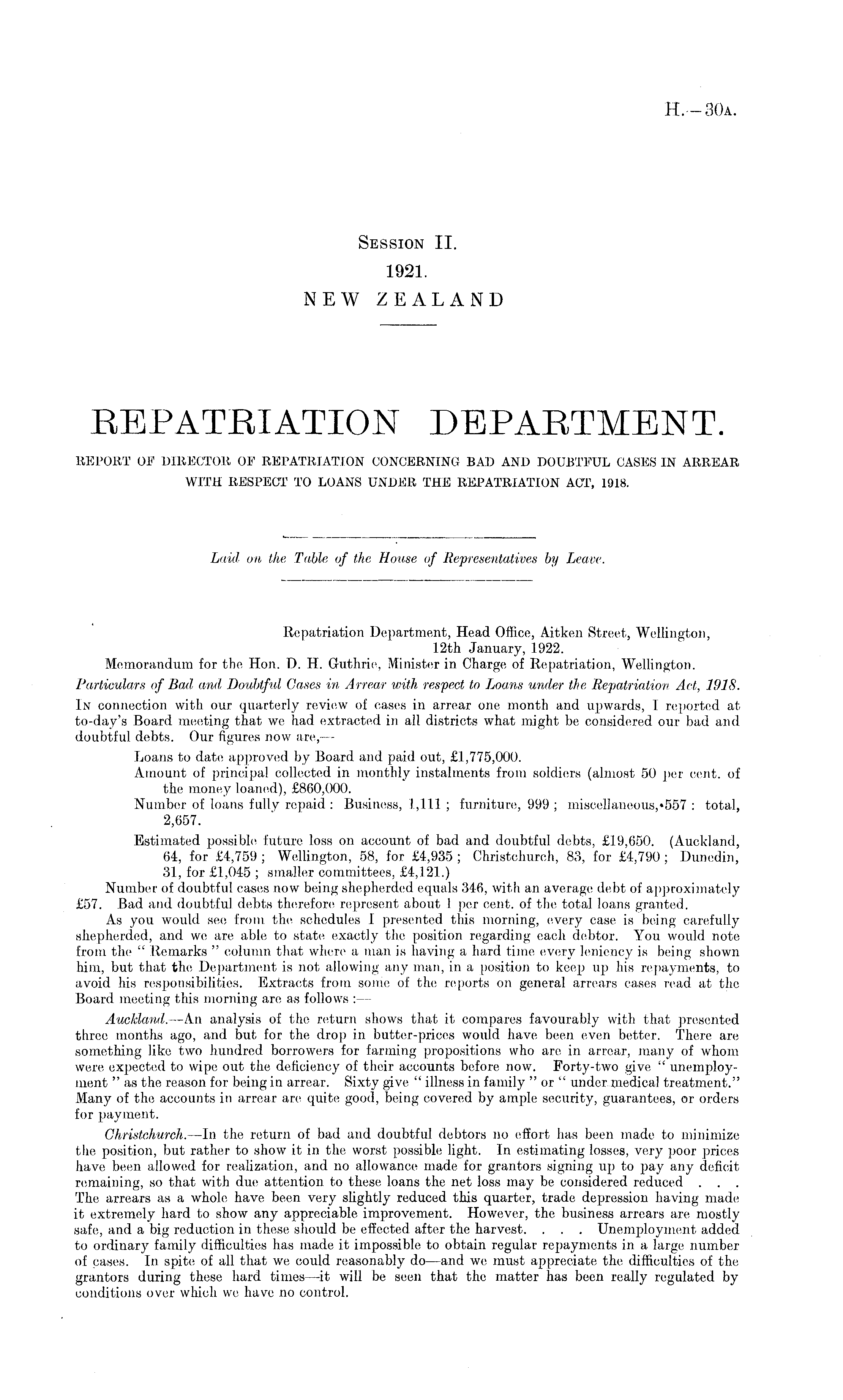 Repatriation Department, Head Oflice, Aitken Street, Wellington, 12th January, 1922. Memorandum for the Hon. D. H. Guthrie, Minister in Charge of Repatriation, Wellington. Particulars of Bail and Doubtful Cases in Arrear with respect to Loans under the Repatriation Act, 1918. In connection with our quarterly review of cases in arrear one month and upwards, I reported at to-day's Board meeting that we had extracted in all districts what might be considered our bad and doubtful debts. Our figures now are,— Loans to date approved by Board and paid out, £1,775,000. Amount of principal collected in monthly instalments from soldiers (almost 50 per cent, of the money loaned), £860,000. Number of loans fully repaid : Business, 1,111 ; furniture, 999 ; miscellaneous,*ss7 : total, 2,657. Estimated possible future loss on account of bad and doubtful debts, £19,650. (Auckland, 64, for £4,759 ; Wellington, 58, for £4,935 ; Christchurch, 83, for £4,790 ; Dunedin, 31, for £1,045 ; smaller committees, £4,121.) Number of doubtful cases now being shepherded equals 346, with an average debt of approximately £57. Bad and doubtful debts therefore represent about 1 per cent, of the total loans granted. As you would see from the schedules 1 presented this morning, every case is being carefully shepherded, and we are able to state exactly the position regarding each debtor. You would note from the " Remarks " column that where a man is having a hard time every leniency is being shown him, but that the Department is not allowing any man, in a position to keep up his repayments, to avoid his responsibilities. Extracts from some of the reports on general arrears cases read at the Board meeting this morning are as follows : — Auckland. —An analysis of the return shows that it compares favourably with that presented three months ago, and but for the drop in butter-prices would have been even better. There are something like two hundred borrowers for farming propositions who arc in arrear, many of whom were expected to wipe out the deficiency of their accounts before now. Forty-two give " unemployment "as the reason for being in arrear. Sixty give " illness in family "or " under medical treatment." Many of the accounts in arrear are quite good, being covered by ample security, guarantees, or orders for payment. Christchurch. —In the return of bad and doubtful debtors no effort has been made to minimize the position, but rather to show it in the worst possible light. In estimating losses, very poor prices have been allowed for realization, and no allowance made for grantors signing up to pay any deficit remaining, so that with due attention to these loans the net loss may be considered reduced . . . The arrears as a whole have been very slightly reduced this quarter, trade depression having made it extremely hard to show any appreciable improvement. However, the business arrears are mostly safe, and a big reduction in these should be effected after the harvest. . . . Unemployment added to ordinary family difficulties has made it impossible to obtain regular repayments in a large number of cases. In spite of all that we could reasonably do—and we must appreciate the difficulties of the grantors during these hard times —it will be seen that the matter has been really regulated by conditions over which we have no control.