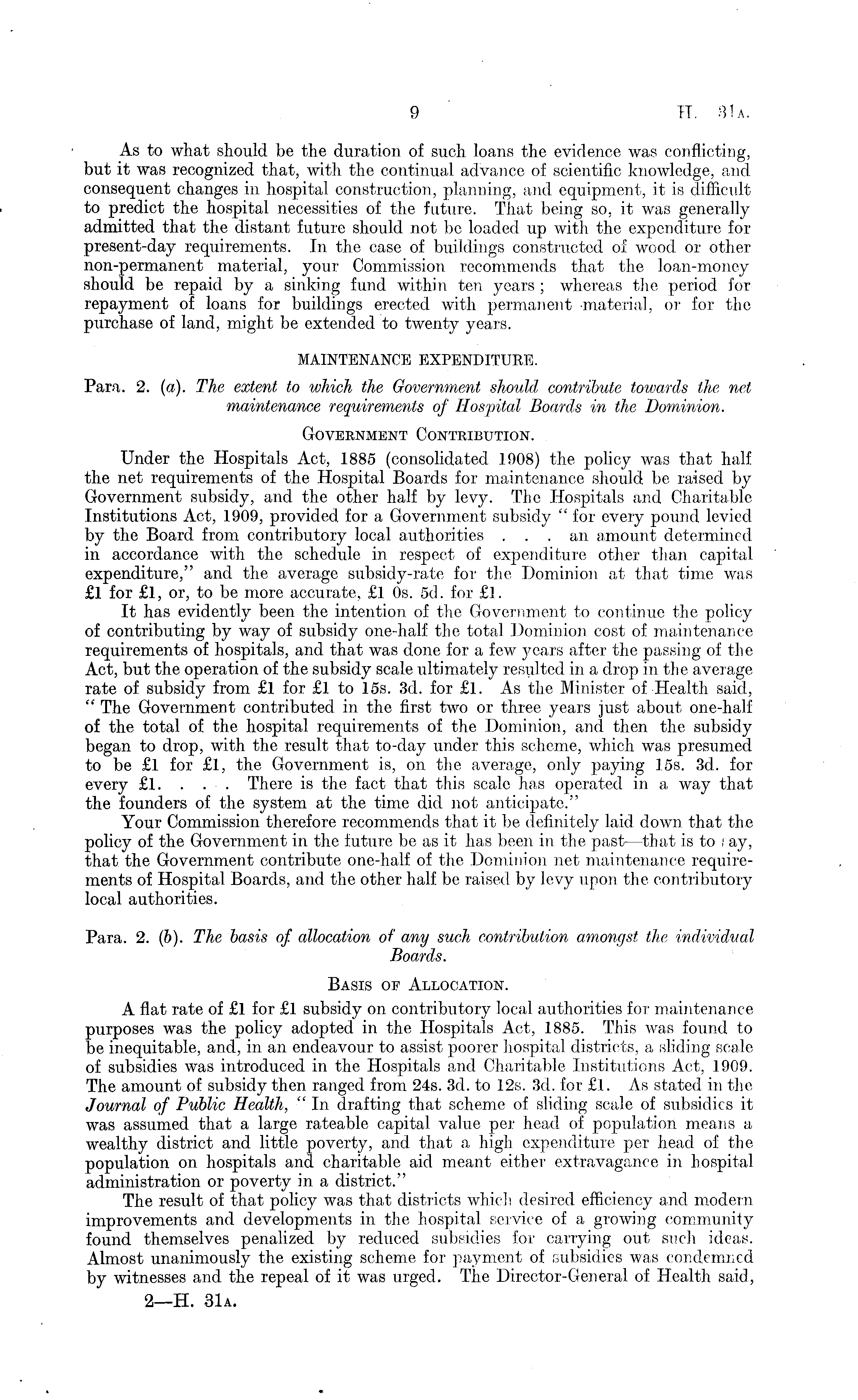 As to what should be the duration of such loans the evidence was conflicting, but it was recognized that, with the continual advance of scientific knowledge, and consequent changes in hospital construction, planning, and equipment, it is difficult to predict the hospital necessities of the future. That being so, it was generally admitted that the distant future should not be loaded up with the expenditure for present-day requirements. In the case of buildings constructed of wood or other non-permanent material, your Commission recommends that the loan-money should be repaid by a sinking fund within ten years; whereas the period for repayment of loans for buildings erected with permanent material, or for the purchase of land, might be extended to twenty years. MAINTENANCE EXPENDITURE. Para. 2. (a). The extent to which the Government should contribute towards the net maintenance requirements of Hospital Boards in the Dominion. Government Contribution. Under the Hospitals Act, 1885 (consolidated 1908) the policy was that half the net requirements of the Hospital Boards for maintenance should be raised by Government subsidy, and the other half by levy. The Hospitals and Charitable Institutions Act, 1909, provided for a Government subsidy " for every pound levied by the Board from contributory local authorities ... an amount determined in accordance with the schedule in respect of expenditure other than capital expenditure," and the average subsidy-rate for the Dominion at that time was £l for £l, or, to be more accurate, £l os. sd. for £]. It has evidently been the intention of the Government to continue the policy of contributing by way of subsidy one-half the total Dominion cost of maintenance requirements of hospitals, and that was done for a few years after the passing of the Act, but the operation of the subsidy scale ultimately resulted in a drop in the average rate of subsidy from £l for £l to 15s. 3d. for £l. As the Minister of Health said, " The Government contributed in the first two or three years just about one-half of the total of the hospital requirements of the Dominion, and then the subsidy began to drop, with the result that to-day under this scheme, which was presumed to be £l for £l, the Government is, on the average, only paying 15s. 3d. for every £l. . . . There is the fact that this scale has operated in a way that the founders of the system at the time did not anticipate." Your Commission therefore recommends that it be definitely laid down that the policy of the Government in the future be as it has been in the past—that is to i ay, that the Government contribute one-half of the Dominion net maintenance requirements of Hospital Boards, and the other half be raised by levy upon the contributory local authorities. Para. 2. (b). The basis of allocation of any such contribution amongst the individual Boards. Basis of Allocation. A flat rate of £l for £l subsidy on contributory local authorities for maintenance purposes was the policy adopted in the Hospitals Act, 1885. This was found to be inequitable, and, in an endeavour to assist poorer hospital districts, a sliding scale of subsidies was introduced in the Hospitals and Charitable Institutions Act, 1909. The amount of subsidy then ranged from 245. 3d. to 12s. 3d. for £l. As stated in the Journal of Public Health, " In drafting that scheme of sliding scale of subsidies it was assumed that a large rateable capital value per head of population means a wealthy district and little poverty, and that a high expenditure per head of the population on hospitals and charitable aid meant either extravagance in hospital administration or poverty in a district." The result of that policy was that districts which desired efficiency and modern improvements and developments in the hospital service of a growing community found themselves penalized by reduced subsidies for carrying out such ideas. Almost unanimously the existing scheme for payment of subsidies was condemned by witnesses and the repeal of it was urged. The Director-General of Health said,