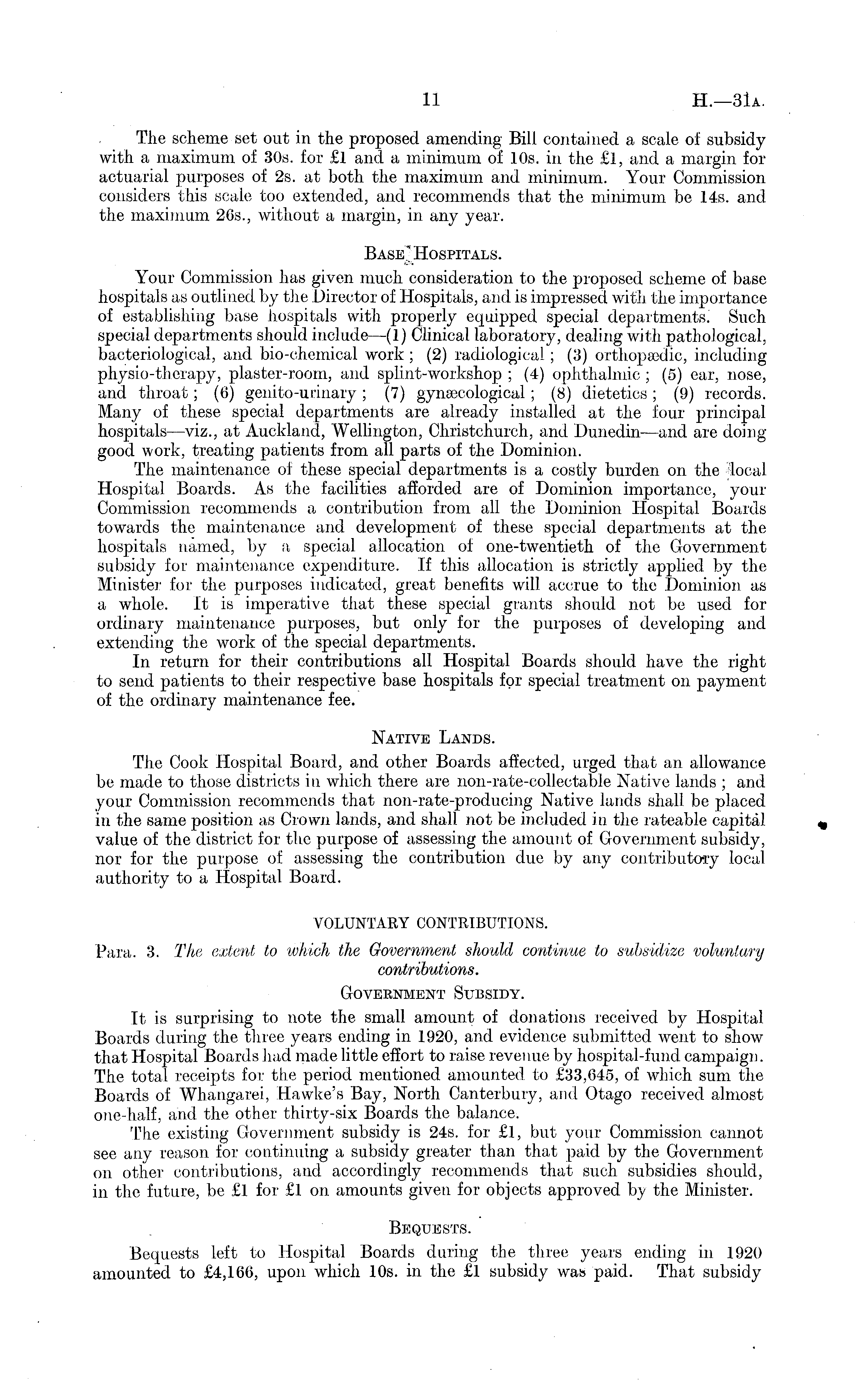 The scheme set out in the proposed amending Bill contained a scale of subsidy with a maximum of 30s. for £l and a minimum of 10s. in the £l, and a margin for actuarial purposes of 2s. at both the maximum and minimum. Your Commission considers this scale too extended, and recommends that the minimum be 14s. and the maximum 265., without a margin, in any year. Base "Hospitals. Your Commission has given much consideration to the proposed scheme of base hospitals as outlined by the Director of Hospitals, and is impressed with the importance of establishing base hospitals with properly equipped special departments. Such special departments should include—(l) Clinical laboratory, dealing with pathological, bacteriological, and bio-chemical work ; (2) radiological ; (3) orthopaedic, including physio-therapy, plaster-room, and splint-workshop ; (4) ophthalmic ; (5) ear, nose, and throat; (6) genito-urinary ; (7) gynaecological ; (8) dietetics ; (9) records. Many of these special departments are already installed at the four principal hospitals—viz., at Auckland, Wellington, Christchurch, and Dunedin—and are doing good work, treating patients from all parts of the Dominion. The maintenance of these special departments is a costly burden on. the local Hospital Boards. As the facilities afforded are of Dominion importance, your Commission recommends a contribution from all the Dominion Hospital Boards towards the maintenance and development of these special departments at the hospitals named, by a special allocation of one-twentieth of the Government subsidy for maintenance expenditure. If this allocation is strictly applied by the Minister for the purposes indicated, great benefits will accrue to the Dominion as a whole. It is imperative that these special grants should not be used for ordinary maintenance purposes, but only for the purposes of developing and extending the work of the special departments. In return for their contributions all Hospital Boards should have the right to send patients to their respective base hospitals for special treatment on payment of the ordinary maintenance fee. Native Lands. The Cook Hospital Board, and other Boards affected, urged that an allowance be made to those districts in which there are non-rate-collectable Native lands ; and your Commission recommends that non-rate-producing Native lands shall be placed in the same position as Crown lands, and shall not be included in the rateable capital value of the district for the purpose of assessing the amount of Government subsidy, nor for the purpose of assessing the contribution due by any contributory local authority to a Hospital Board. VOLUNTARY CONTRIBUTIONS. Para. 3. The extent to 'which the Government should continue to subsidize voluntary contributions. Government Subsidy. It is surprising to note the small amount of donations received by Hospital Boards during the three years ending in 1920, and evidence submitted went to show that Hospital Boards had made little effort to raise revenue by hospital-fund campaign. The total receipts for the period mentioned amounted to £33,645, of which sum the Boards of Whangarei, Hawke's Bay, North Canterbury, and Otago received almost one-half, and the other thirty-six Boards the balance. The existing Government subsidy is 245. for £l, but your Commission cannot see any reason for continuing a subsidy greater than that paid by the Government on other contributions, and accordingly recommends that such subsidies should, in the future, be £l for £l on amounts given for objects approved by the Minister. Bequests. Bequests left to Hospital Boards during the three years ending in 1920 amounted to £4,166, upon which 10s. in the £l subsidy was paid. That subsidy