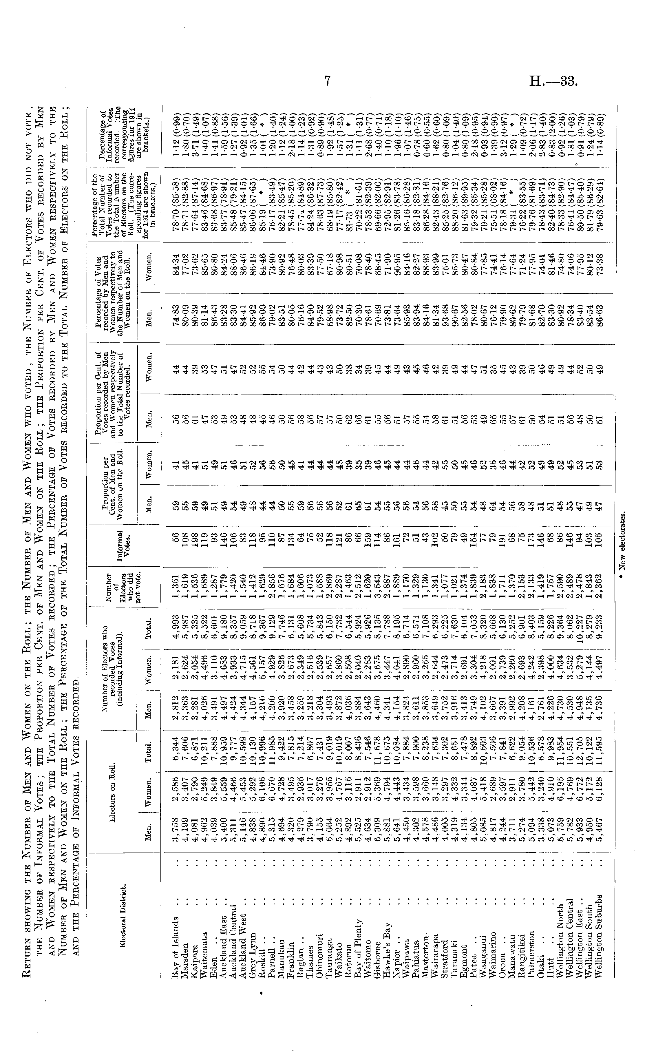 Electors on Roll. Number of Electors who recorded Votes (including Informal). Number of Electors who did Proportion per Cent, of Men and Women on the Roll. Proportion per Cent, of Votes recorded by Men and W r omen respectively to the Total Number of Votes recorded. Percentage of Votes recorded by Men and Women respectively to the Number of Men and Women on the Roll. Percentage of the Total Number of Votes recorded to the Total Number of Electors on the Roll. (The correPercentage of Informal Votes recorded. (The corresponding figures for 1914 are shown in brackets.) Electoral District. Informal Votes. Men. Women. Total. Men. Women. Total. Men. Women. Men. "Women. Men. Women. for 1914 are shown in brackets.) • Bay of Islands Marsden Kaipara Waitemata Eden Auckland East Auckland Central Auckland West .. Grey Lynn Roskill .. Parnell Manukau Franklin Raglan Thames Ohinemuri Tauranga Waikato Rotorua Bay of Plenty Waitomo Gisborne Hawke's Bay Napier Waipawa Pahiatua Masterton Wairarapa Stratford Taranaki Egmont Patea Wanganui Waimarino Oroua Manawatu Rangitikei Palmerston Otaki Hutt Wellington North Wellington Central Wellington East .. Wellington South Wellington Suburbs 3,758 4,199 | 4,081 j 4,962 4,039 | 5,400 5,311 5,146 4,838 4,890 5,315 4,694 4,320 4,279 3,790 4,155 5,064 5,252 4,892 5,525 4,634 6,309 5,881 5,641 4,450 4,302 4,578 4,486 4,005 4,319 4,134 4,805 5,085 4,817 4,244 3,711 5,274 5,094 3,338 5,073 5,759 5,782 5,933 4,950 5,467 2,586 3,407 2,790 5,249 3,849 5,559 4,466 5,453 5,292 6,106 6,670 4,728 3,495 2,935 3,017 3,276 3,955 4,767 3,115 2,911 2,912 5,369 4,794 4,443 3,434 3,598 3,660 3,148 3,297 4,332 3,344 4,087 5,418 2,689 3,597 2.911 3,780 5,442 3,240 4,910 6,195 4,769 6,772 5,172 6,128 6,344 7,606 6,871 10,211 7,888 10,959 9,777 10,599 10,130 10,996 11,985 9,422 7,815 7,214 6,807 7,431 9,019 10,019 8,007 8,436 7,546 11,678 10,675 10,084 7,884 7,900 8,238 7,634 7,302 8,651 7,478 8,892 10,503 7,506 7,841 6,622 9,054 10,536 6,578 9,983 11,954 10,551 12,705 10,122 11,595 2,812 3,363 3,281 4,026 3,491 4,497 4,424 4,344 4,157 4,210 4,200 3,920 3,458 3,259 3,218 3,304 3,493 3,872 4,036 3,884 3,643 4,460 4,341 4,154 3,824 3,611 3,853 3,649 3,752 3,916 3,413 3,749 4,102 3,667 3,391 2,992 4,208 4,161 2,761 4,226 4,730 4,530 4,948 4,135 4,736 2,181 2,624 2,054 4,496 3,110 4,683 3,933 4,715 4,561 5,157 4,929 3,826 2,673 2,349 2,516 2,539 2,657 3,860 2,508 2,040 2,283 3,675 3,447 4,041 2,890 2,960 3,255 2,644 2,473 3,714 2,691 3,304 4,218 2,001 2,739 2,260 2,693 4,242 2,398 4,000 4.634 3,532 5,279 4,144 4,497 4,993 5,987 5,335 8,522 6,601 9,180 8,357 9,059 8,718 9,367 9,129 7,746 6,131 5,608 5,734 5,843 6,150 7,732 6,544 5,924 5,926 8,135 7,788 8,195 6,714 6,571 7,108 6,293 6,225 7,630 6,104 7,053 8,320 5,668 6,130 5,252 6,901 8,403 5,159 8,226 9,364 8,062 10,227 8,279 9,233 1,351 1,619 1,536 1,689 1,287 1,779 1,420 1,540 1,412 1,629 2,856 1,676 1,684 1,606 1,073 1,588 2,869 2,287 1,463 2,512 1,620 3,543 2,887 1,889 1,170 1,329 1,130 1,341 1,077 1,021 1,374 1,839 2,183 1,838 1,711 1,370 2,153 2,133 1,419 1,757 2,590 2,489 2,478 1,843 2,362 56 108 198 119 93 146 106 83 118 95 110 87 134 64 75 52 118 121 86 66 159 114 86 161 72 51 43 102 50 79 49 154 77 79 191 68 75 173 146 68 86 146 94 103 105 59 55 59 49 51 49 54 49 48 44 44 50 55 59 56 50 50 52 01 05 01 54 55 50 50 54 50 58 45 50 55 54 48 04 54 50 58 48 51 51 48 55 47 49 47 41 45 41 51 49 5! 46 51 52 50 50 50 45 41 44 44 44 48 39 35 39 40 45 44 44 46 44 42 55 50 45 40 52 36 40 44 42 52 49 49 52 45 53 51 53 50 56 61 47 53 49 53 48 48 45 46 50 56 56 57 57 50 62 06 61 55 56 51 57 54 58 01 51 56 53 49 65 55 57 61 50 54 51 51 50 48 50 51 44 44 39 53 47 51 47 52 52 55 54 50 44 42 44 43 43 50 38 34 39 45 44 49 43 45 40 42 39 49 44 47 51 35 45 43 39 50 46 49 49 44 52 50 49 74-83 80-09 80-39 81-14 86-43 83-28 83-30 84-41 85-92 86-09 79-02 83-51 80-05 76-16 84-90 79-52 68-98 73-72 82-50 70-30 78-61 70-69 73-81 73-64 85-93 83-94 84-16 81-34 93-68 90-67 82-56 78-02 80-67 76-12 79-90 80-62 79-79 81-68 82-70 83-30 80-92 78-34 83-40 83-54 86-63 84-34 77-02 73-62 85-65 80-80 84-24 88-06 86-46 86-19 84-46 73-90 80-92 76-48 80-03 83-39 77-50 67-18 80-98 80-51 70-08 78-40 68-45 71-90 90-95 84-16 82-27 88-93 83-99 75-01 85-73 80-47 80-84 77-85 74-41 76-14 77-64 71-24 77-95 74-01 81-46 74-80 74-06 77-95 80-12 73-38 78-70(85-58) 78-71 (82-88) 77-64 (87-14) 83-46 (84-68) 83-68(86-97) 83-77(78-91) 85-48 (79-21) 85-47 (84-15) 86-06 (87-65) 85-19 ( * ) 76-17 (83-49) 82-21 (85-47) 78-45 (85-20) 77-7* (84-89) 84-24 (86-32) 78-63 (87-73) 68-19 (85-80) 77-17(82-42) 81-73 ( * ) 70-22(81-61) 78-53 (82-39) 69-66 (82-00) 72-95(82-91) 81-26(83-78) 85-16 (86-28) 83-18(82-81) 86-28 (84-16) 82-43 (88-21) 85-25 (82-76) 88-20(86-12) 81-63(89-95) 79-32 (85-34) 79-21 (85-28) 75-51 (68-02) 78-18(84-16) 79-31 ( * ) 76-22 (83-55) 79-76(81-69) 78-43(83-71) 82-40 (84-73) 78-33 (82-90) 76-41 (84-47) 80-50 (85-40) 81-79 (86-29) 79-63 (82-64) 1-12 (0-99) 1-80(0-70) 3-71 (1-49) 1-40(1-07) 1-41 (0-88) 1-59(1-56) 1-27(1-39) 0-92 (1-01) 1-35(1-66) 1-01 ( * ) 1-20(1-40) 1-12(1-24) 2-18(1-00) 1-14(1-23) 1-31 (0-92) 0-89 (0-90) 1-92 (1-48) 1-57(1-25) 1-31 ( * ) 1-11(1-31) 2-68 (0-77) 1-40(0-71) 1-10(1-18) 1-96(1-10) 1-07(1-46) 0-78 (0-75) 0-60 (C-55) 1-62(0-60) 0-80(1-09) 1-04(1-40) 0-80(1-09) 2-18(0-95) 0-93 (0-94) 1-39(0-90) 3-12(0-97) 1-29 ( * ) 1-09(0-72) 2-06(1-17) 2-83(1-40) 0-83 (2-00) 0-92 (1-26) , 1-81 (1-03) 0-91 (0-79) 1-24(0-79) 1-14(0-89) * New electorates.
