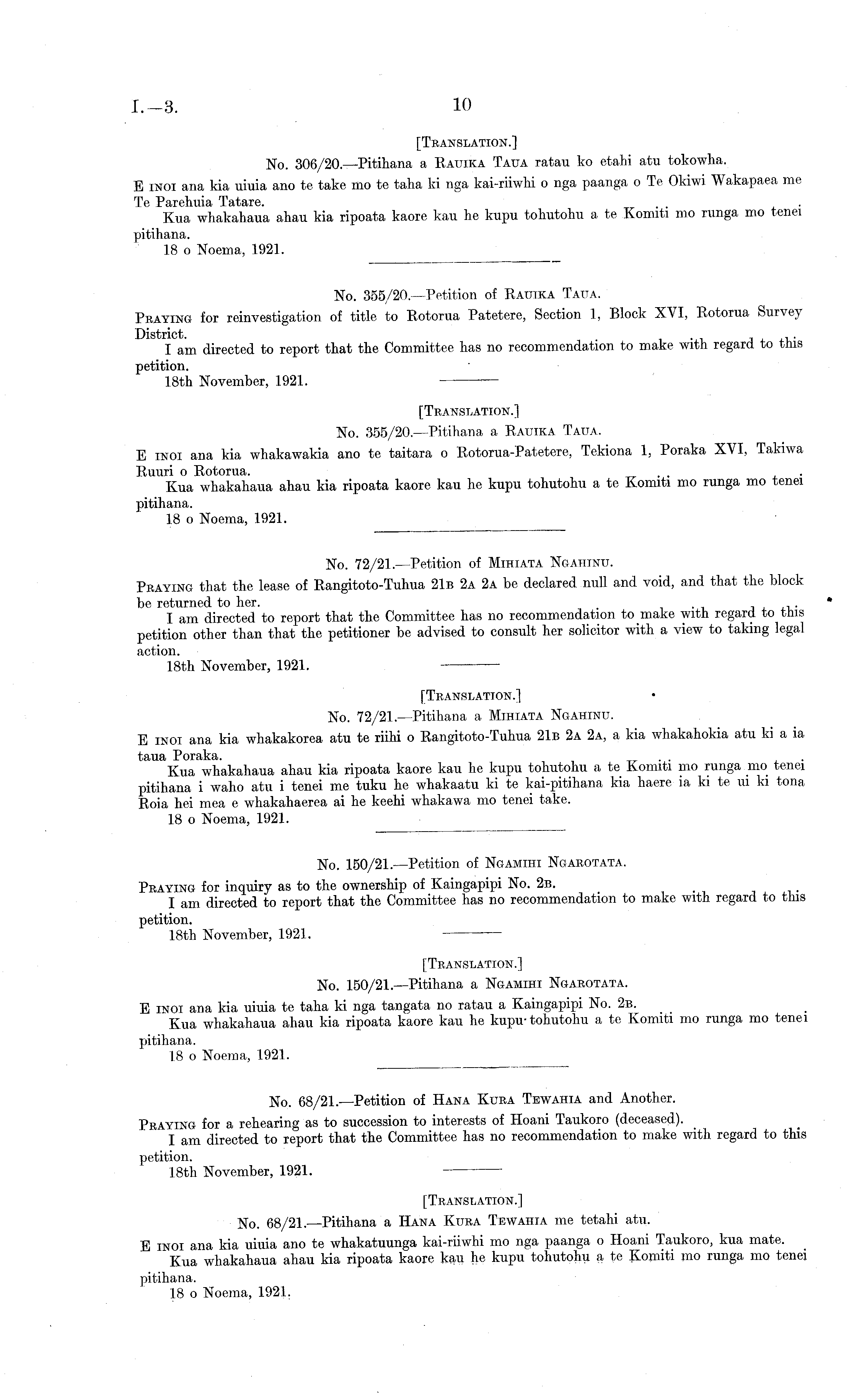 [Translation.] No. 306/20.— Pitihana a Eadika Taua ratau ko etahi atu tokowha. E iNoi ana kia uiuia ano te take mo te talia ki nga kai-riiwhi o nga paanga o Te Okiwi Wakapaea me Te Parehuia Tatare. Kua whakahaua ahau kia ripoata kaore kau he kupu tohutohu a te Komiti mo runga mo tenei pitihana. 18 o Noema, 1921.