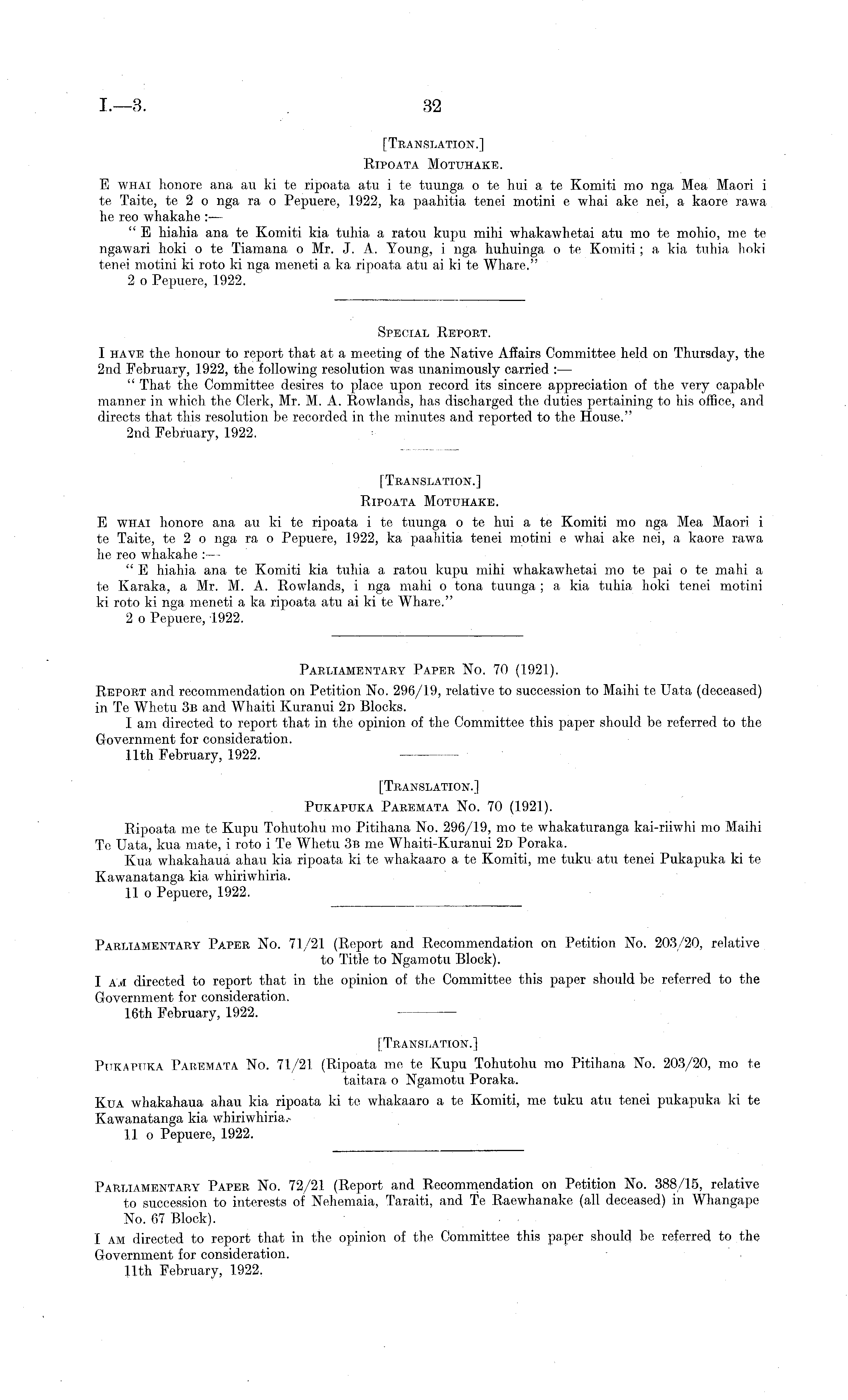 Parliamentary Paper No. 72/21 (Report and Recommendation on Petition No. 388/15, relative to succession to interests of Nehemaia, Taraiti, and Te Raewhanake (all deceased) in Whangape No. 67 Block). I am directed to report that in the opinion of the Committee this paper should be referred to the Government for consideration. 11th February, 1.922.