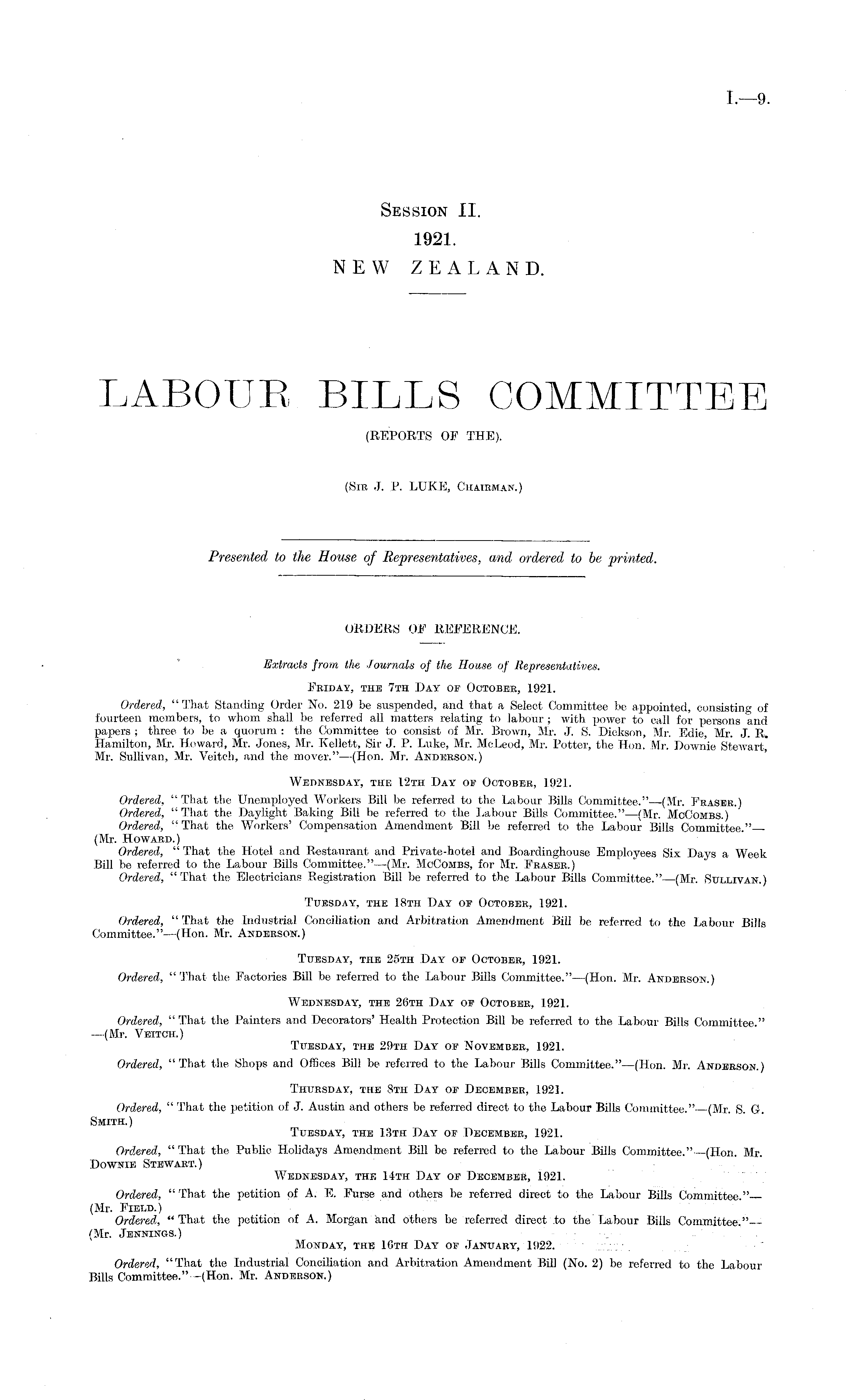 ORDERS OF REFERENCE. Extracts from the Journals of the House of Representatives. Friday, the 7th Day of October, 1921. Ordered, "That Standing Order No. 219 be suspended, and that a Select Committee be appointed, consisting of fourteen members, to whom shall be referred all matters relating to labour ; with power to call for persons and papers ; three to be a quorum : the Committee to consist of Mr. Brown, Mr. J. 8. Dickson, Mr. Edie, Mr. J. R. Hamilton, Mr. Howard, Mr. Jones, Mr. Kellett, Sir J. P. Luke, Mr. McLeod, Mr. Potter, the Hon. Mr. Downie Stewart! Mr. Sullivan, Mr. Veitch, and the mover." —(Hon. Mr. Anderson.) Wednesday, the 12th Day oe Octobek, 1921. Ordered, "That the Unemployed Workers Bill be referred to the Labour Bills Committee."—(Mr. Fraser.) Ordered,, " That the Daylight Baking Bill be referred to the Labour Bills Committee."—(Mr. McCombs.) Ordered, " That the Workers' Compensation Amendment Bill be referred to the Labour Bills Committee." (Mr. Howard.) Ordered, " That the Hotel and Restaurant and Private-hotel and Boardinghouse Employees Six Days a Week Bill be referred to the Labour Bills Committee." —(Mr. McCombs, for Mr. Eraser.) Ordered, "That the Electricians Registration Bill be referred to the Labour Bills Committee."—(Mr. Sullivan.) Tuesday, the 18th Day of October, 1921. Ordered, " That the Industrial Conciliation and Arbitration Amendment Bill be referred to the Labour Bills Committee."—(Hon. Mr. Anderson.) Tuesday, the 25th Day op October, 1921. Ordered, "That the Factoiies Bill be referred to the Labour Bills Committee." —(Hon. Mr. Anderson.) Wednesday, the 26th Day of October, 1921. Ordered, " That the Painters and Decorators' Health Protection Bill be referred to the Labour Bills Committee." —(Mr. Veitch.) Tuesday, the 29th Day of November, 1921. Ordered, "That the Shops and Offices Bill be referred to the Labour Bills Committee."—(Hon. Mr. Anderson.) Thursday, the Bth Day of December, 1921. Ordered, " That the petition of J. Austin and others be referred direct to the Labour Bills Committee."—(Mr. S. G. Smith.) Tuesday, the 13th Day of December, 1921. Ordered, "That the Public Holidays Amendment Bill be referred to the Labour Bills Committee."—(Hon. Mr. Downie Stewart.) Wednesday, the 14th Day of December, 1921. Ordered, "That the petition of A. E. Furse and others be referred direct to the Labour Bills Committee." (Mr. Field.) Ordered, "That the petition of A. Morgan and others be referred direct to the Labour Bills Committee."— (Mr. Jennings.) Monday, the 16th Day of January, 1922. Ordered, "That the Industrial Conciliation and Arbitration Amendment Bill (No. 2) be referred to the Labour Bills Committee." -(Hon. Mr. Anderson.)