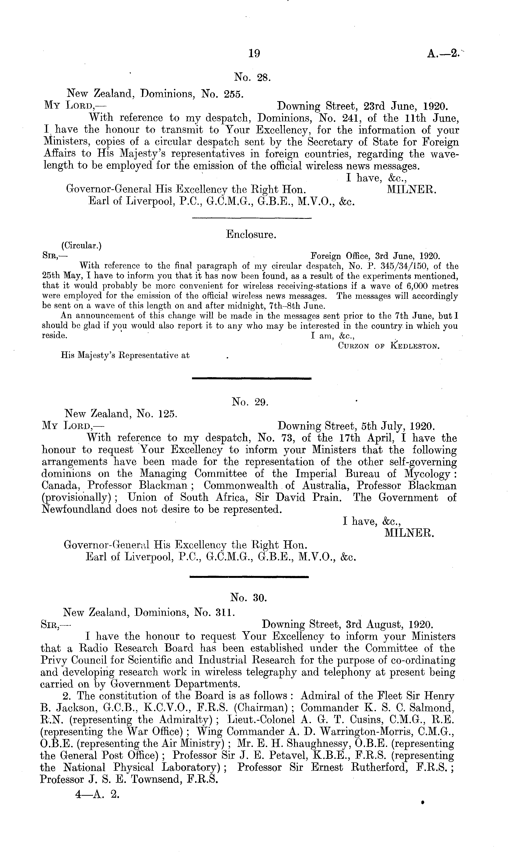 No. 30. New Zealand, Dominions, No. 311. Sir, — Downing Street, 3rd August, 1920. I have the honour to request Your Excellency to inform your Ministers that a Radio Research Board has been established under the Committee of the Privy Council for Scientific and Industrial Research for the purpose of co-ordinating and developing research work in wireless telegraphy and telephony at present being carried on by Government Departments. 2. The constitution of the Board is as follows : Admiral of the Fleet Sir Henry B. Jackson, G.C.B, K.C.V.O, F.R.S. (Chairman) ; Commander K. S. C. Salmond, R.N. (representing the Admiralty) ; Lieut.-Colonel A. G. T. Cusins, C.M.G, R.E. (representing the War Office) ; Wing Commander A. D. Warrington-Morris, C.M.G, 0.8. E. (representing the Air Ministry) ; Mr. E. H. Shaughnessy, 0.8. E. (representing the General Post Office) ; Professor Sir J. E. Petavel, K.B.E, F.R.S. (representing the National Physical Laboratory) ; Professor Sir Ernest Rutherford, F.R.S. ; Professor J. S. E. Townsend, F.R.S.