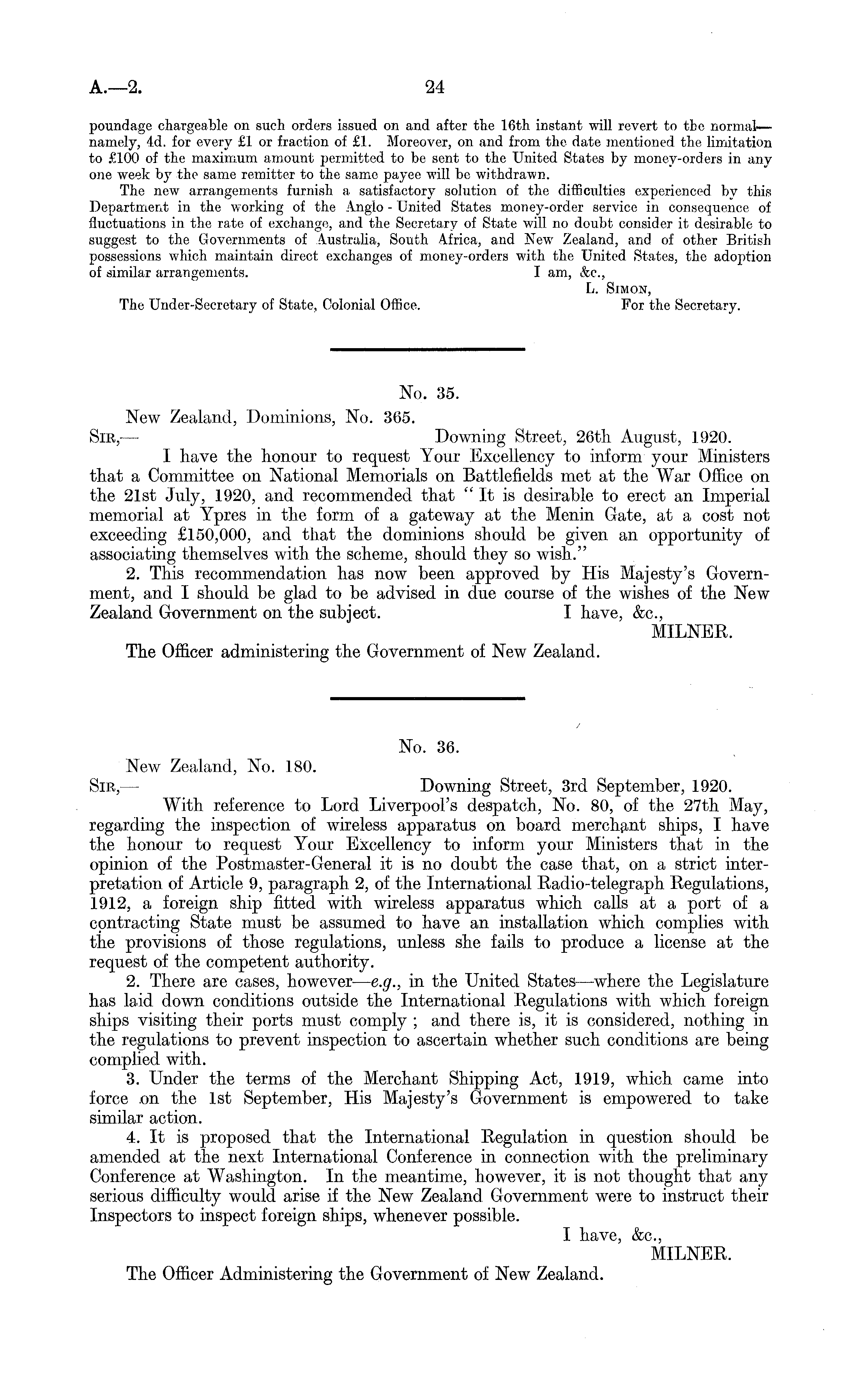 No. 36. New Zealand, No. 180. Sir, — Downing Street, 3rd September, 1920. With reference to Lord Liverpool's despatch, No. 80, of the 27th May, regarding the inspection of wireless apparatus on board merchant ships, I have the honour to request Your Excellency to inform your Ministers that in the opinion of the Postmaster-General it is no doubt the case that, on a strict interpretation of Article 9, paragraph 2, of the International Radio-telegraph Regulations, 1912, a foreign ship fitted with wireless apparatus which calls at a port of a contracting State must be assumed to have an installation which complies with the provisions of those regulations, unless she fails to produce a license at the request of the competent authority. 2. There are cases, however— e.g., in the United States—where the Legislature has laid down conditions outside the International Regulations with which foreign ships visiting their ports must comply ; and there is, it is considered, nothing in the regulations to prevent inspection to ascertain whether such conditions are being complied with. 3. Under the terms of the Merchant Shipping Act, 1919, which came into force .on the Ist September, His Majesty's Government is empowered to take similar action. 4. It is proposed that the International Regulation in question should be amended at the next International Conference in connection with the preliminary Conference at Washington. In the meantime, however, it is not thought that any serious difficulty would arise if the New Zealand Government were to instruct their Inspectors to inspect foreign ships, whenever possible. I have, &c, MILNER. The Officer Administering the Government of New Zealand.