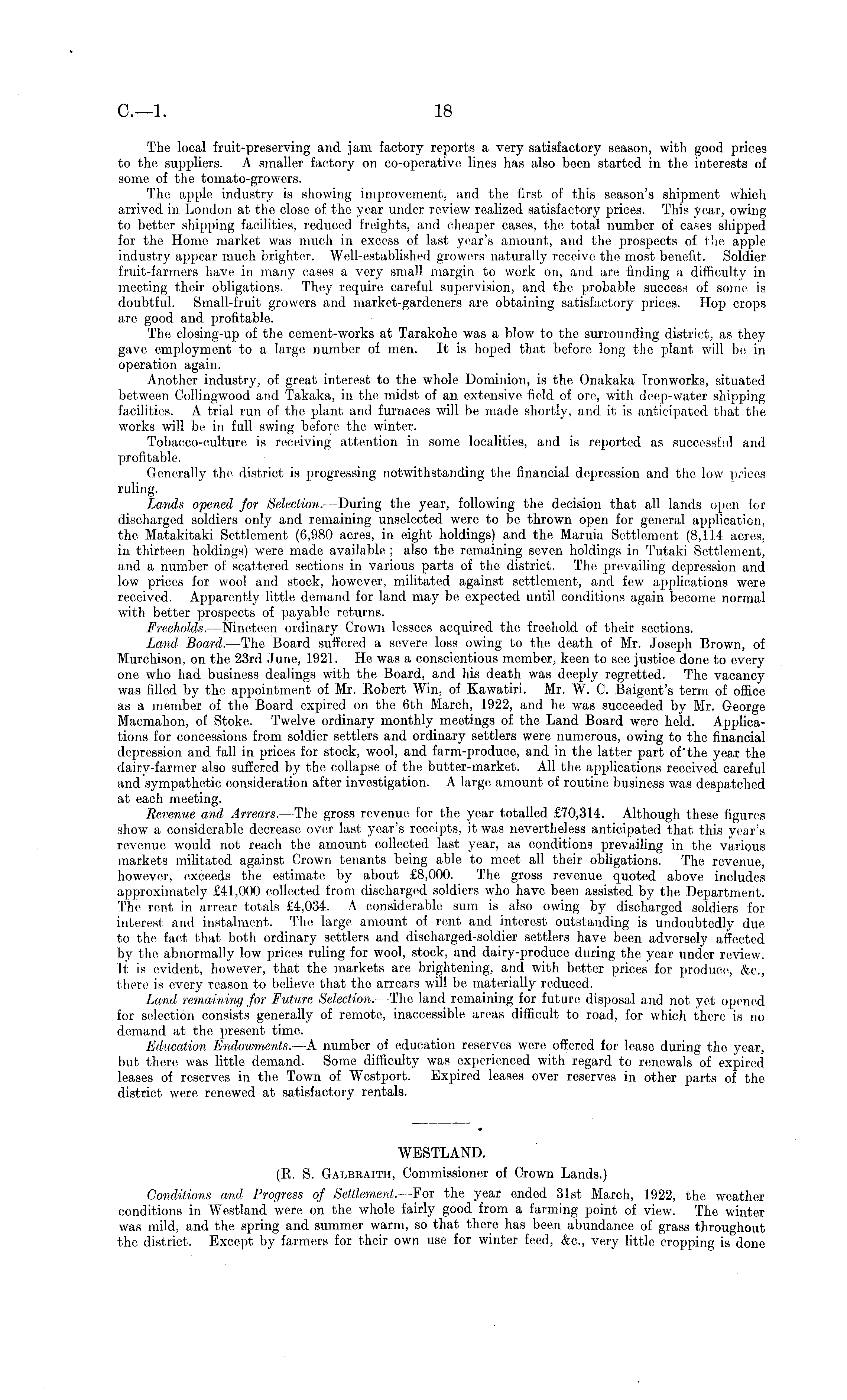 The local fruit-preserving and jam. factory reports a very satisfactory season, with good prices to the suppliers. A smaller factory on co-operative lines has also been started in the interests of some of the tomato-growers. The apple industry is showing improvement, and the first of this season's shipment which arrived in London at the close of the year under review realized satisfactory prices. This year, owing to better shipping facilities, reduced freights, and cheaper cases, the total number of cases shipped for the Home market was much in excess of last year's amount, and the prospects of the apple industry appear much brighter. Well-established growers naturally receive, the most benefit. Soldier fruit-farmers have in many cases a very small margin to work on, and are finding a difficulty in meeting their obligations. They require careful supervision, and the probable success of some is doubtful. Small-fruit growers and market-gardeners are obtaining satisfactory prices. Hop crops are good and profitable. The closing-up of the cement-works at Tarakohe was a blow to the surrounding district, as they gave employment to a largo number of men. It is hoped that before long the plant will be in operation again. Another industry, of great interest to the whole Dominion, is the Onakaka Ironworks, situated between Collingwood and Takaka, in the midst of an. extensive field of ore, with deep-water shipping facilities. A trial run of the plant and furnaces will be made shortly, and it is anticipated that the works will be in full swing before the winter. Tobacco-culture is receiving attention in some localities, and is reported as successful and profitable. Generally the district is progressing notwithstanding the financial depression and the low prices ruling. Lands opened for Selection.- -During the year, following the decision that all lands open for discharged soldiers only and remaining unselected were to be thrown open for general application, the Matakitaki Settlement (6,980 acres, in eight holdings) and the Maruia Settlement (8,114 acres, in thirteen holdings) were made available ; also the remaining seven holdings in Tutaki Settlement, and a number of scattered sections in various parts of the district. The prevailing depression and low prices for wool and stock, however, militated against settlement, and few applications were received. Apparently little demand for land may be expected until conditions again become normal with better prospects of payable returns. Freeholds. —Nineteen ordinary Crown lessees acquired the freehold of their sections. Land Board. —The Board suffered a severe loss owing to the death of Mr. Joseph Brown, of Murchison, on the 23rd June, 1921. He was a conscientious member, keen to sec justice done to every one who had business dealings with the Board, and his death was deeply regretted. The vacancy was filled by the appointment of Mr. Robert Win, of Kawatiri. Mr. W. C. Baigont's term of office as a member of the Board expired on the 6th March, 1922, and he was succeeded by Mr. George Macmahon, of Stoke. Twelve ordinary monthly meetings of the Land Board were held. Applications for concessions from soldier settlers and ordinary settlers were numerous, owing to the financial depression and fall, in prices for stock, wool, and farm-produce, and in the latter part of'the year the dairy-farmer also suffered by the collapse of the butter-market. All the applications received careful and sympathetic consideration after investigation. A large amount of routine business was despatched at each meeting. Revenue and Arrears. —The gross revenue for the year totalled £70,314. Although these figures show a considerable decrease over last year's receipts, it was nevertheless anticipated, that this year's revenue would not reach the amount, collected last year, as conditions prevailing in the various markets militated against Crown tenants being able to meet all their obligations. The revenue, however, exceeds the estimate by about £8,000. The gross revenue quoted above includes approximately £41,000 collected from discharged soldiers who have been assisted by the Department. The rent in arrcar totals £4,034. A considerable sum is also owing by discharged soldiers for interest and instalment. The large amount of rent and interest outstanding is undoubtedly due to the fact that both ordinary settlers and discharged-soldier settlers have been adversely affected by the abnormally low prices ruling for wool, stock, and dairy-produce during the year under review. It is evident, however, that the markets are brightening, and with bettor prices for produce, &c, there is every reason to believe that the arrears will be materially reduced. Land remaining for Future Selection.- -The land remaining for future disposal and not yet opened for selection consists generally of remote, inaccessible areas difficult to road, for which there is no demand at the present time. Education Endowments. —A number of education reserves were offered for lease during the year, but there was little demand. Some difficulty was experienced with regard to renewals of expired leases of reserves in the Town of Westport. Expired leases over reserves in other parts of the district were renewed at satisfactory rentals. _ WESTLAND. (R. S. Galbraith, Commissioner of Crown Lands.) Conditions and Progress of Settlement.- For the year ended 31st March, 1922, the weather conditions in Westland were on the whole fairly good from a farming point of view. The winter was mild, and the spring and summer warm, so that there has been abundance of grass throughout the district. Except by farmers for their own use for winter feed, &c, very little cropping is done