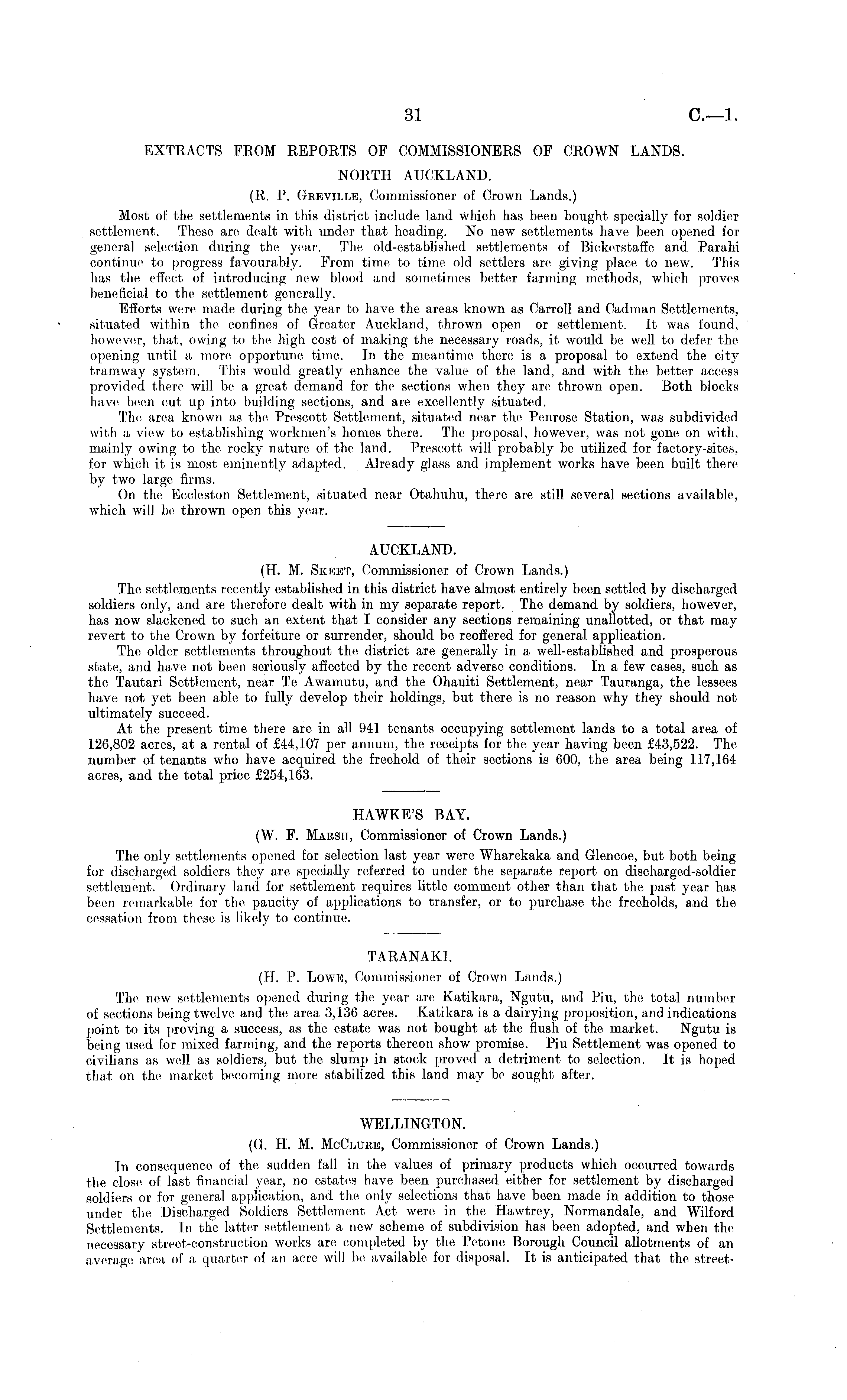 EXTRACTS FROM REPORTS OF COMMISSIONERS OF CROWN LANDS. NORTH AUCKLAND. (R. P. Greville, Commissioner of Crown Lands.) Most of the settlements in this district include land which has been bought specially for soldier settlement. Those are dealt with, under that heading. No new settlements have been opened for general selection during the year. The old-established settlements of Bickerstafle and Parahi continue to progress favourably. From time to time old settlers are giving place to new. This has the effect of introducing new blood and sometimes better farming methods, which proves beneficial to the settlement generally. Efforts were made during the year to have the areas known as Carroll and Cadman Settlements, situated within the confines of Greater Auokland, thrown open or settlement. It was found, however, that, owing to the high cost of making the necessary roads, it would be well to defer the opening until a more opportune time. In the meantime there is a proposal to extend the city tramway system. This would greatly enhance the value of the land, and with the better access provided there will be a great demand for the sections when they are thrown open. Both blocks have been cut up into building sections, and are excellently situated. The area known as the Prescott Settlement, situated near the Penrose Station, was subdivided with a view to establishing workmen's homes there. Tho proposal, however, was not gone on with, mainly owing to the rocky nature of the land. Prescott will probably be utilized for faetory-sites, for which it is most eminently adapted. Already glass and implement works have been built there by two large firms. On the Eccleston Settlement, situated near Otahuhu, there are still several sections available, which will be thrown open this year. AUCKLAND. (H. M. Skket, Commissioner of Crown Lands.) The settlements recently established in this district have almost entirely been settled by discharged soldiers only, and are therefore dealt with in my separate report. The demand by soldiers, however, has now slackened to such an extent that I consider any sections remaining unallotted, or that may revert to the Crown by forfeiture or surrender, should be reoffered for general application. The older settlements throughout the district are generally in a well-established and prosperous state, and have not been seriously affected by the recent adverse conditions. In a few cases, such as the Tautari Settlement, near Te Awamutu, and the, Ohauiti Settlement, near Tauranga, the lessees have not yet been able to fully develop their holdings, but there is no reason why they should not ultimately succeed. At the present time there are in all 941 tenants occupying settlement lands to a total area of 126,802 acres, at a rental of £44,107 per annum, the receipts for the year having been £43,522. The number of tenants who have acquired the freehold of their sections is 600, the area being 117,164 acres, and the total price £254,163. HAWKE'S BAY. (W. F. Marsh, Commissioner of Crown Lands.) The only settlements opened for selection last year were Wharekaka and Gloncoe, but both being for discharged soldiers they are specially referred to under the separate report on discharged-soldier settlement. Ordinary land for settlement requires little comment other than that the past year has been remarkable for the paucity of applications to transfer, or to purchase the freeholds, a.nd the cessation from these is likely to continue. TARANAKI. (11. P. Lowe, Commissioner of Crown Lands.) The. new settlements opened during the year are Katikara, Ngutu, and Piu, the total number of sections being twelve and the area 3,136 acres. Katikara is a dairying proposition, and indications point to its proving a success, as the estate was not bought at the flush of the, market. Ngutu is being used for mixed farming, and the reports thereon show promise. Piu Settlement was opened to civilians as well as soldiers, but the slump in stock proved a detriment to selection. It is hoped that on the, market becoming more stabilized this land may be sought after. WELLINGTON. (G. H. M. McClure, Commissioner of Crown Lands.) In consequence of the sudden fall in the values of primary products which occurred towards the close of last financial year, no estates have been purchased either for settlement by discharged soldiers or for general application, and. the only selections that have been made in addition to those under the Discharged Soldiers Settlement Act were in the Hawtrey, Normandale, and Wilford Settlements. In the latter settlement a new scheme of subdivision has been adopted, and when the necessary street-construction works are completed by the Petone Borough Council allotments of an average area of a quarter of an acre will be available for disposal. It is anticipated that the street-