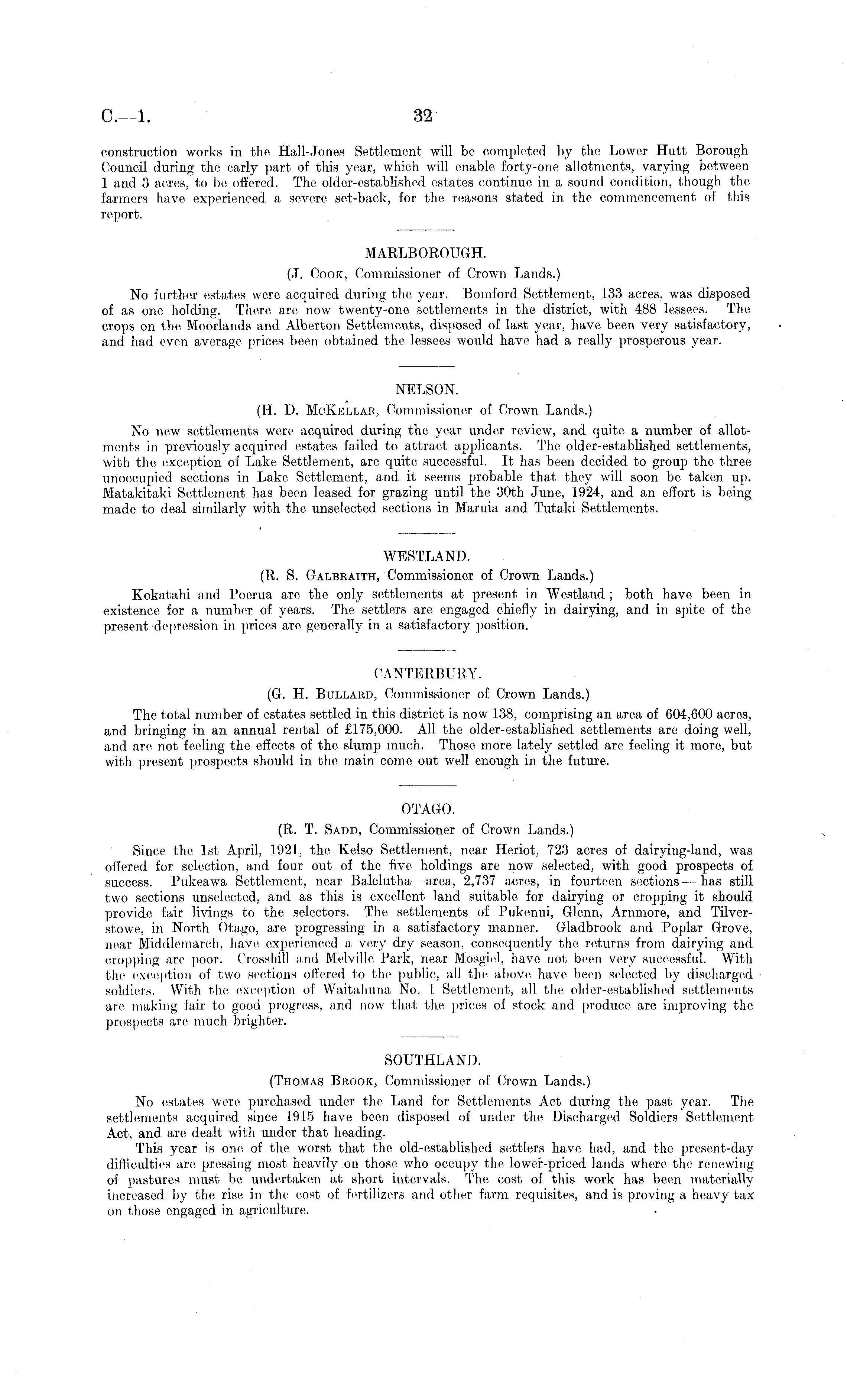 construction works in the Hall-Jones Settlement will, be completed by the Lower Hutt Borough Council, during the early part of this year, which will enable forty-one allotments, varying between 1 and 3 acres, to be offered. The older-established estates continue in a sound condition, though the farmers have experienced a severe set-back, for the reasons stated in the commencement of this report. MARLBOROUGH. (J. Cook, Commissioner of Crown Lands.) No further estates were acquired during the year. Bomford Settlement, 133 acres, was disposed of as one holding. There are now twenty-one settlements in the district, with 488 lessees. The crops on the Moorlands and Alberton Settlements, disposed of last year, have been very satisfactory, and had even average prices been obtained the lessees would have had a really prosperous year. NELSON. (H. D. McKellar, Commissioner of Crown Lands.) No new settlements were acquired during the year under review, and quite a number of allotments in previously acquired estates failed to attract applicants. The, old or-established settlements, with the exception of Lake Settlement, are quite successful. It has been decided to group the three unoccupied sections in Lake, Settlement, and it seems probable that they will soon be taken up. Matakitaki Settlement has been leased for grazing until the 30th June, 1924, and an effort is being made to deal similarly with the unselected sections in Maruia and Tutaki Settlements. WESTLAND. (R. S. Galbraith, Commissioner of Crown Lands.) Kokatahi and Poerua are the only settlements at present in Westland ; both have been in existence for a number of years. The settlers are engaged chiefly in dairying, and in spite of the present depression in prices are generally in a satisfactory position. CANTERBURY. (0. H. Bullard, Commissioner of Crown Lands.) The total number of estates settled in this district is now 138, comprising an area of 604,600 acres, and bringing in an annual rental of £175,000. All the older-established settlements are doing well, and are not feeling the effects of the slump much. Those more lately settled are feeling it more, but with present prospects should in the main come out well enough in the. future. OTAGO. (R. T. Sadd, Commissioner of Crown Lands.) Since the Ist April, 1921, the Kelso Settlement, near Heriot, 723 acres of dairying-land, was offered for selection, and four out of the five holdings are now selected, with good prospects of success. Pukeawa Settlement, near Balclutha area, 2,737 acres, in fourteen sections- has still two sections unselected, and as this is excellent land suitable for dairying or cropping it should provide fair livings to the selectors. The settlements of Pukenui, Glenn, Arnmore, and Tilverstowe, in North Otago, are progressing in a satisfactory manner. Gladbrook and Poplar Grove, near Middlemaroh, have experienced a very dry season, consequently tho returns from dairying and cropping are poor. Crosshill and Melville Park, near Mosgiel, have not been very successful. With the exception of two sections offered to tin- public, all the above have been selected by discharged soldiers. With the exception of Waitahuna No. 1 Settlement, all the older-established settlements are making fair to good progress, and now that the prices of stock and produce, are improving the prospects are much brighter. SOUTHLAND. (Thomas Brook, Commissioner of Crown Lands.) No estates were purchased under the, Land for Settlements Act during the past year. The settlements acquired since 1915 have been disposed, of under the Discharged Soldiers Settlement Act, and are dealt with under that heading. This year is one of the worst that the old-established settlers have, had, and the present-day difficulties are pressing most heavily on those, who occupy the lower-priced lands where the renewing of pastures must be undertaken at short intervals. The. cost of this work has been materially increased by the rise in the cost of fertilizers and other farm requisites, and is proving a heavy tax on those engaged in agriculture.