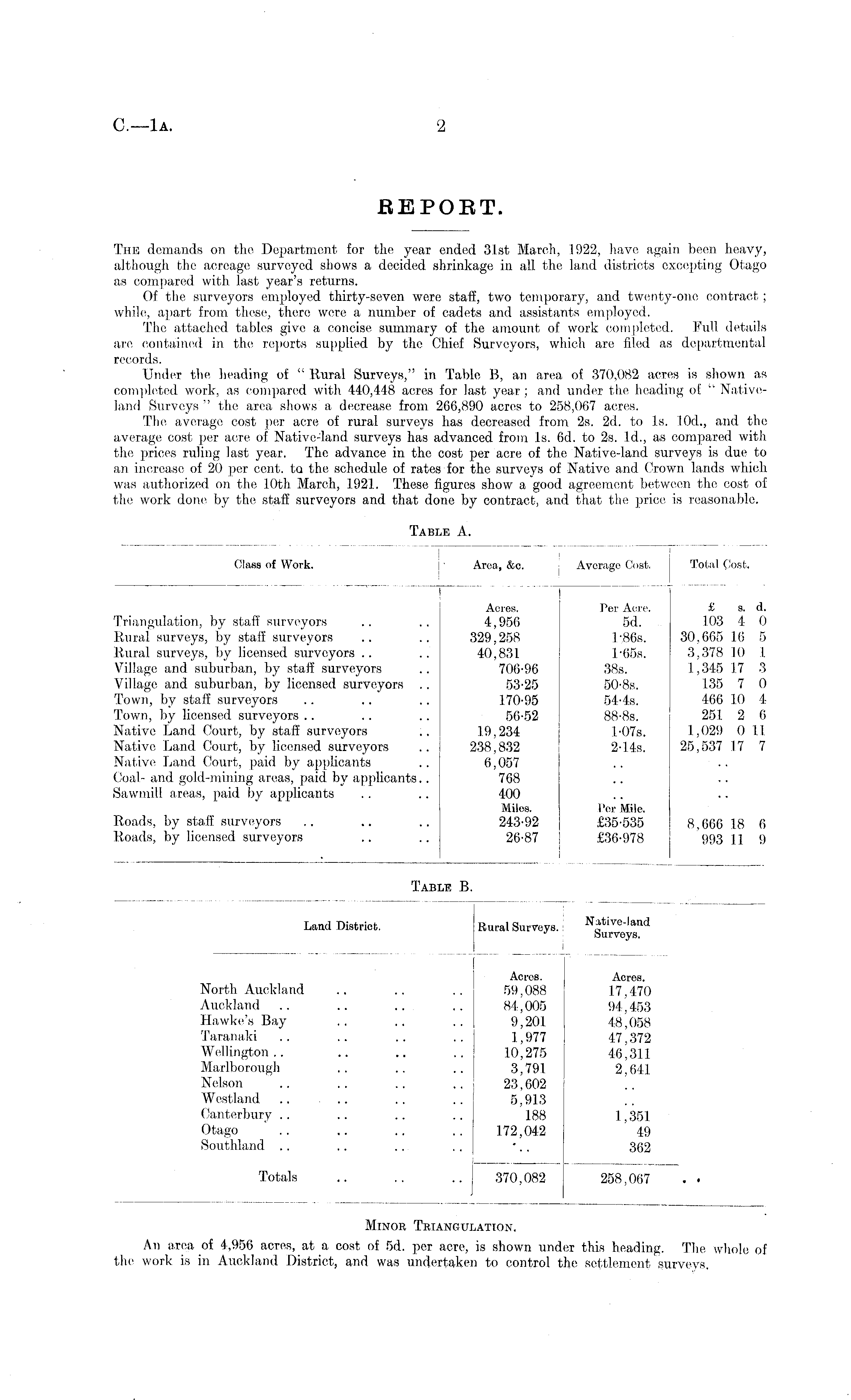 REPOET. The demands on the Department for the year ended 31st March, 1922, have again been heavy, although the acreage surveyed shows a decided shrinkage in all the land districts excepting Otago as compared with last year's returns. Of the surveyors employed thirty-seven were staff, two temporary, and twenty-one contract ; while, apart from these, there were a number of cadets and assistants employed. The attached tables give a concise summary of the amount of work completed. Full details are contained in the reports supplied by the Chief Surveyors, which are filed as departmental records. Under the heading of " Rural Surveys," in Table B, an area of 370,082 acres is shown as completed work, as compared with 440,448 acres for last year ; and under the heading of " Nativeland Surveys " the area shows a decrease from 266,890 acres to 258,067 acres. The average cost per acre of rural surveys has decreased from 2s. 2d. to Is. 10d., and the average cost per acre of Native-land surveys has advanced from Is. 6d. to 2s. Id., as compared with the prices ruling last year. The advance in the cost per acre of the Native-land surveys is due to an increase of 20 per cent, to the schedule of rates for the surveys of Native and Crown lands which was authorized on the 10th March, 192.1. These figures show a good agreement between the cost of the work done by the staff surveyors and that done by contract, and that the price is reasonable.