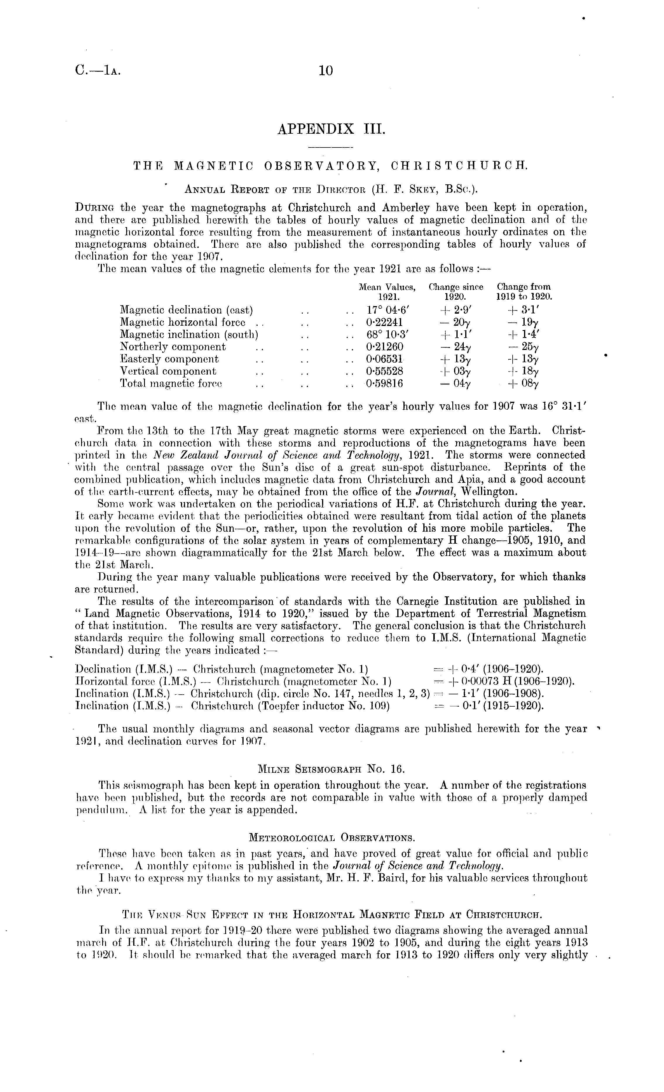APPENDIX 111. THE MAGNETIC OBSERVATORY, CHRISTCHURCH. Annual Report of the Director (H. F. Skky, B.Sc.). During the year the magnetographs at Christchurch and Amberley have been kept in operation, and. there are published herewith the tables of hourly values of magnetic declination and of tin; magnetic horizontal force resulting from the measurement of instantaneous hourly ordinates on the magnetograms obtained. There are also published the corresponding tables of hourly values of declination for the year 1907. The mean values of the magnetic elements for the year 1921 are as follows : — Mean Values, Change since Change from 1921. 1920. 1919 to 1920. Magnetic declination (cast) . . . . 17° 04-6' + 2-9' + 3-1/ Magnetic horizontal force . . . . .. 0-22241 - 20y - 19y Magnetic inclination (south) .. .. 68° 10-3' fl-.l' +14' Northerly component . . .. . . 0-21260 - 24y - 25y Easterly component .. .. .. 0-06531 + 13y -|- 13y Vertical component .. .. .. 0-55528 -f- 03y [ 18y Total magnetic force .. .. .. 0-59816 - 04y + 08y The mean value of the magnetic declination for the year's hourly values for 1907 was 16° 31-1' east. From the 13th to the 17th May great magnetic storms were experienced on the Earth. Christchurch data in connection with these storms and reproductions of the magnetograms have been printed in the New Zealand Journal of Science and Technology, 1921. The storms were connected with the central passage over the Sun's disc of a great sun-spot disturbance. Reprints of the combined publication, which includes magnetic data from Christchurch and Apia, and a good account of the earth-current effects, may be obtained from the office of the Journal, Wellington. Some work was undertaken on the periodical variations of H.F. at Christchurch during the year. It early became evident that the periodicities obtained were resultant from tidal action of the planets upon the revolution of the Sun —or, rather, upon the revolution of his more mobile particles. The remarkable configurations of the solar system, in years of complementary H change —1905, 1910, and 1914—19—are shown diagrammatically for the 21st March below. The effect was a maximum about the 21st March. During the year many valuable publications were received by the Observatory, for which thanks are returned. The results of the intercomparison' of standards with the Carnegie Institution are published in "Land Magnetic Observations, 1914 to 1920," issued by the Department of Terrestrial Magnetism of that institution. The results arc very satisfactory. The general conclusion is that the Christchurch standards require the following small corrections to reduce them to I.M.S. (International Magnetic Standard) during the years indicated : — Declination (1.M.5.) — Christchurch (magnetometer No. 1) = + 0-4' (1906-1920). Horizontal force (1.M.5.) — Christchurch (magnetometer No. ]) - + 0-00073 H (1906-1920). Inclination (1.M.5.) - Christchurch (dip. circle No. 147, needles 1, 2, 3) - - 1-1' (1906-1908). Inclination (1.M.5.) - Christchurch (Toepfcr inductor No. 109) - 0-1' (1915-1920). The usual monthly diagrams and seasonal vector diagrams are published herewith, for the year 1921, and declination curves for 1907. Milne Seismograph No. 16. This seismograph has been kept in operation throughout the year. A number of the registrations have been published, but the records are not comparable in value with those of a properly damped pendulum. A list for the year is appended. Meteorological Observations. These have been taken as in past years, and have proved of great value for official and public reference. A monthly epitome is published in the Journal of Science and Technology. 1 have to express my thanks to my assistant, Mr. H. F. Baird, for his valuable services throughout the year. The Venus-Sun Effect in the Horizontal Magnetic Field at Christchurch. In the annual report for 1919-20 there were' published two diagrams showing the averaged annual march of H.F. at Christchurch during the four years 1902 to 1905, and during the eight years 1913 to 1920. It should be remarked that the averaged march for 1913 to 1920 differs only very slightly