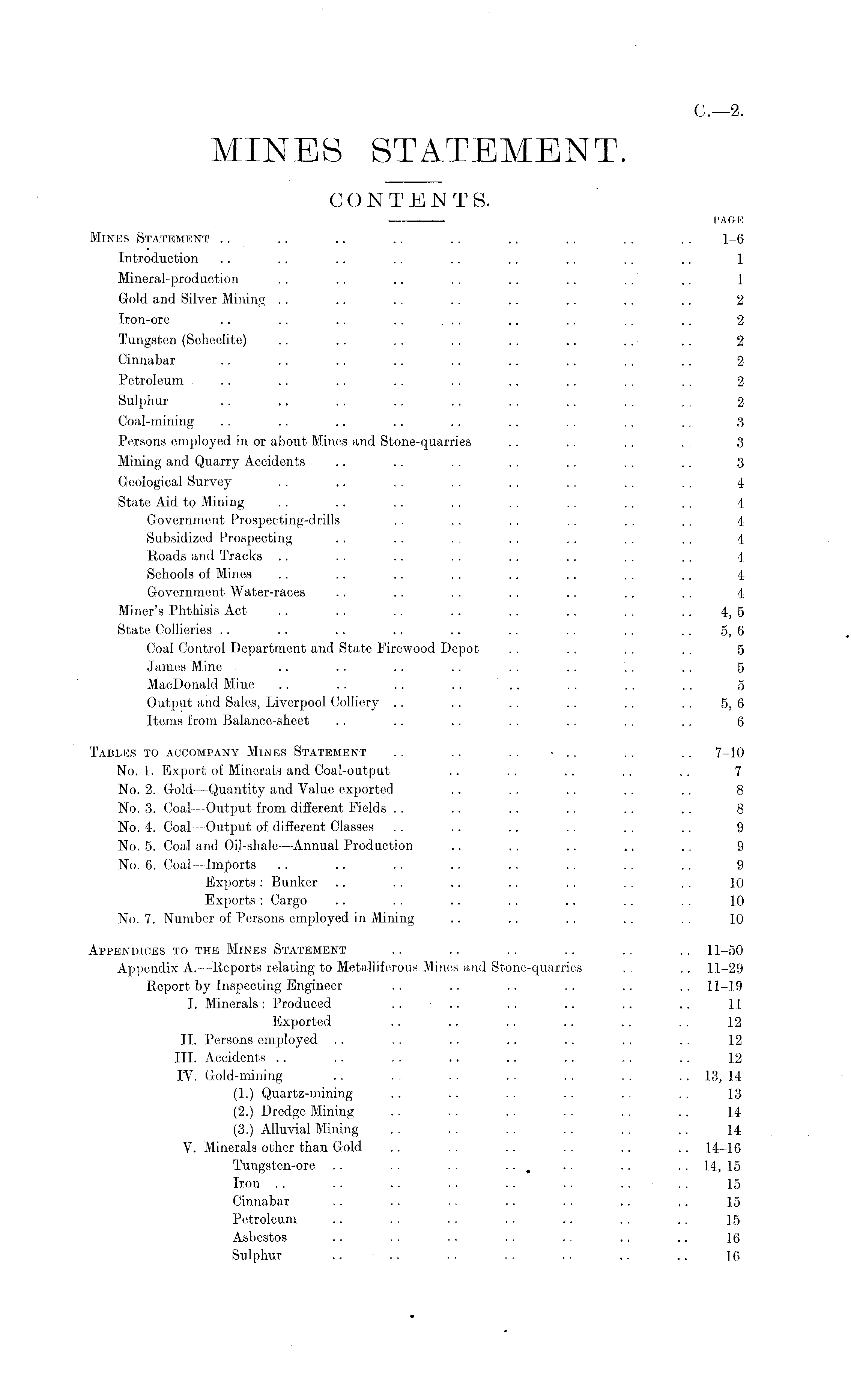 MINES STATEMENT. CONTBK T S. PAGE Mines Statement .. .. .. .. .. .. .. . . .. 1-6 Introduction .. .. .. .. .. .. .. .. .. 1 Mineral-production .... .. 1 Gold and Silver Mining .. .. . . .. .. .. .. .. 2 Iron-ore .. .. .. .. ... .. . . .. .. 2 Tungsten (Soheelite) . . .. . . . . .. .. .. .. 2 Cinnabar . . . . . . . . . . . . . . . . . . 2 Petroleum .. .. .. . . .. .. . . .. . . 2 Sulphur .. .. . . . . .. .. . . .. . . 2 Coal-mining . . . . .. .. .. .. . . .. . . 3 Persons employed in or about Mines and Stone-quarries .... 3 Mining and Quarry Accidents .. .. . . . . .. . . .. 3 Geological Survey . . .. . . . . . . .. 4 State Aid to Mining . . .. . . . . . . . . 4 Government Prospecting-drills .. .. .. . . . . .. 4 Subsidized Prospecting .. .. .. .. . . .. . , 4 Roads and Tracks .. .. . . .. .. .. .. . . 4 Schools of Mines .. .. .. . . .. ... . . 4 Government Water-races .. . . . . . . . . .. . . 4 Miner's Phthisis Act .. .. . . .. .. .. . . .. 4, 5 State Collieries .. .. .. .. .. .. .. .. . . 5, 6 Coal Control Department and State Firewood Depot .. .. . . .. 5 James Mine .. .. .. . . . . .. . . .. 5 Mac Donald Mine .. .. .. . . .. . . 5 Output and Sales, Liverpool Colliery .. .. .. . . . . 5, 6 Items from Balance-sheet .. .. .. . . .. . . . 6 Tables to accompany Mines Statement .. .. . . • .. .. .. 7-10 No. 1. Export oE Minerals and Coal-output .. . . .. .. . . 7 No. 2. Gold —Quantity and Value exported .. .. . . . . 8 No. 3. Coal —Output from different Fields . . .. .. . . . . . . 8 No. 4. Coal—Output of different Classes . . .. .. . . . . .. 9 No. 5. Coal and Oil-shale —Annual Production .. . . .. .. 9 No. 6. Coal—lmports .. .. .. .. .. .. . . .. 9 Exports : Bunker .. . . .. .. . . . . . . 10 Exports: Cargo .. . . .. .. .. .. . . 10 No. 7. Number of Persons employed in Mining .. .. . . .. . . 10 Appendices to the Mines Statement .. .. .. .. .. .. 11-50 Appendix A. —Reports relating to Metalliferous Mines and Stone-quarries .. .. 11-29 Report by Inspecting Engineer .. .. .. .. .. .. 11-19 I. Minerals: Produced . . .. .. .. . . .. 11 Exported . . .. .. .. .. . . 12 11. Persons employed . . . . .. .. . . . . . . 12 111. Accidents .. .. . . .. .. .. . . .. 12 IV. Gold-mining .. . . .. . . .. .. .. 13, 14 (1.) Quartz-mining . . .. . . .. . . . . 13 (2.) Dredge Mining . . .. . . .. . . .. 14 (3.) Alluvial Mining . . . . . . .. .. . . 14 V. Minerals other than Gold .. . . . . . . . . . . 14-16 Tungsten-ore . . . . . . .. # .. . . 14, 15 Iron .. .. .. .. . . .. .. . . 15 Cinnabar .. . . . . .. . . . . .. 15 Petroleum .. .. .. . . .. .. .. 15 Asbestos .. . . . . . . . . .. .. 16 Sulphur .. . . . . . . . . .. .. 16
