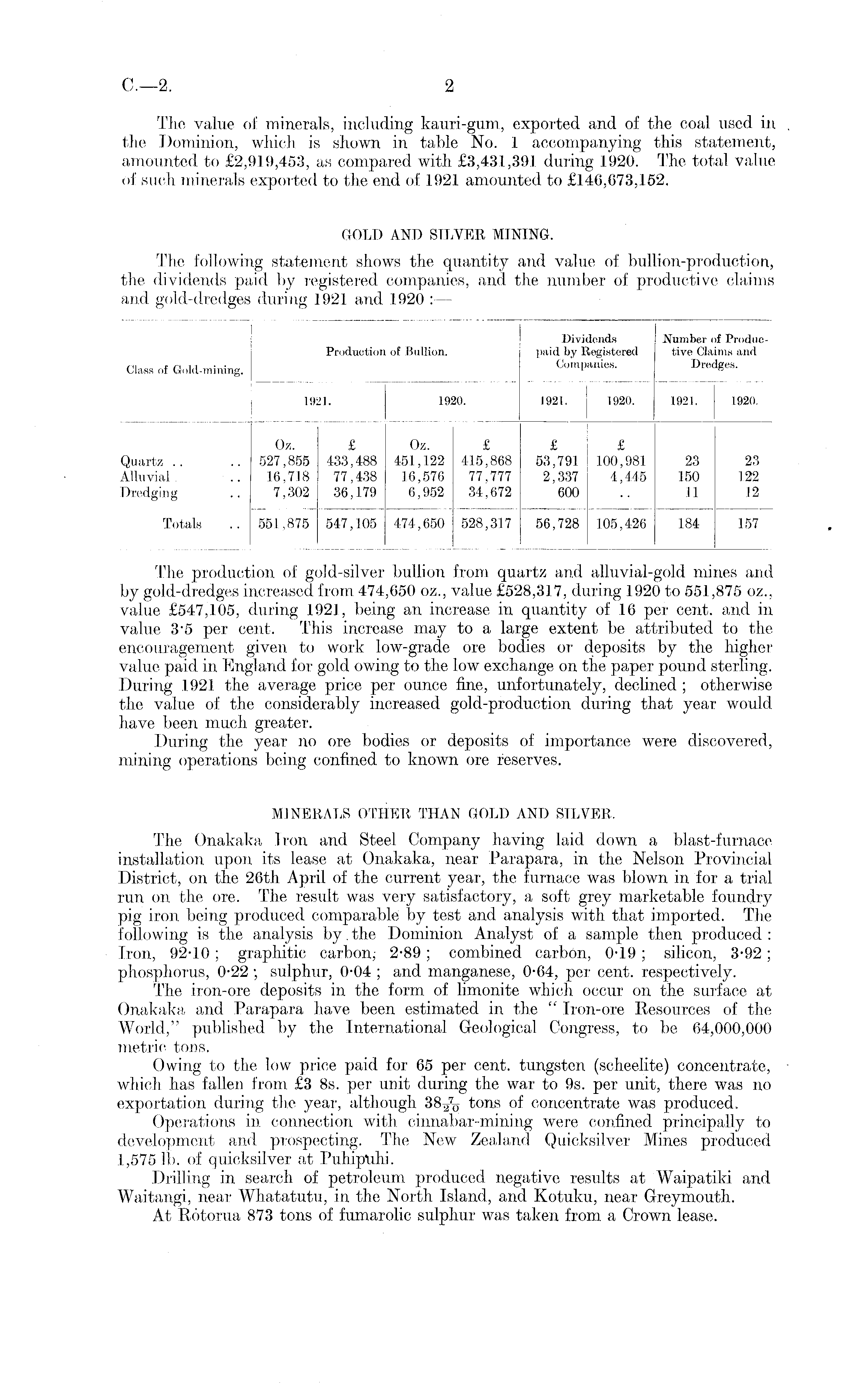 The value of minerals, including kauri-gum, exported and of the coal used in the Dominion, which is shown in table No. 1 accompanying this statement, amounted to £2,919,453, a.s compared with £3,431,391 during 1920. The total value of such minerals exported to the end of 1921 amounted to £146,673,152. GOLD AND SILVER MINING. The following statement shows the quantity and value of bullion-production, the dividends paid by registered companies, and the number of productive claims and gold-dredges during 1921 and 1920 : —