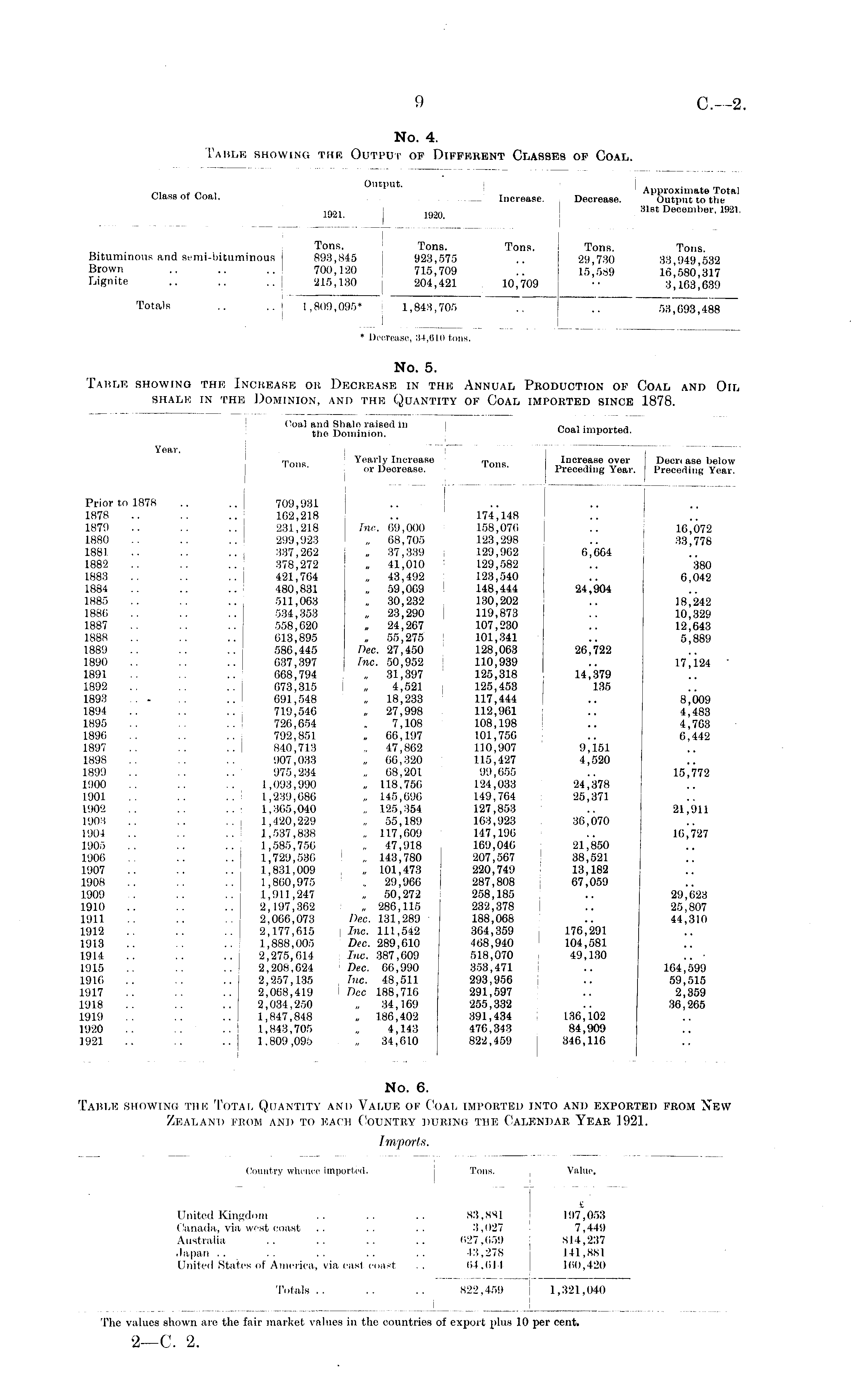No. 6. Table showing the Total Quantity and Value of Coal imported into and exported from New Zealand from and to each Country during the Calendar Year 1921.