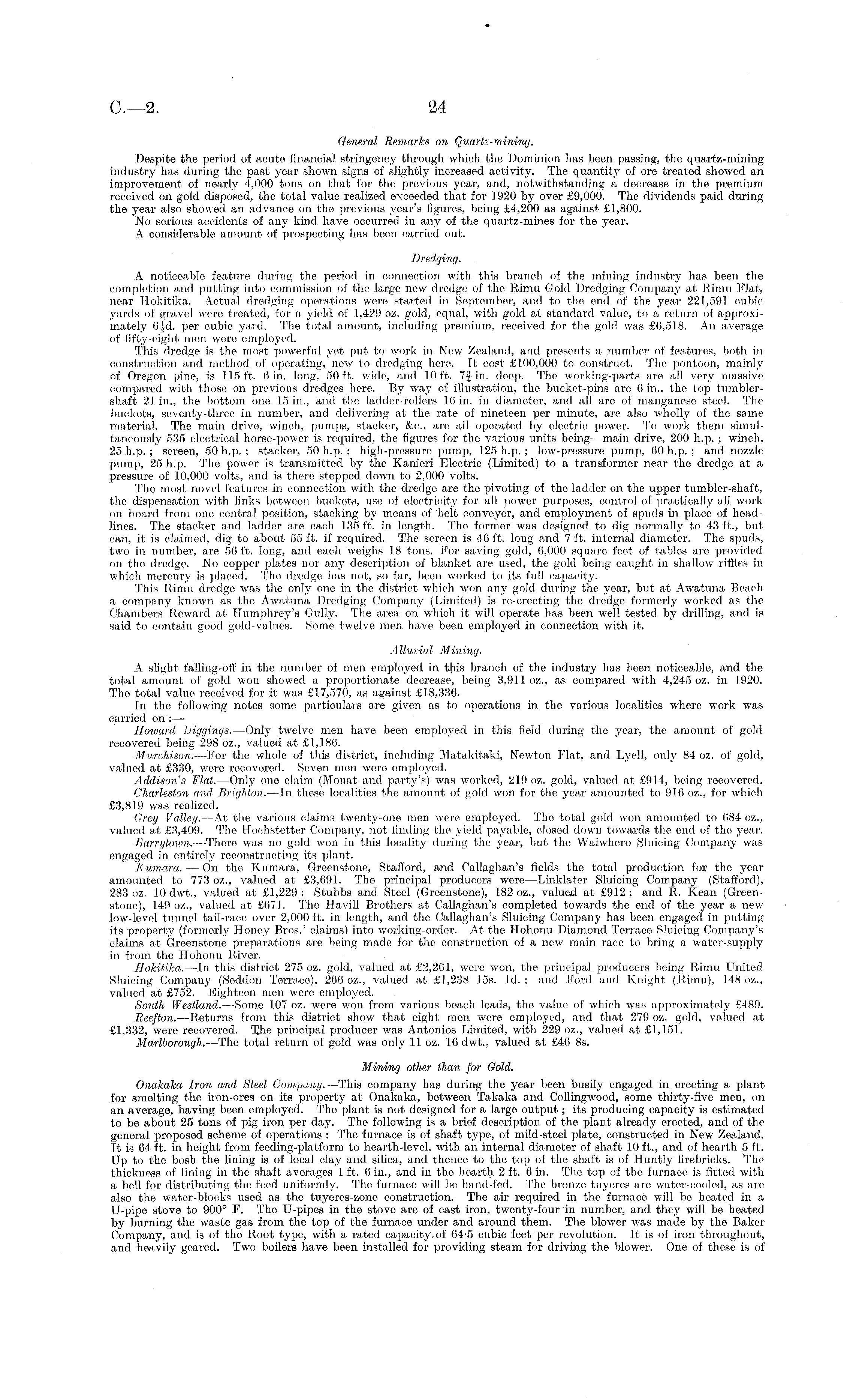 General Remarks on Quartz-mining. 'Despite the period of acute financial stringency through which the Dominion has been passing, the quartz-mining industry has during the past year shown signs of slightly increased activity. The quantity of ore treated showed an improvement of nearly 4,000 tons on that for the previous year, and, notwithstanding a decrease in the premium received on gold disposed, the total valuo realized exceeded that for 1920 by over £9,000. The dividends paid during the year also showed an advance on the previous year's figures, being £4,200 as against £1,800. No serious accidents of any kind have occurred in any of the quartz-mines for the year. A considerable amount of prospecting has been carried out. Dredging. A noticeable feature during the period in connection with this branch of the mining industry has been the completion and putting into commission of the large new dredge of the Rimu Gold Dredging Company at Riniu Flat, near Hokitika. Actual dredging operations were started in September, and to the end of the year 221,591 cubic yards of gravel were treated, for a yield, of 1,429 oz. gold, equal, with gold at standard value, to a return of approximately 6fd. per cubic yard. The total amount, including premium, received for the gold was £6,518. An average of fifty-eight men were employed. This dredge is the most powerful yet put to work in New Zealand, and presents a number of features, both in construction and method* of operating, new to dredging here. It cost £100,000 to construct. The pontoon, mainly of Oregon pine, is 115 ft. 6 in. long, 50 ft. wide, and 10 ft. 7 J in. deep. The working-parts are all very massive compared with those on previous dredges here. By way of illustration, the bucket-pins are 0 in., the top tumblershaft 21 in., the bottom one 15 in., and the ladder-rollers 10 in. in diameter, and all are of manganese steel. The buckets, seventy-three in number, and delivering at the rate of nineteen per minute, are also wholly of the same material. The main drive, winch, pumps, stacker, &c, arc all operated by electric power. To work them simultaneously 535 electrical horse-power is required, the figures for the various units being—main drive, 200 h.p. ; winch, 25 h.p. ; screen, 50 h.p. ; stacker, 50 h.p. ; high-pressure pump, 125 h.p. ; low-pressure pump, 60 h.p. ; and nozzle pump, 25 h.p. The power is transmitted, by the Kanicri Electric (Limited) to a transformer near the dredge at a pressure of 10,000 volts, and is there stepped down to 2,000 volts. The most novel features in connection with the dredge are the pivoting of tho ladder on the upper tumbler-shaft, the dispensation with links between buckets, use of electricity for all power purposes, control of practically all work on board from one central position, stacking by means of belt conveyer, and employment of spuds in. place of headlines. The stacker and ladder are each 135 ft. in length. The former was designed to dig normally to 43 ft., but can, it is claimed, dig to about 55 ft. if required. The screen is 46 ft. long and 7 ft. internal diameter. The spuds, two in number, are 56 ft. long, and each weighs 18 tons. For saving gold, 6,000 square feet of tables are provided on the dredge. No copper plates nor any description of blanket are used, the gold being caught in shallow riffles in which mercury is placed. The dredge has not, so far, been worked to its full capacity. This Rimu dredge was the only one in the district which won any gold during the year, but at Awatuna Beach a company known as the Awatuna Dredging Company (Limited) is re-erecting the dredge formerly worked as the Chambers Reward at Humphrey's Gully. The area on which it will operate has been well tested, by drilling, and is said to contain good gold-values. Some twelve men have been employed in connection with it. Alluvial Mining. A slight falling-off in the number of men employed in this branch of the industry has been noticeable, and the total amount of gold won showed a proportionate decrease, being 3,91 I oz., as compared with 4,245 oz. in 1920. The total value received for it was £17,570, as against £18,386. In the following notes some particulars are given as to operations in the various localities where work was carried, on :— Howard Ijigginge, —Only twelve men have been employed in this field during the year, the amount of gold recovered being 298 oz., valued at £1,186. M'urchison. —For tho whole of this district, including Matakitaki, Newton Flat, and Lyell, only 84 oz. of gold, valued at £330, were recovered. Seven men were employed. Addition's Flat. —Only one claim (Mouat and part3''s) was worked, 219 oz. gold, valued at £914, being recovered. Charleston and Brighton. —ln these localities the amount of gold won for the year amounted to 916 oz., for which £3,819 was realized. Grey Valley. —At the various claims twenty-one men were employed. The total gold won amounted to 684 oz., valued at £3,409. The Hoohstetter Company, not finding the yield payable, closed down towards the end of the year. Barrylown. —There was no gold won in this locality during the year, but the Waiwhero Sluicing Company was engaged in entirely reconstructing its plant. Rumara. —On the Kumara, Greenstone, Stafford, and Callaghan's fields the total production for the year amounted to 773 oz., valued at £3,691. The principal producers were—Linklater Sluicing Company (Stafford), 283 oz. lOdwt., valued at £1,229; Stubbs and. Steel (Greenstone), 182 oz., valued at £912; and R. Kean (Greenstone), 149 oz., valued at £671. The Havill Brothers at Callaghan's completed towards the end of the year a new low-level tunnel tail-race over 2,000 ft. in length, and the Callaghan's Sluicing Company has been engaged in putting its property (formerly Honey Bros.' claims) into working-order. At the ITohonu Diamond Terrace Sluicing Company's claims at Greenstone preparations are being made for the construction of a new main