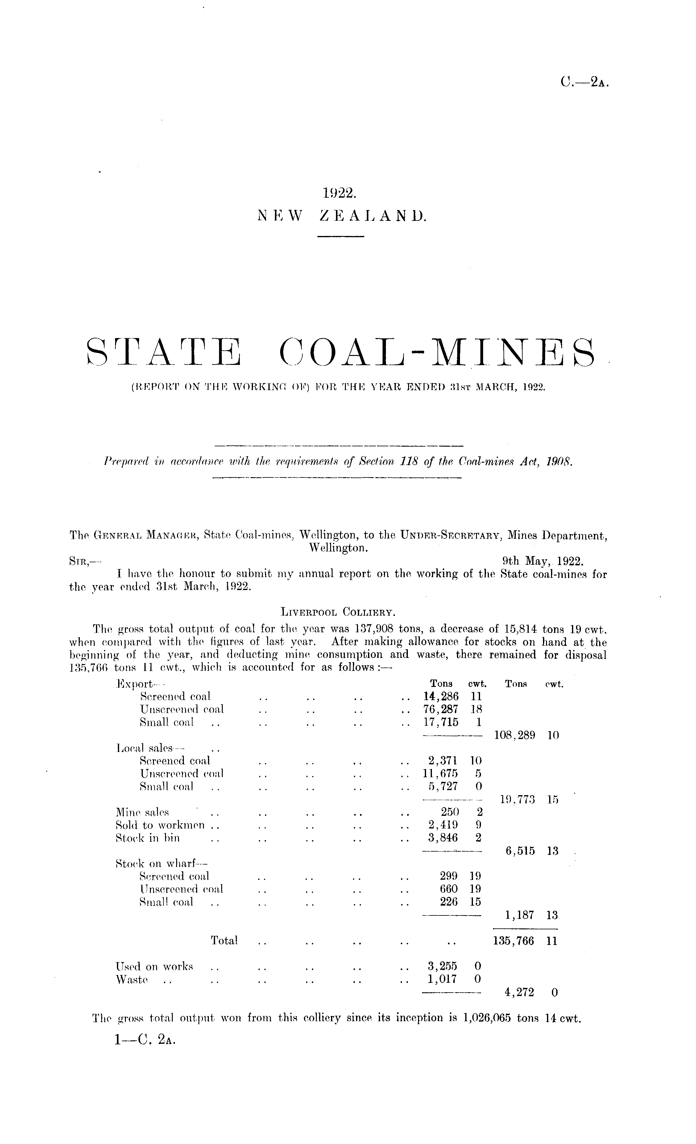 The General Manager, State Coal-mines, Wellington, to the Under-Secretary, Mines Department, Wellington. Sir,— 9th May, 1922. I have the honour to submit my annual report on the working of the State coal-mines for the year ended 31st March, 1922. Liverpool Colliery. The gross total output of coal for the year was 137,908 tons, a decrease of .15,814 tons 19 cwt. when compared with, the figures of last year. After making allowance for stocks on hand at the beginning of the year, and deducting mine consumption and waste, there remained for disposal 135,766 tons 11 cwt., which is accounted for as follows:— Export — Tons cwt. Tons cwt. Screened coal .. .. .. .. 14,286 11 Unscreened, coal .. .. . . .. 76,287 18 Small coal .. .. .. .. .. 17,715 1 — 108,289 10 Local sales — Screened coal .. .. .. .. 2,371 10 Unscreened coal .. .. .. .. 11,675 5 Small coal .. .. .. .. .. 5,727 0 19,773 15 Mine sales .. .. .. .. .. 250 2 Sold to workmen .. . .. .. .. .. 2,419 9 Stock in bin .. .. .. .. .. 3,846 2 6,515 13 •, . Stock on wharf— Screened coal .. .. .. .. 299 19 Unscreened coal . . . . . . .. 660 19 Small coal .. .. .. .. .. 226 1.5 1,187 13 Total .. .. .. .. .. 135,766 11 Used on works .. . . . . .. .. 3,255 0 Waste .. .. .. 1,01.7 0 4,272 0 The gross total output won from this colliery since its inception is 1,026,065 tons 14 cwt.