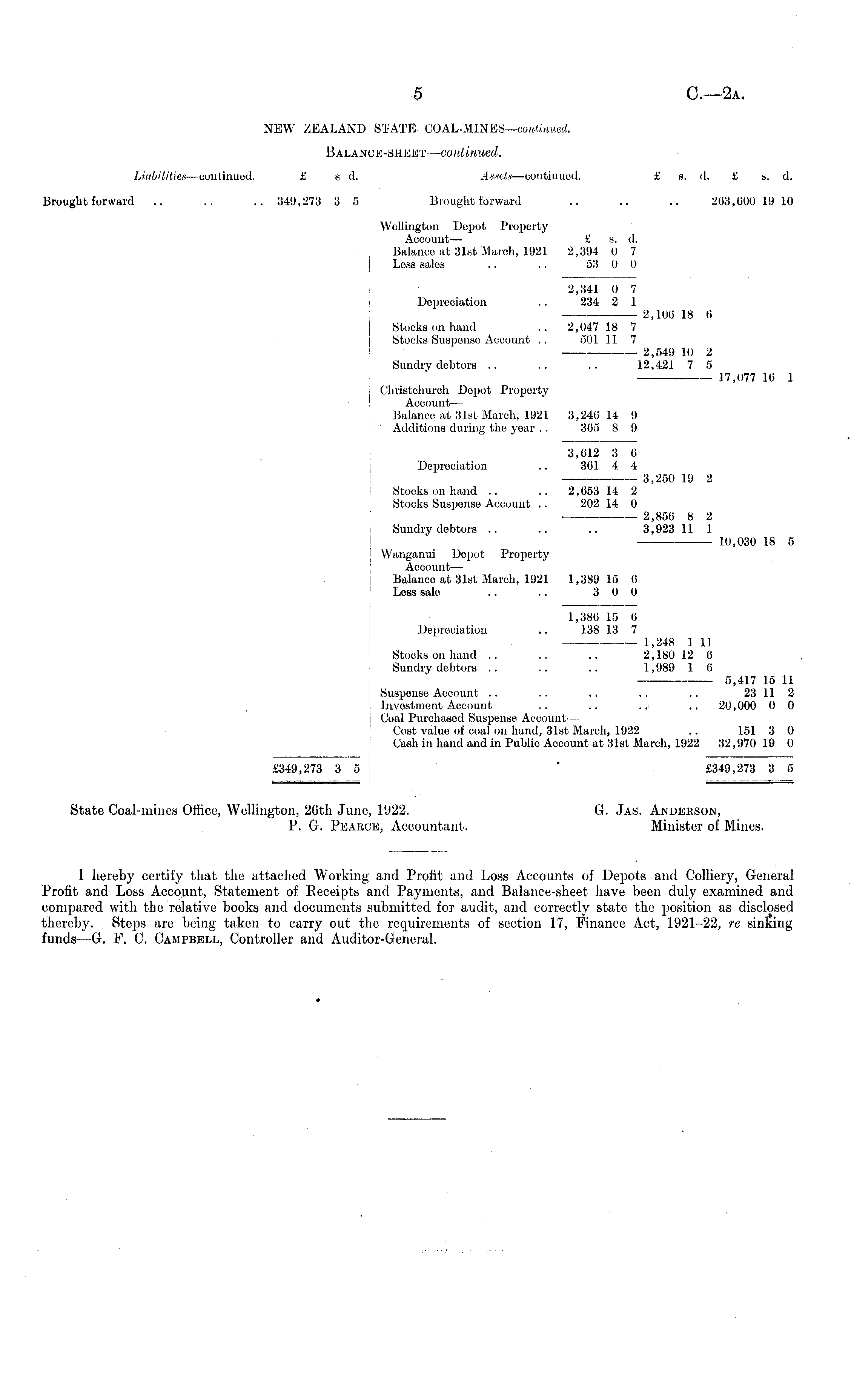 NEW ZEALAND STATE GoAJcMJ,NEB— continued. Balance-sheet-— ooniimtsd. Liabilities —continued. £ s d. Assets —continued. £ s. d. £ s. d. Brought forward .. .. .. 349,273 3 5 j Brought forward .. .. .. 203,090 19 10 Wellington Depot Property Account — £ s. d. Balance at 31st March, 1921 2,394 0 7 Less sales .. .. 53 (I 0 2,341 0 7 Depreciation .. 234 2 1 . 2,100 18 0 Stocks on hand . . 2,047 18 7 Stocks Suspense Account .. 501 11 7 2,549 10 2 Sundry debtors . . . . . . 12,421 7 5 17,077 10 1 Christchuroh Depot Property Account— Balance at 31st March, 1921 3,240 14 9 Additions during the yoar .. 305 8 9 3,012 3 0 Depreciation .. 301 4 4 —— 3,250 19 2 Stocks on hand .. .. 2,053 14 2 Stocks Suspense Account .. 202 14 0 2,850 8 2 Sundry debtors . . .. .. 3,923 11 1 10,030 18 5 Wanganui Depot Property Account— Balanco at 31st March, 1921 1,389 15 0 Less sale .. .. 3 0 0 1,380 15 0 Depreciation .. 138 13 7 1,248 1 11 Stocks on hand .. .. .. 2,180 12 0 Sundry debtors .. .. .. 1,989 1 0 5,417 15 11 Suspense Account .. .. .. .. .. 23 11 2 Investment Account .. .. . v .. 20,000 0 0 Coal Purchased Suspense Account — Cost value of coal on hand, 31st March, 1922 .. 151 3 0 Cash in hand and in Public Account at 31st March, 1922 32,970 19 0 £349,273 3 5 , £349,273 3 5 State Coal-mines Office, Wellington, 26th June, 1922. G. Jas. Anderson, P. G. Pearce, Accountant. Minister of Mines. I hereby certify that the attached Working and Profit and Loss Accounts of Depots and Colliery, General Profit and Loss Account, Statement of Receipts and Payments, and Balance-sheet have been duly examined and compared with the relative books and documents submitted for audit, and correctly state the position as disclosed thereby. Steps are being taken to carry out the requirements of section 17, Finance Act, 1921-22, re sinking funds —G. F. C. Campbell, Controller and Auditor-General.