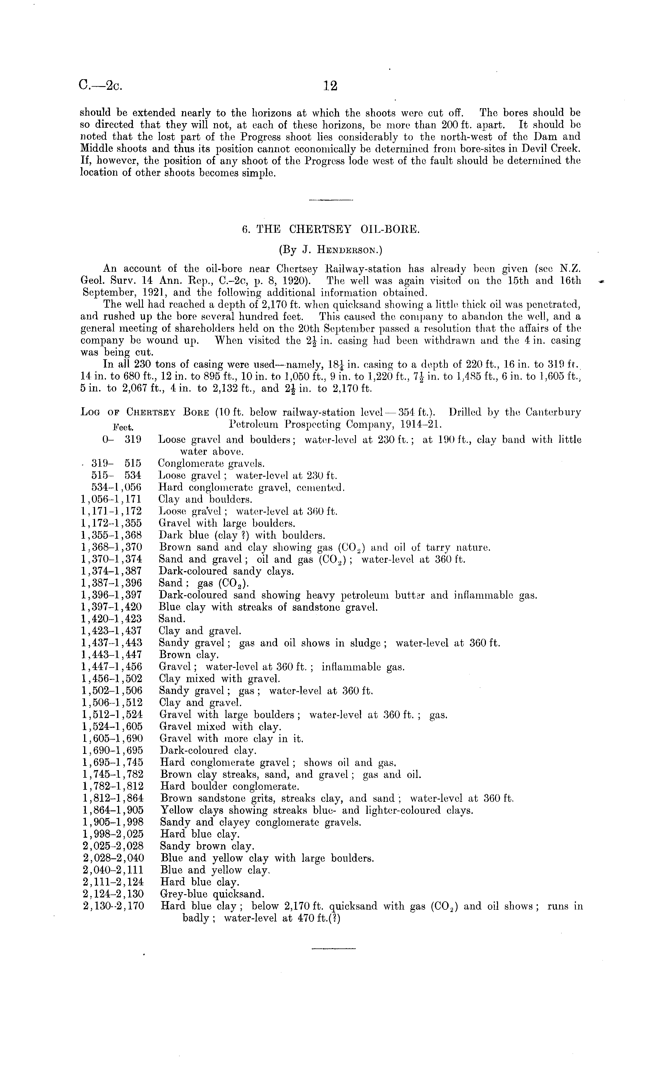 6. THE CHERTSEY OIL-BORE. (By J. Henderson.) An account of the oil-bore near Chertsey Railway-station has already been given (see N.Z. Geol. Surv. 14 Ann. Rep., C.-2c, p. 8, 1920). The well was again visited on tho 15th and 16th September, 1921, and the following additional information obtained. The well had reached a depth of 2,170 ft. when quicksand showing a little thick, oil was penetrated, and rushed up the bore several hundred feet. This caused the company to abandon the well, and a general meeting of shareholders held on the 20th September passed a resolution that the affairs of the company bo wound up. When visited the 2§ in. casing had been withdrawn and the 4 in. casing was being cut. In all 230 tons of casing were used—namely, 181 in. casing to a depth of 220 ft., 16 in. to 319 ft. 14 in. to 680 ft., 1,2 in. to 895 ft., 10 in. to 1,050 ft., 9 in. to 1,220 ft., 71, in. to 1,185 ft., 6 in. to 1,605 ft., 5 in. to 2,067 ft., 4 in. to 2,132 ft., and 2J in. to 2,170 ft. Log of Chertsey Bore (10 ft. below railway-station level — 351 ft.). Drilled by the Canterbury p ce t. Petroleum Prospecting Company, 1914-21. 0- 319 Loose gravel and boulders; water-level at 230 ft.; at 190 ft., clay band with little water above. • 319- 515 Conglomerate gravels. 515- 534 Loose gravel; water-level at 230 ft. 534-1,056 Hard conglomerate gravel, cemented. 1,056-1,171 Clay and boulders. 1,171-1, .172 Loose gravel; water-level at 360 ft. 1,172-1,355 Gravel with large boulders. 1,355-1,368 Dark blue (clay?) with boulders. 1,368-1,370 Brown sand and clay showing gas (CO 2 ) and oil of tarry nature. 1,370-1,374 Sand and gravel; oil and gas (CO 2 ) ; "water-level at 360 ft. 1,374-1,387 Dark-coloured sandy clays. 1,387-1,396 Sand; gas (CO 2 ). 1,396-1,397 Dark-coloured sand showing heavy petroleum butter and inflammable gas. 1,397-1,420 Blue, clay with streaks of sandstone gravel. 1,420-1,423 Sand. 1,423-1,437 Clay and gravel. 1,437-1,443 Sandy gravel; gas and oil shows in sludge; water-level at 360 ft. 1,443-1,447 Brown clay. 1,447-1,456 Gravel; water-level at 360 ft. ; inflammable gas. 1,456-1,502 Clay mixed with gravel. 1,502-1,506 Sandy gravel; gas; water-level at 360 ft, 1,506-1,512 Clay and gravel. 1,512-1,524 Gravel with large boulders; water-level at 360 ft. ; gas. 1,524-1,605 Gravel mixed with clay. 1,605-1,690 Gravel with more clay in it. 1,690-1,695 Dark-coloured clay. 1,695-1,745 Hard conglomerate gravel; shows oil and gas. 1,745-1,782 Brown clay streaks, sand, and gravel; gas and oil. 1,782-1,812 Hard boulder conglomerate. 1,812-1,864 Brown sandstone grits, streaks clay, and sand; water-level at 360 ft. 1,864-1,905 Yellow clays showing streaks blue- and lighter-coloured clays. 1,905-1.998 Sandy and clayey conglomerate gravels. Hard blue clay. 2,025-2,028 Sandy brown clay. 2,028-2,040 Blue and yellow clay with large boulders. 2,040-2,111 Blue and yellow clay. 2,111-2,124 Hard blue clay. 2,124-2,130 Grey-blue quicksand. 2,130-2,170 Hard blue clay; below 2,170 ft. quicksand with gas (CO 2 ) and oil shows; runs in badly; water-level at 470 ft.(?)
